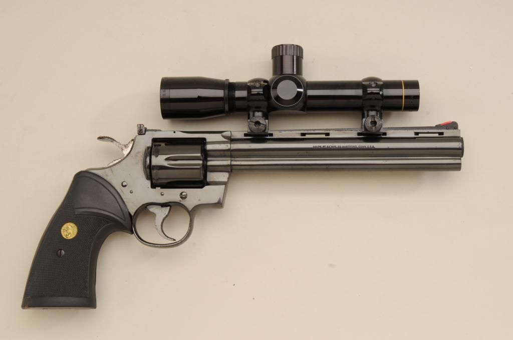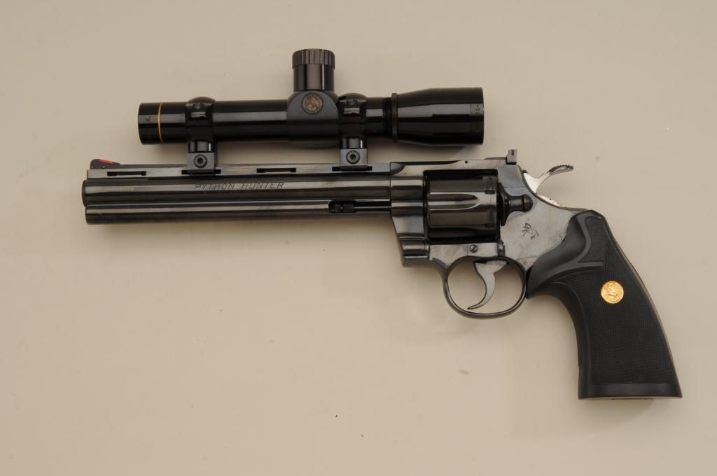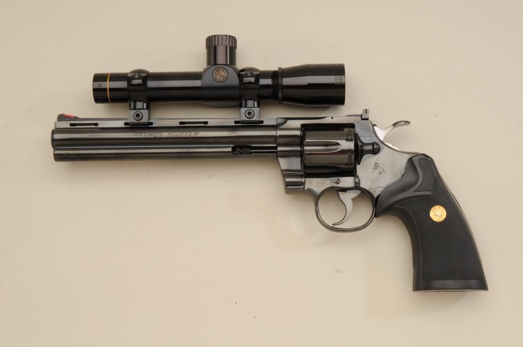 Colt Python Hunter DA revolver, .357 Magnum cal., 8” ventilated rib barrel, blue finish, Pachmayr checkered combat hard rubber grips with Colt medallions, #VA4074 mounted with a Colt Leupold M8-2X Extended E.R. scope withfine optics and housed in a metal carry case with instructions, cleaning kit and bullet case gard. This gun is in overall fine to excellent condition showing approx. 98% original finish, fine bore, action, markingsand grips; interior padding of case is deteriorating somewhat. A big Python with a great scope! Est.: $1,500-$3,000.