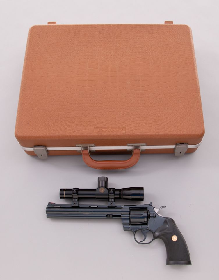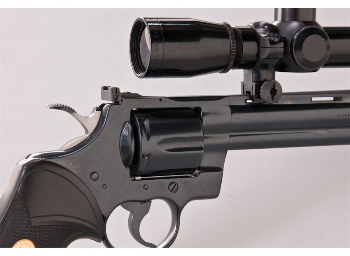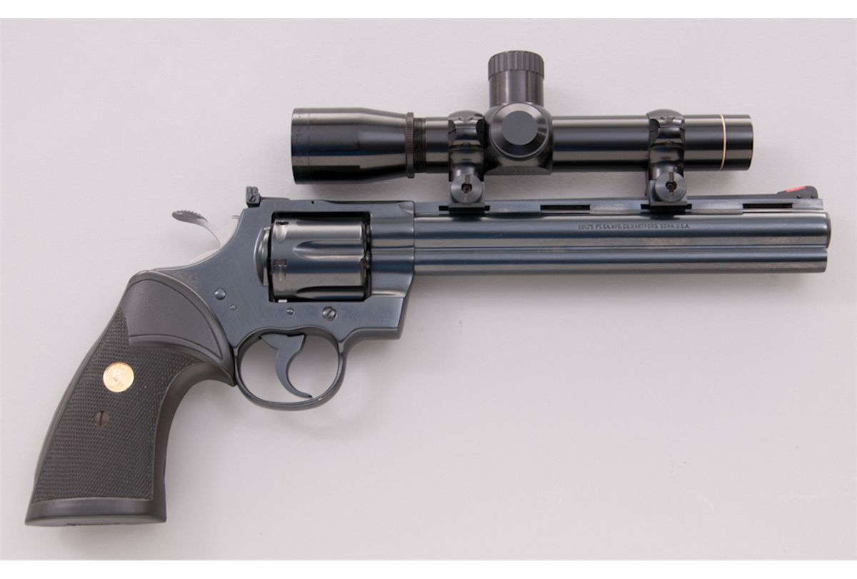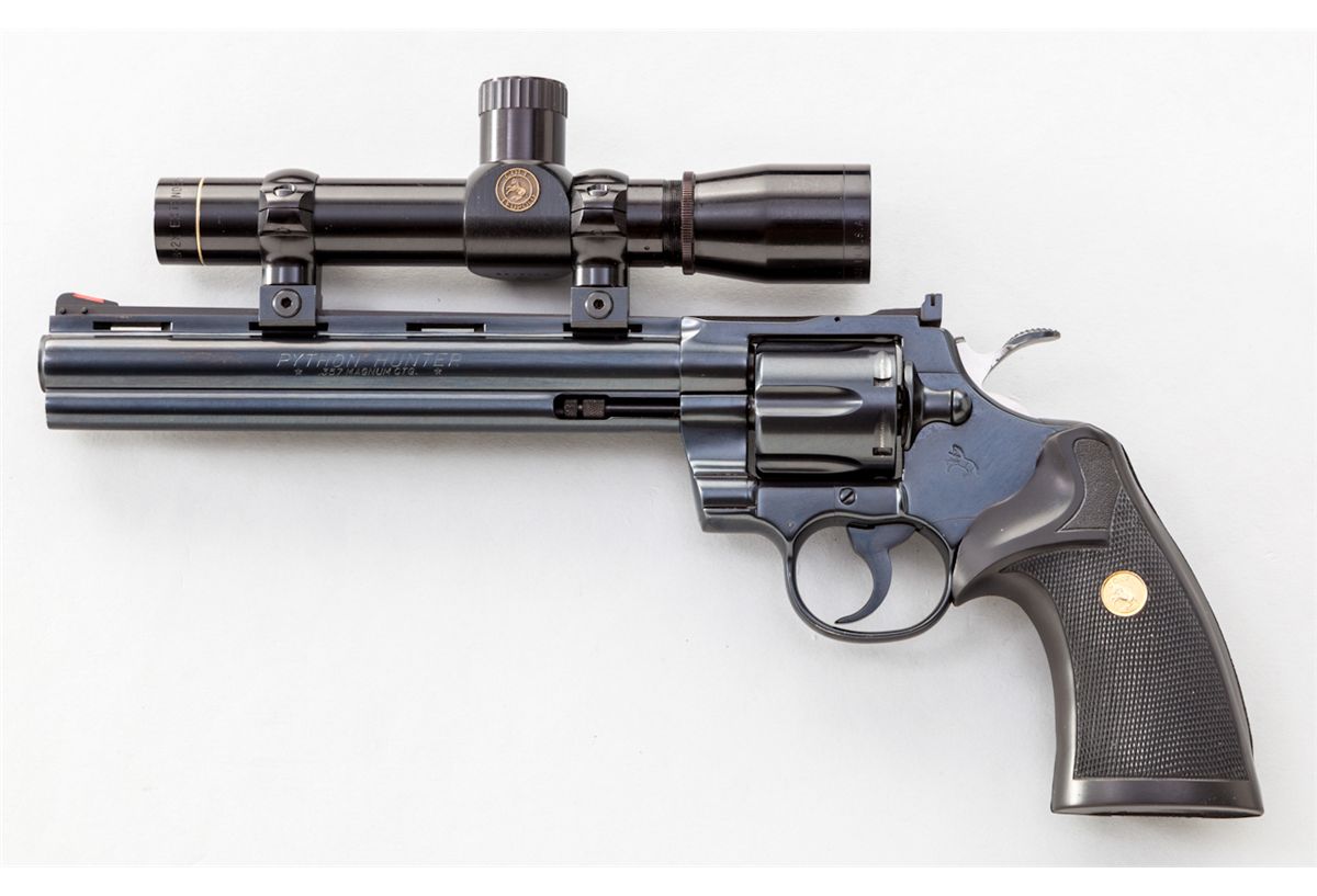 Colt Python ''Hunter'' Double Action Revolver, #K25035, .357 mag. cal., 8'' vent rib barrel, royal blue finish, standard adjustable rear and red ramp front sights, gold medallion Pachmayr grips, with Colt/Leupold M8-2x extended eye-relief scope. Mfg'd in 1981 only. Condition is excellent, appearing virtually new, with only the lightest wear at muzzle (near imperceptible, as is index line). Grips appears new, action is silky smooth, bore is bright, scope optics are clear. Est.: $1,800-$2,400. (Modern)