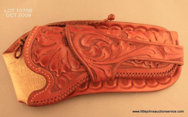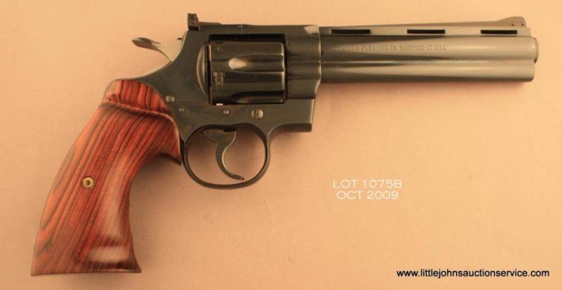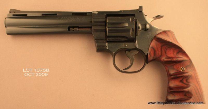 Colt Python Model DA revolver, .357 Magnum cal., 6” barrel, blue finish, custom hardwood grips (with original medallion checkered wood grips included), #7059. This gun is in overall fine condition showing approx. 98% + original finish,fine bore, action, markings and custom finger grooved grips. Accompanied by George Lawrence heavy tooled leather “jock strap” holster. Est.: $600-$1,200.
