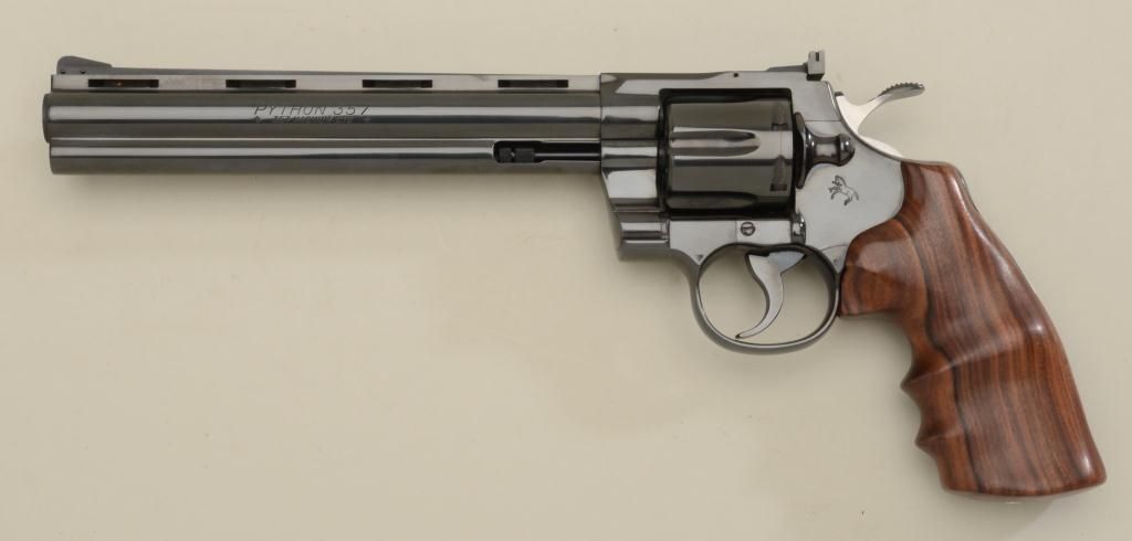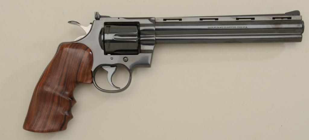 Colt Python Model DA revolver, .357 Magnum cal., 8” ventilated rib barrel, blue finish, deluxe custom hardwood grips and an extra pair of deluxe finger groove wood medallion grips, #LA6126. This gun is in overallexcellent condition showing the majority of its original finish, fine bore, crisp action, sharp markings and beautiful after-market custom finger grooved grips along with a second pair of Colt medallion grips. Est.:$1,100-$1,800.