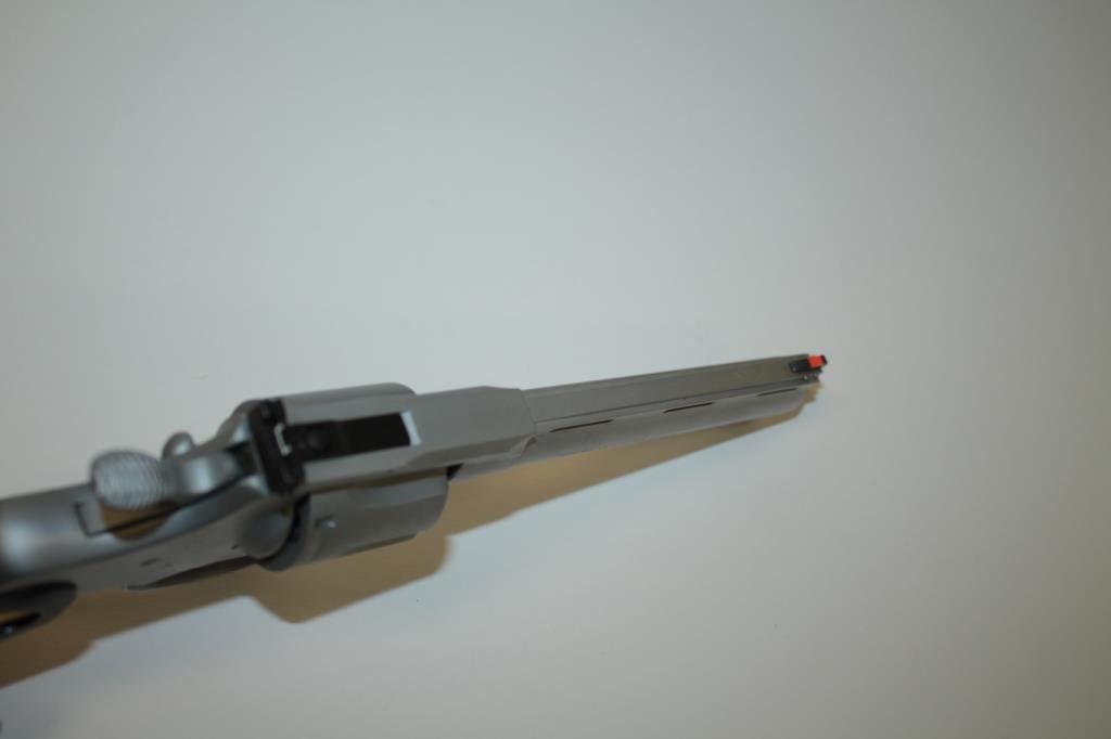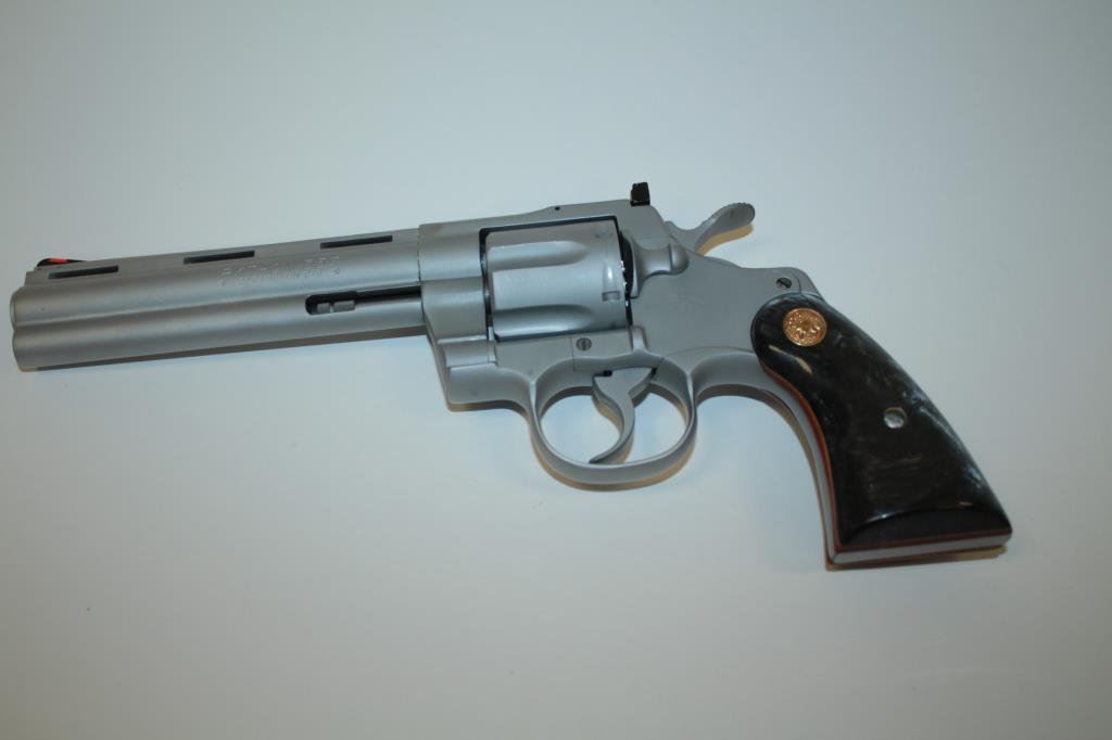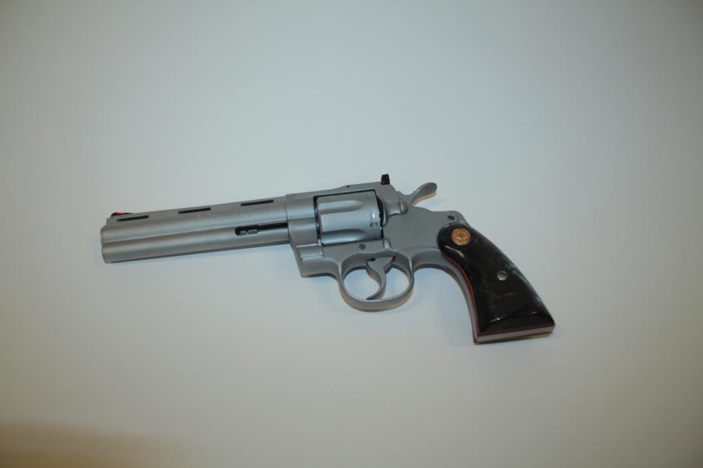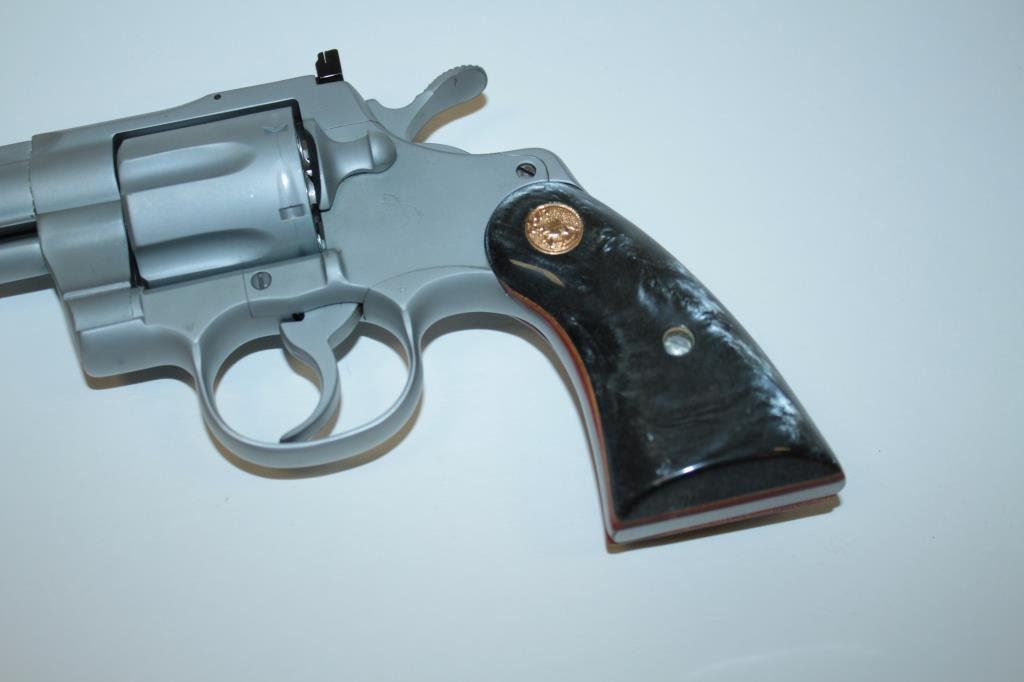 rib barrel, satin nickel finish, simulated black pearl medallion grips, S/N V26079, in overall excellent condition little handling; in factory wood grain cardboard box with inserts and instructions. (Modern/PPT). Est.: $3,000-$6,000.
