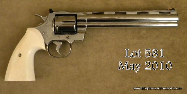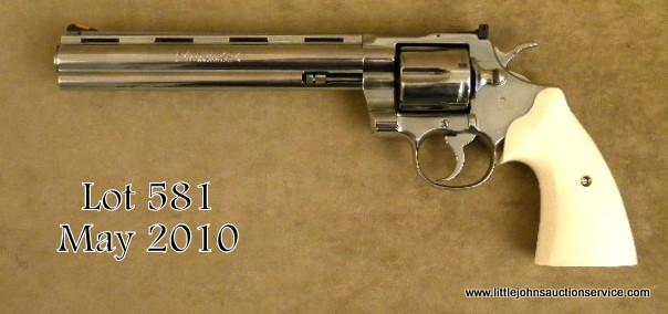 Colt Python Model DA revolver, .357 cal., 8” ventilated rib barrel, polished stainless steel finish, combat smooth ivory grips, #PY2589. This gun is in overall excellent condition showing the classic lines of the 8” Python; excellent bore,crisp action, sharp markings and beautiful large combat style ivory grips with excellent graining; also accompanied with a pair of Colt medallion black hard rubber combat grips. Est.: $1,000-$1,800.