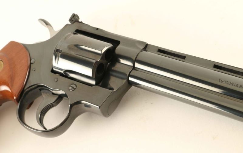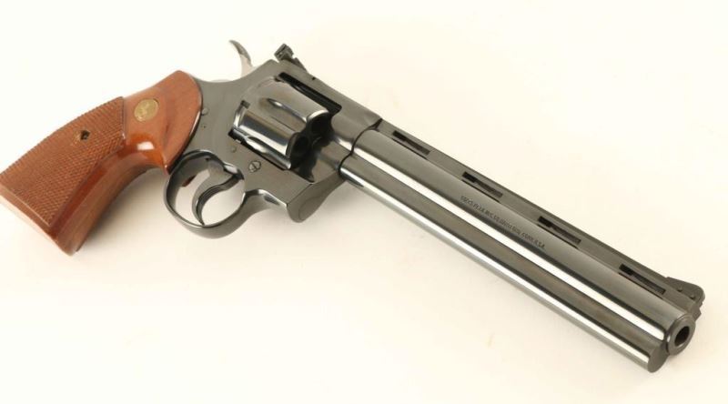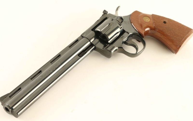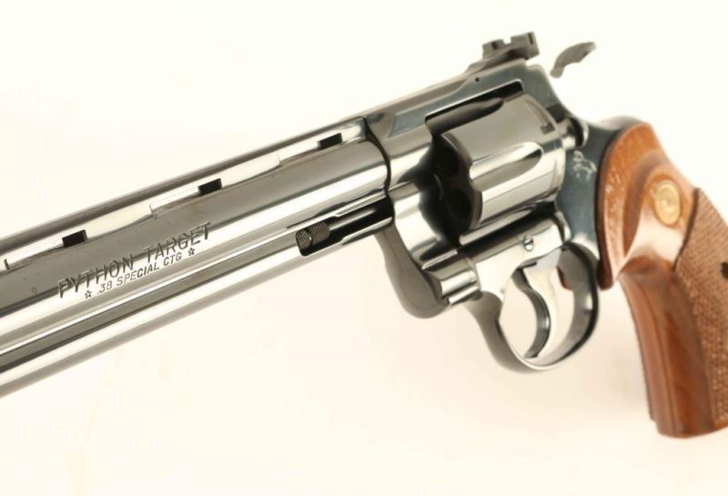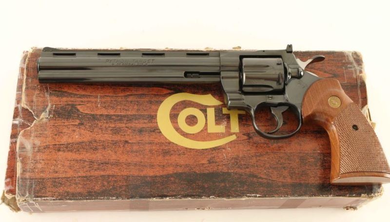 Desirable large frame double action revolver chambered in .38 Special, circa 1980. Features a Royal Blue finish, 8" vent rib barrel with full underlug, pinned ramp front sight, adjustable rear sight, fluted six-shot cylinder, serrated trigger, knurled wide hammer spur, and two-piece checkered walnut grips with gold Colt Medallions. Includes the original factory wood grain cardboard box with styrofoam inserts. Revolver retains approximately 99% of its original finish showing a light drag line on the cylinder and a few scattered scratches. Action is very smooth with solid lock-up, bore is pristine and the wood grips are fine. Condition is NRA Excellent in box. ***Modern Firearm***