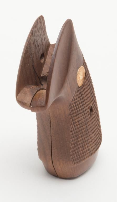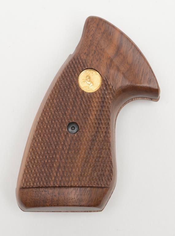 Colt Python checkered wood medallion grips in fine condition as modified. Est.: $100-$200.
