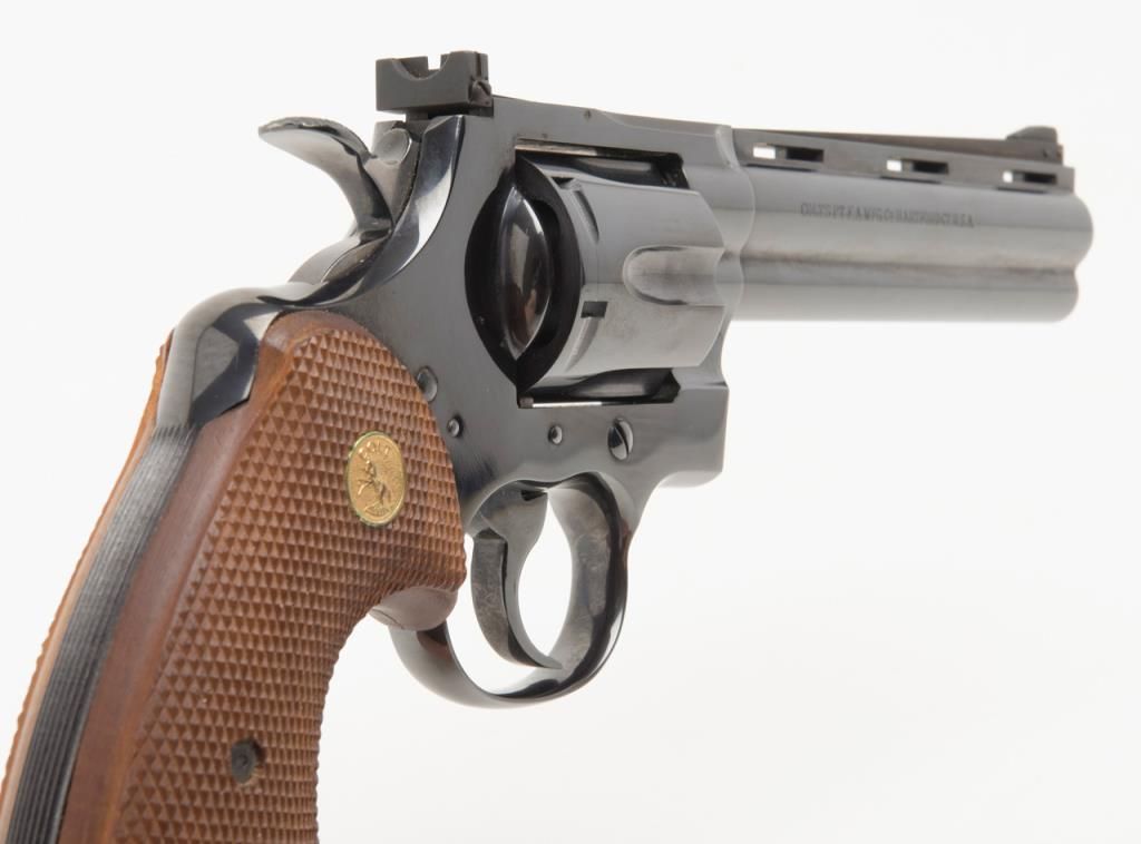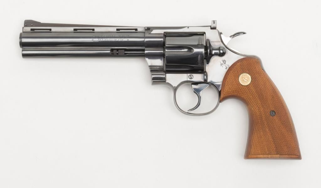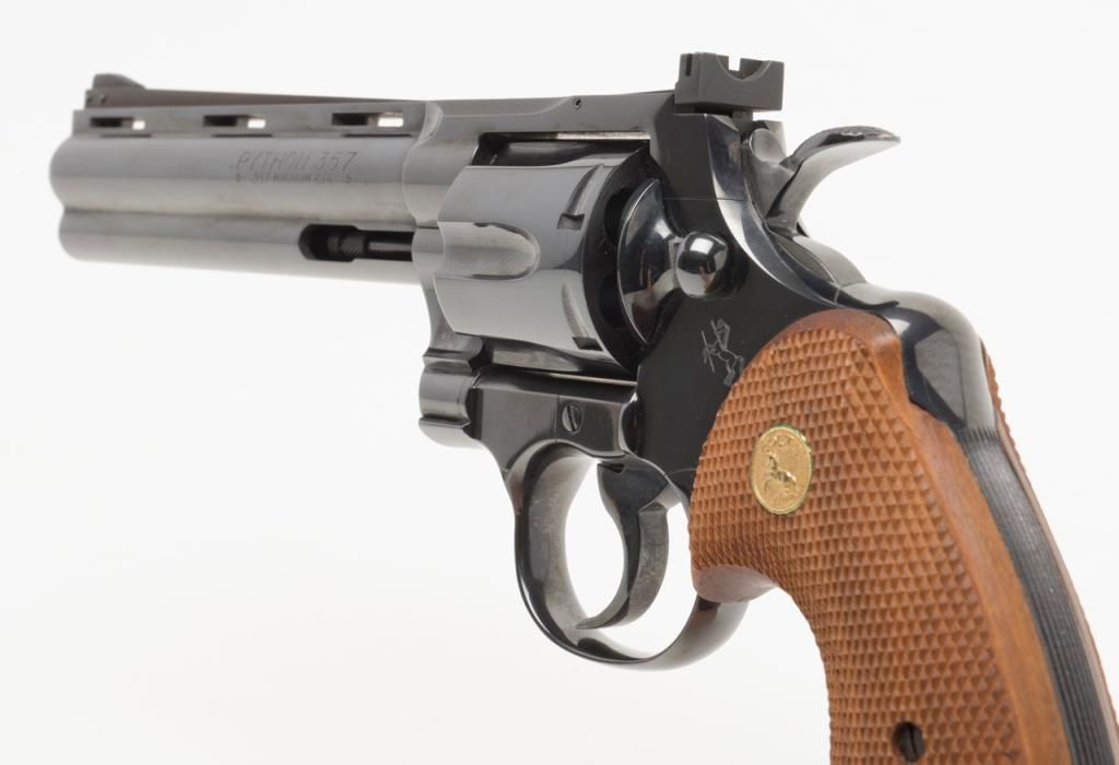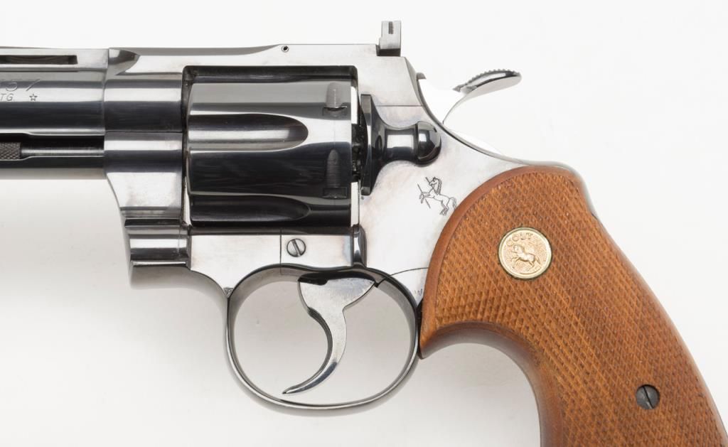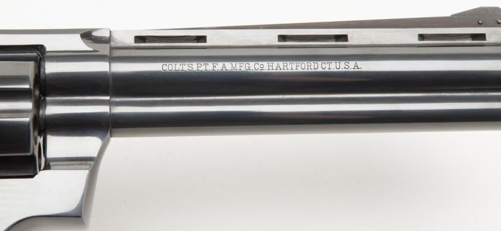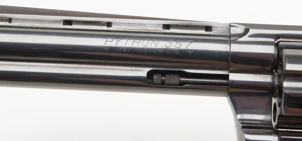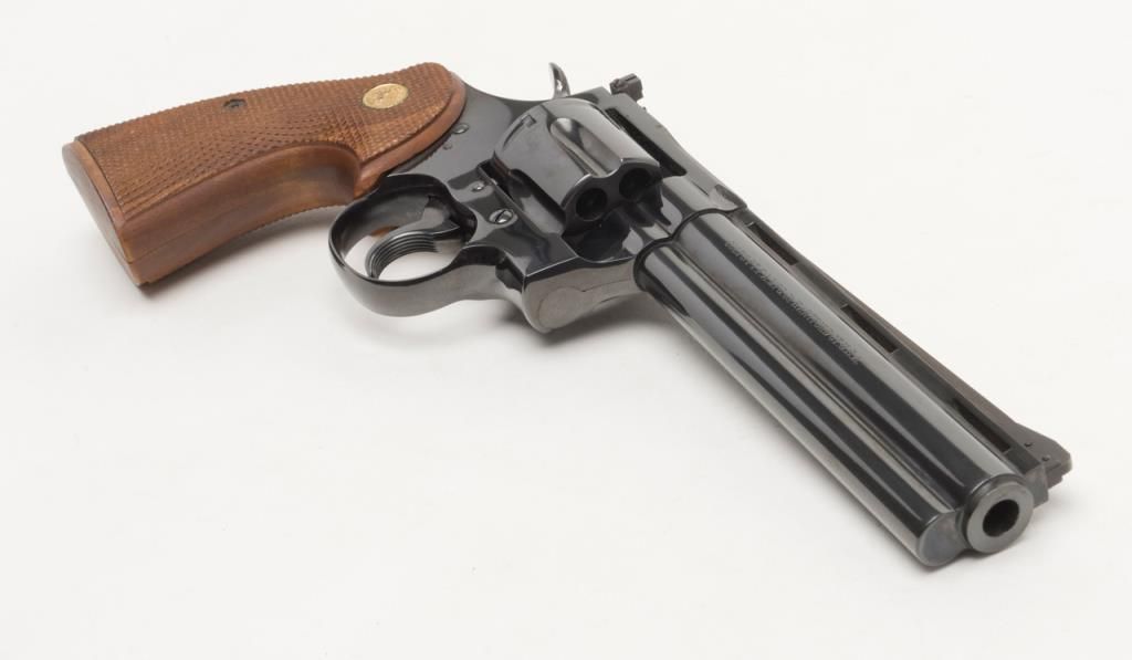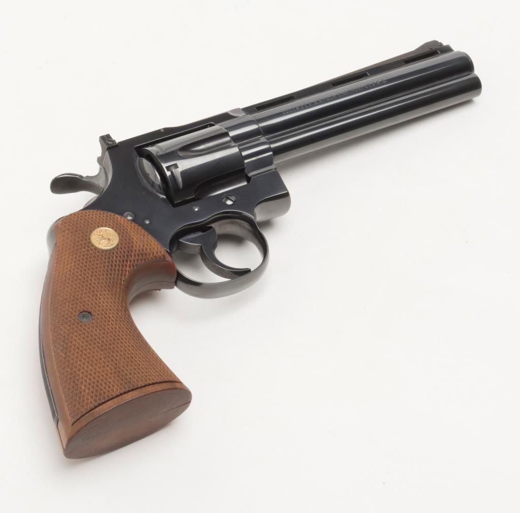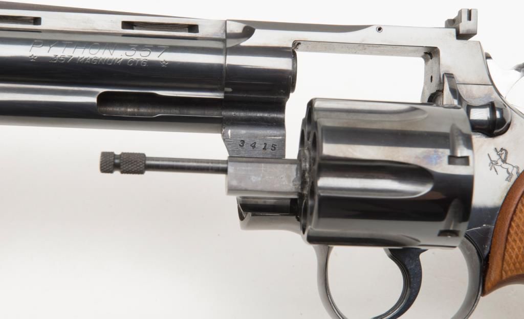 Colt Python double action, .357 Magnum caliber revolver with factory 6” barrel and checkered medallion grips remaining in fine to near excellent condition, serial number 3415 with no prefix or suffix and number 7 assembly numberbeneath the serial number. This revolver remains in fine to near excellent condition showing 96%-98% bright original blue with some minor evidence of firing on the front of the cylinder and a very slight index line between the cylinderstops. Very sharp and crisp including near fine grips. The interior is excellent. The action is working but gummy from dried oil and needs a thorough cleaning. Shows high quality early polish in the original finish. No California Sale. Est.: $1000-$2000
