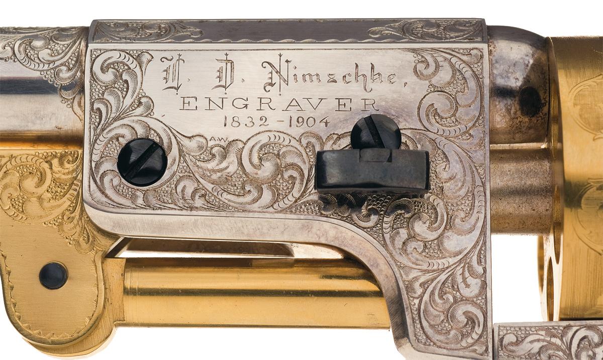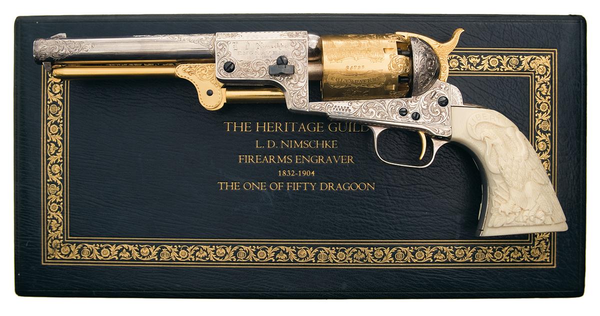 This exceptional gold and silver engraved Dragoon revolver is one of reportedly 50 produced by the Heritage Guild to commemorate the renowned American Master Engraver L.D. Nimschke. The 50 revolvers were manufactured "in the white" by Colt and finished by The Heritage Guild. Alvin White was the designer of the engraving on these revolvers and his firm "American Master Engravers" was commissioned to produce these revolvers exclusively for the Heritage Guild. In 1985 and 1986. The frame, barrel, trigger guard and backstrap are silver plated, the hammer, trigger, cylinder and ramrod assembly are gold plated, and the screws and wedge have a bright blue finish. The barrel, frame, trigger guard bow and backstrap are engraved in Nimschke style floral scroll with a punch dot background. The sides of the hammer have a wolf head motif. The left side of the barrel lug is engraved "L. D. Nimschke / ENGRAVER / 1832 - 1904" and signed "A.W" below that. The revolver has the standard barrel address, left side frame patent marking and Texas Ranger/Indian cylinder scene and marking. The revolver is fitted with a one piece ivory grip with high relief hand carved American eagle on each side. Complete in a handmade leather fitted Heritage Guild presentation case.
