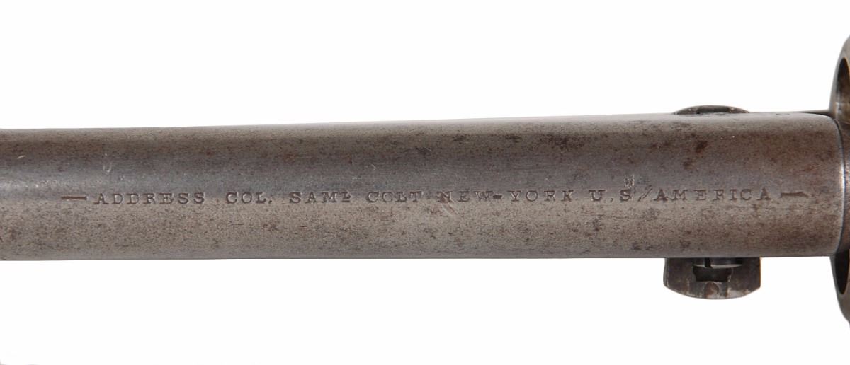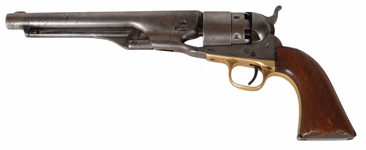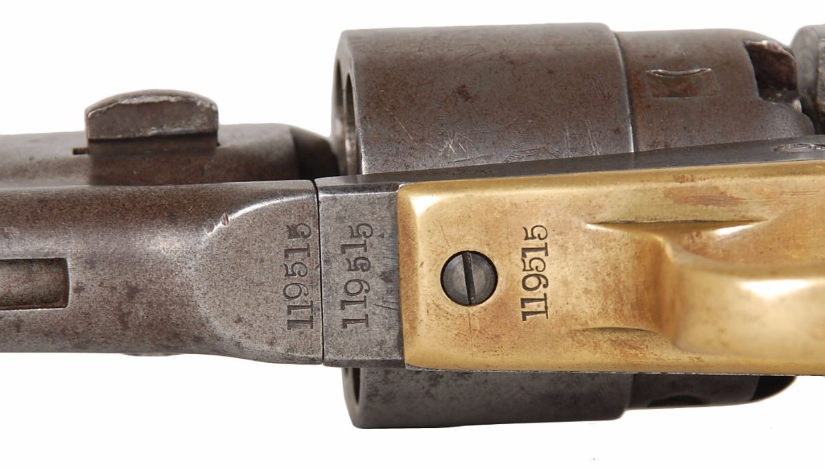 Civil War–era Colt Revolver Model 1860, serial number 119515, .44 caliber, 7.5? barrel with a fine, bright bore that has some mild freckling within the grooves towards the muzzle. This is an 1863 manufactured revolver that has mostly matching numbers, including the wedge (although the arbor has been renumbered to match). The metal has a fairly uniform, mottled pewter gray patina with mild freckling. The frame and lever have the same gray patina, and the cylinder retains about 40–50% of the original naval battle scene. There is minor freckling and pinprick pitting on the sides of the hammer, and numerous small peen marks on the right side of the barrel breech surrounding the wedge. The backstrap has a darker, more mottled gray patina, and the triggerguard has an overall pale yellow-ochre color throughout with some spots of ruddy tarnish forming along the sides. The walnut grip is in good shape with an old, added oil finish over moderate handling marks and surface blemishes, as well as some moderate-heavy wear at the butt. No inspector cartouches are visible on either side. The gun is fairly tight with some rattle, and the mechanism is functional. In good overall condition.