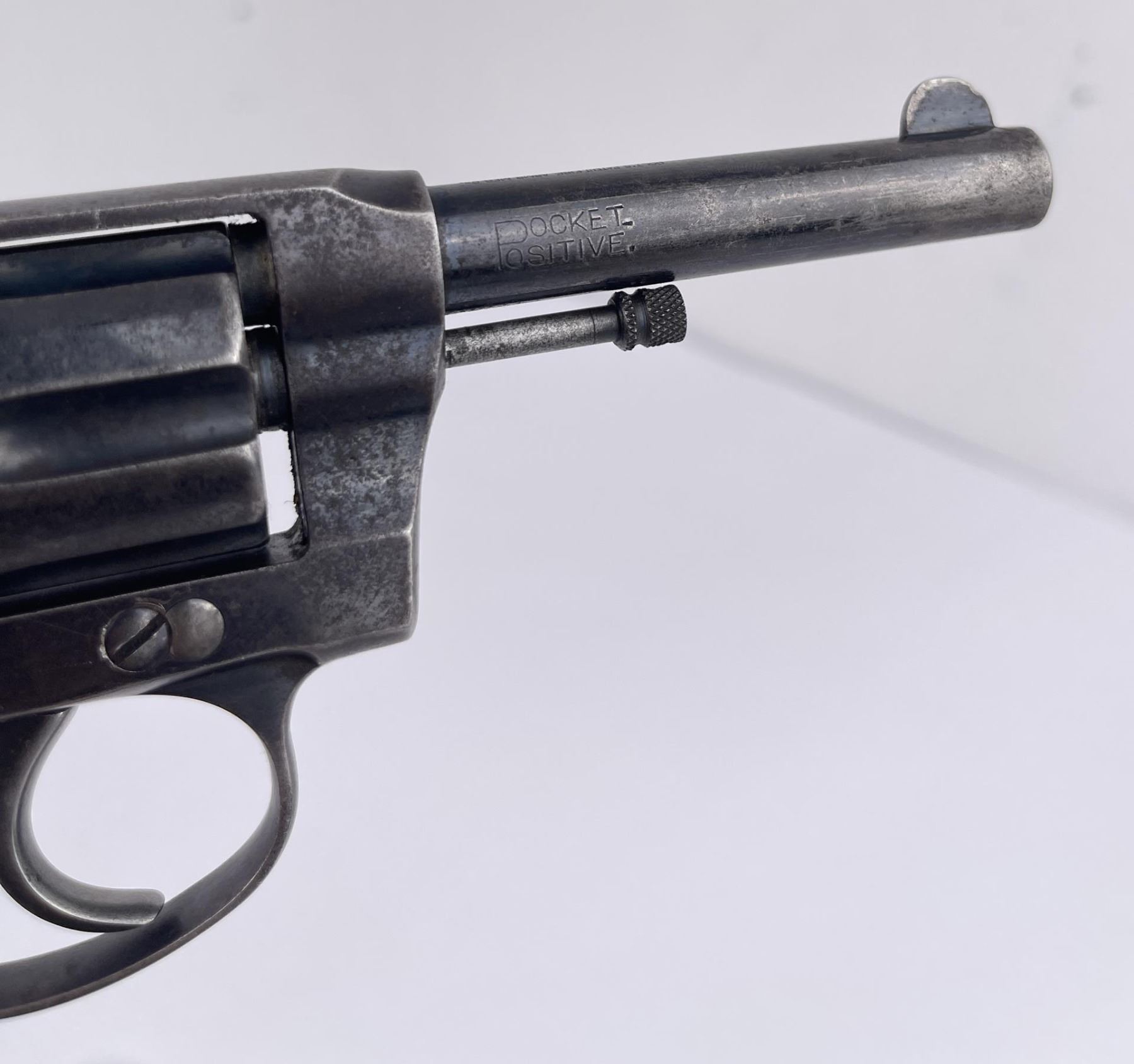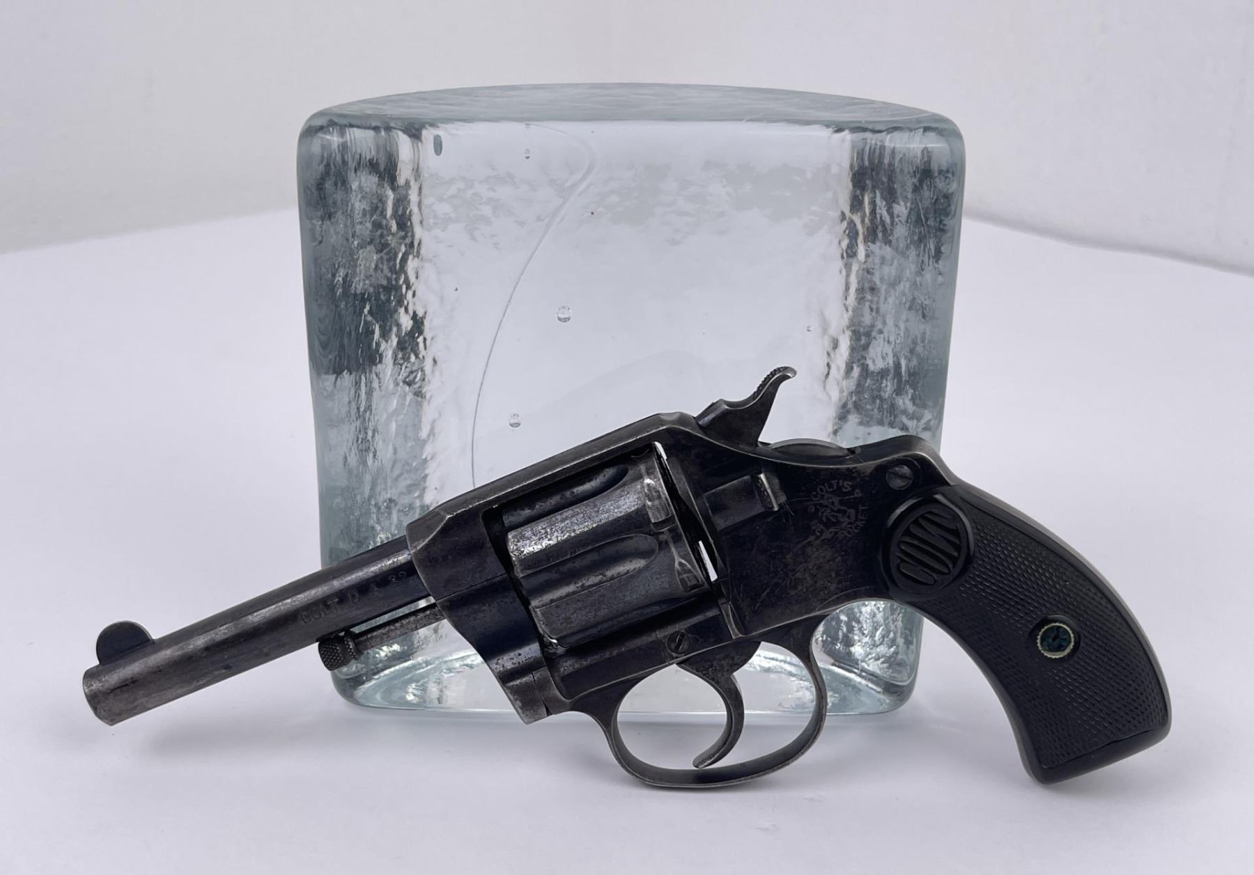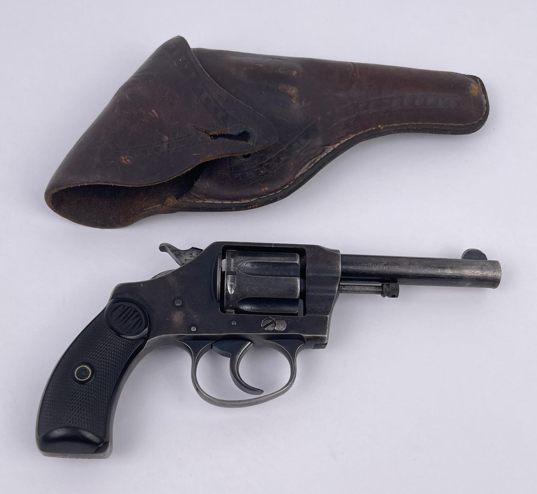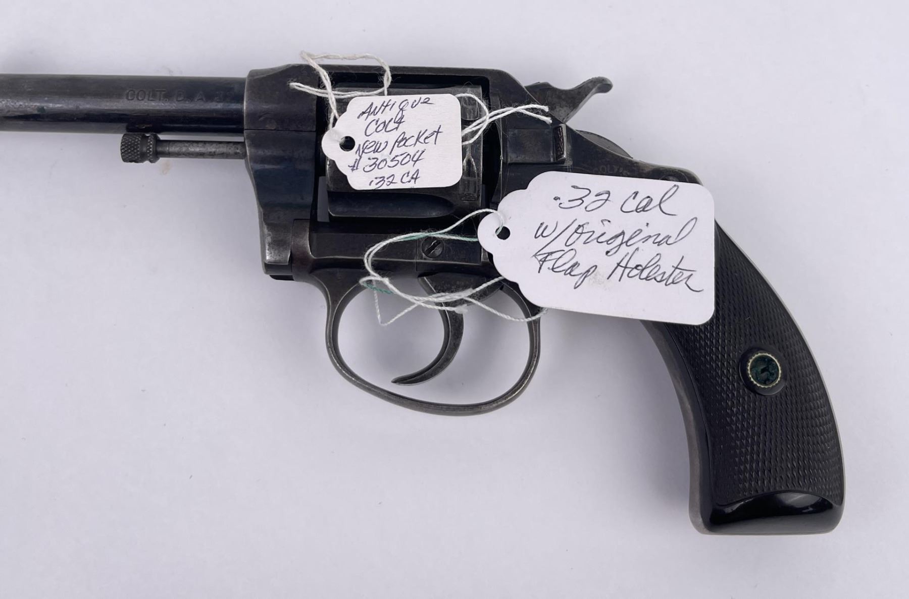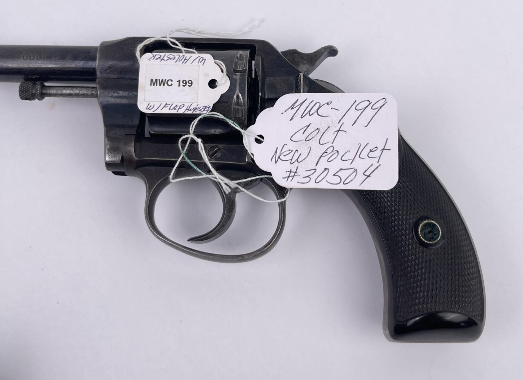 #30504, Cal. 32, Barrel 3 ½". First Swing out Cylinder double action pocket revolver made by Colt. "Colt’s New Pocket” with Rampant Colt stamped left side of frame behind cylinder swing-out latch. Top of barrel stamped “Colt’s Patent Firearms MFG Co.”, Hartford, Conn. U.S.A. Pat’d 1884, 1900, 1905. Left side of barrel stamped “Colt D.A. 32”. Original Colt Grips with small chip bottom corner of right side. W/original Flap Holster, Action works. Requires FFL Transfer.