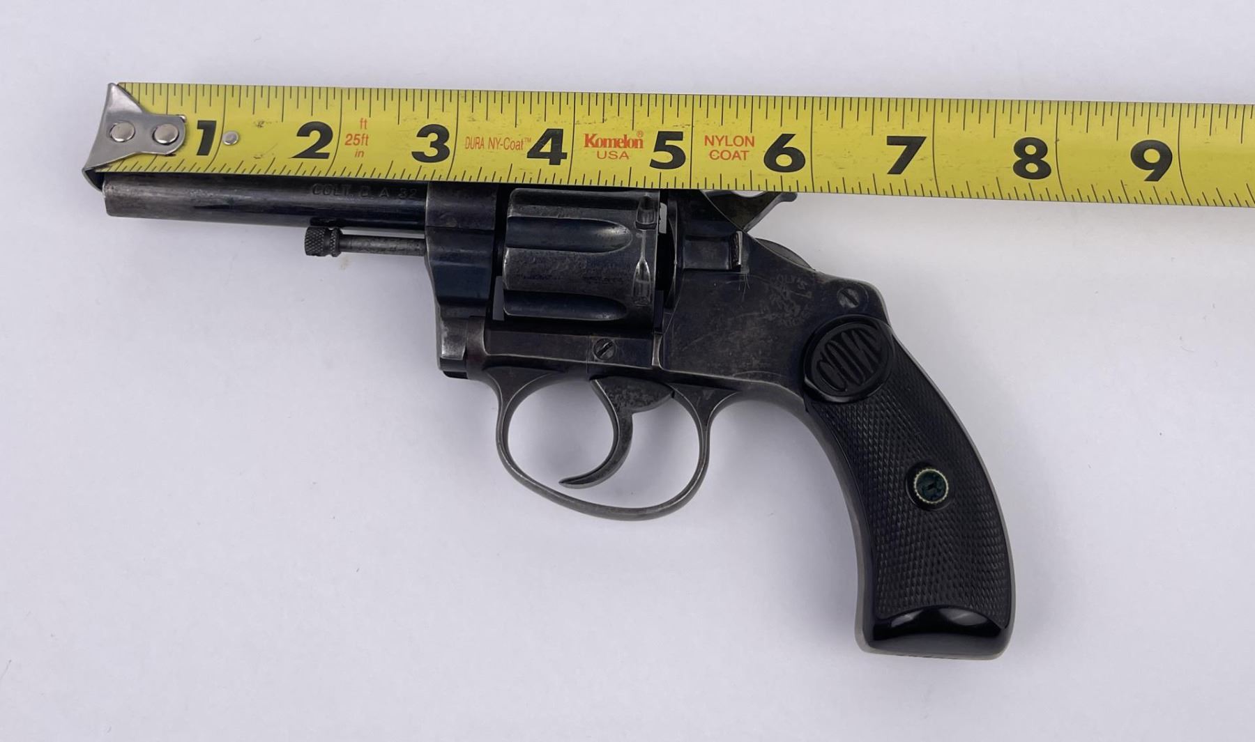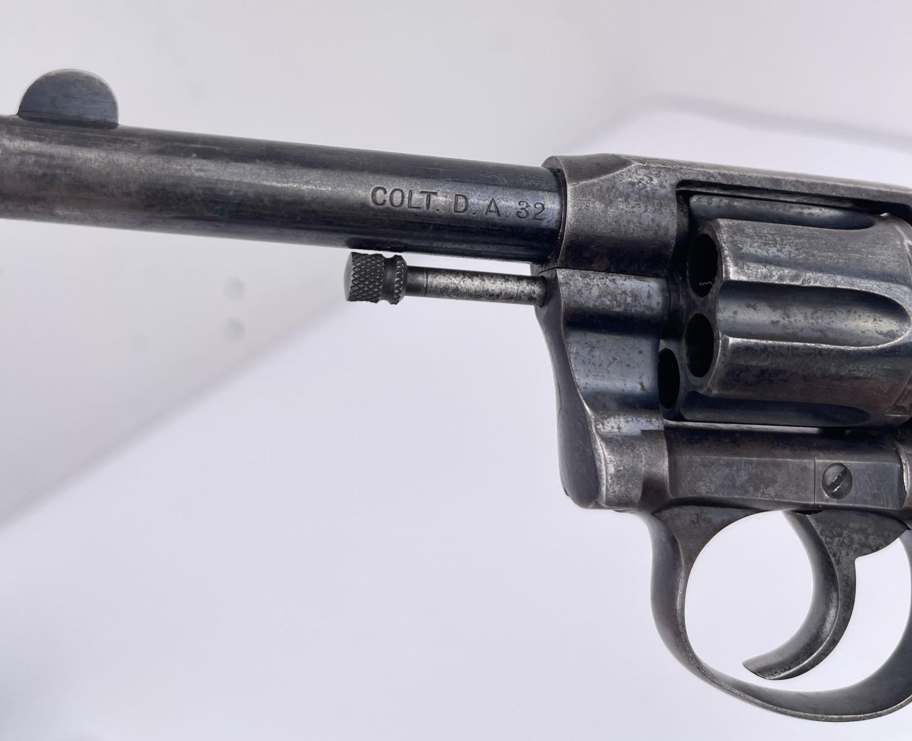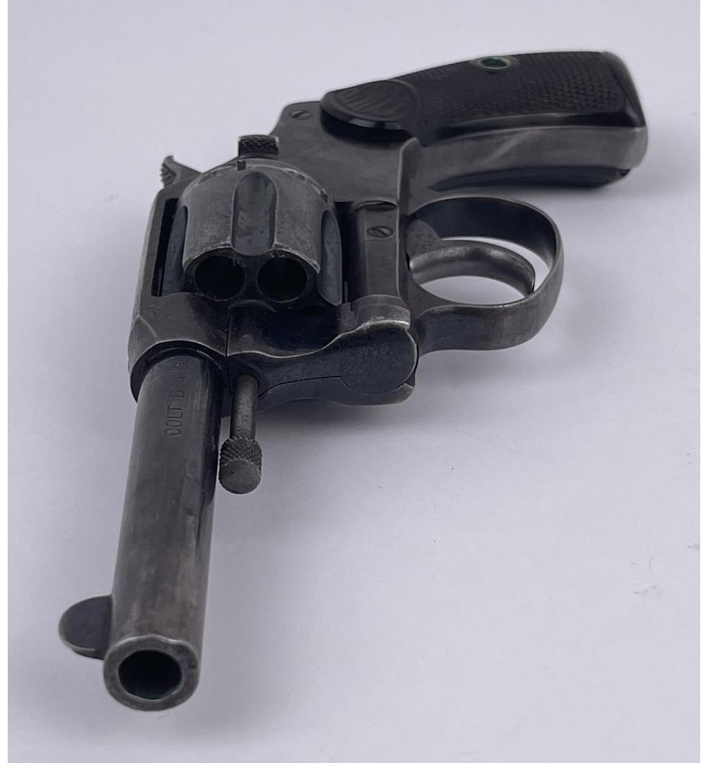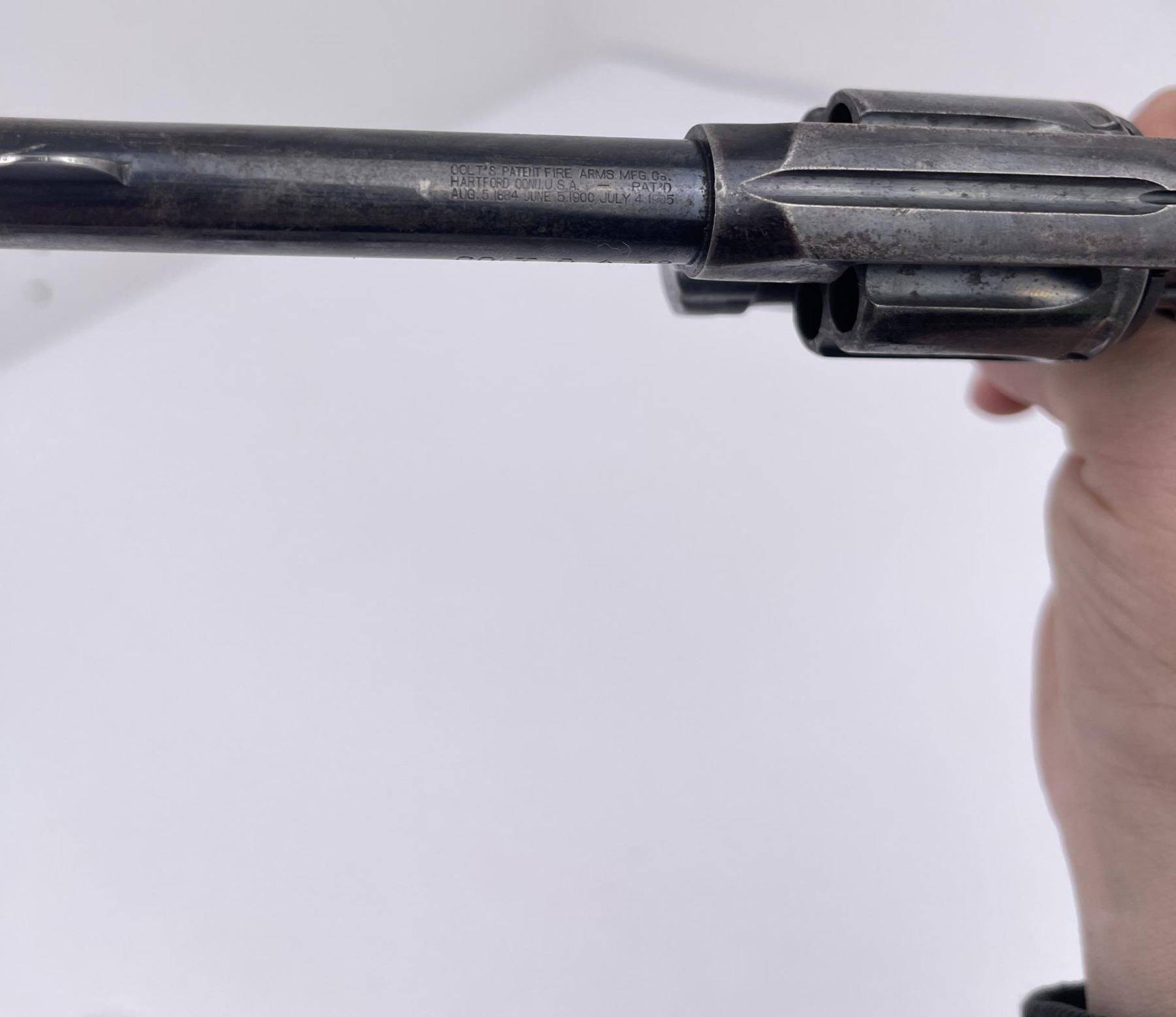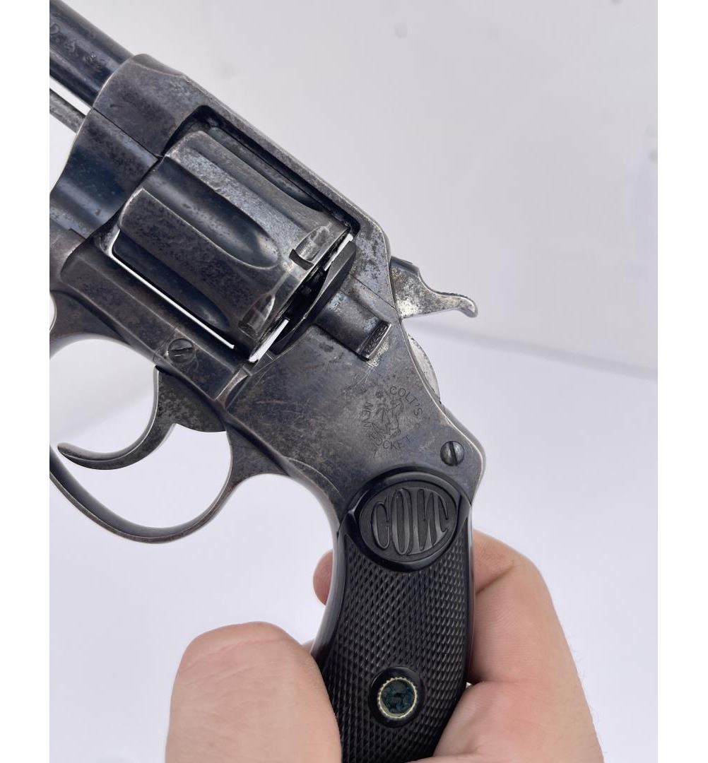 #30504, Cal. 32, Barrel 3 ½". First Swing out Cylinder double action pocket revolver made by Colt. "Colt’s New Pocket” with Rampant Colt stamped left side of frame behind cylinder swing-out latch. Top of barrel stamped “Colt’s Patent Firearms MFG Co.”, Hartford, Conn. U.S.A. Pat’d 1884, 1900, 1905. Left side of barrel stamped “Colt D.A. 32”. Original Colt Grips with small chip bottom corner of right side. W/original Flap Holster, Action works. Requires FFL Transfer.