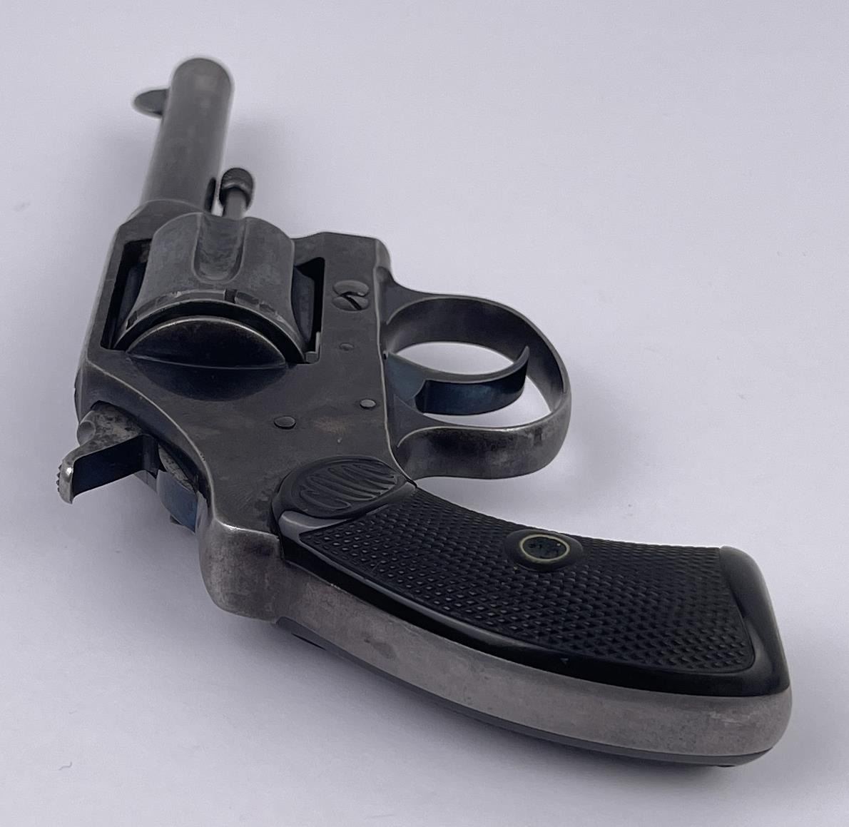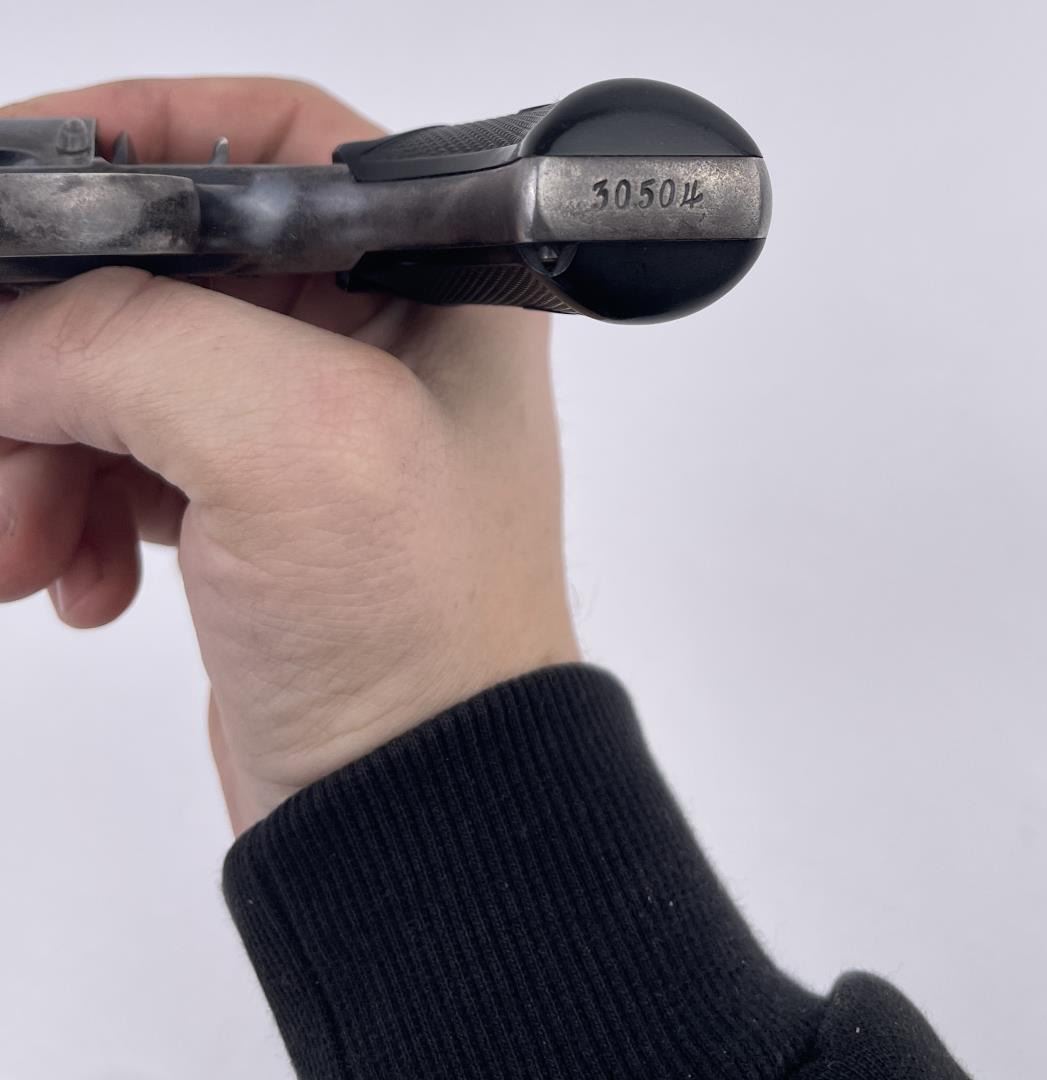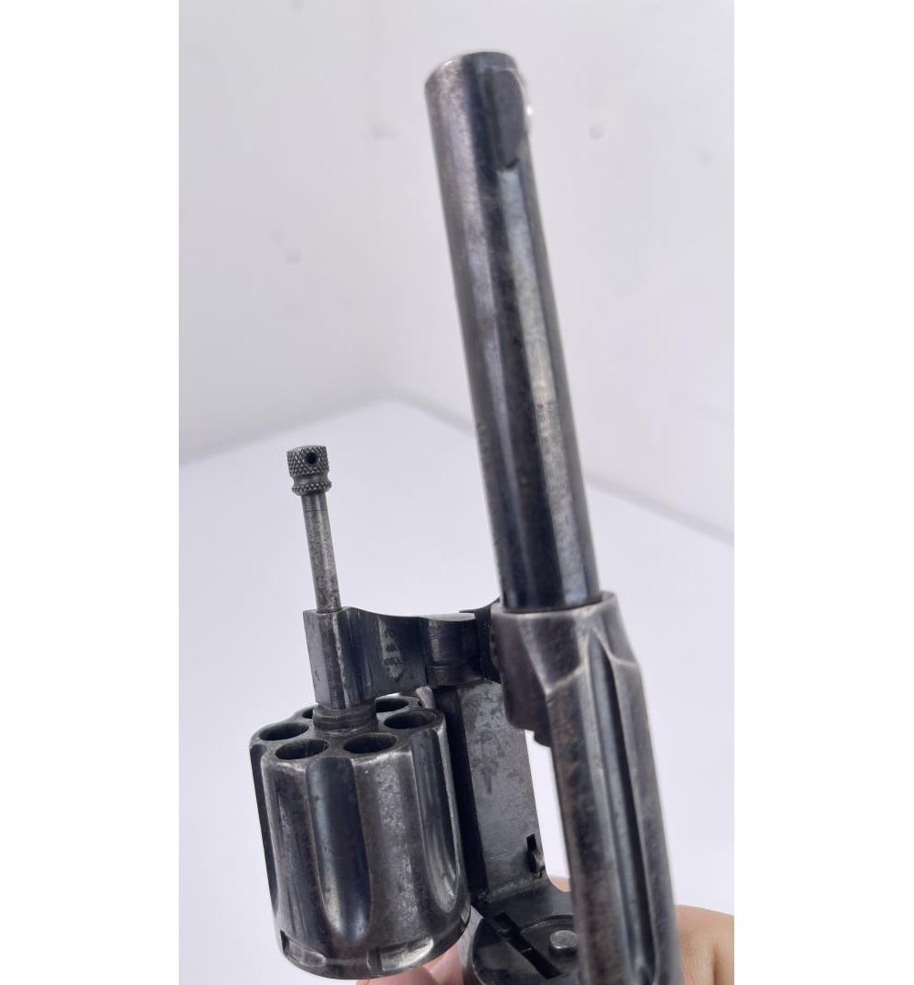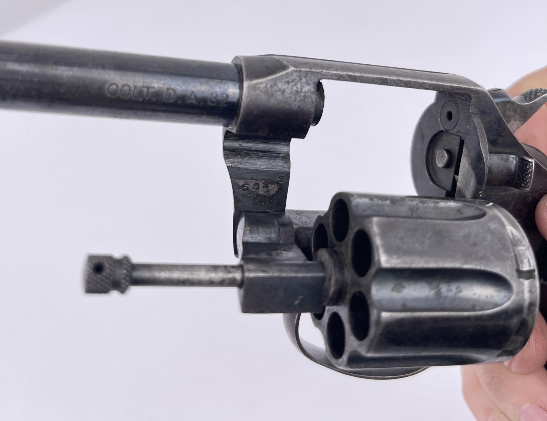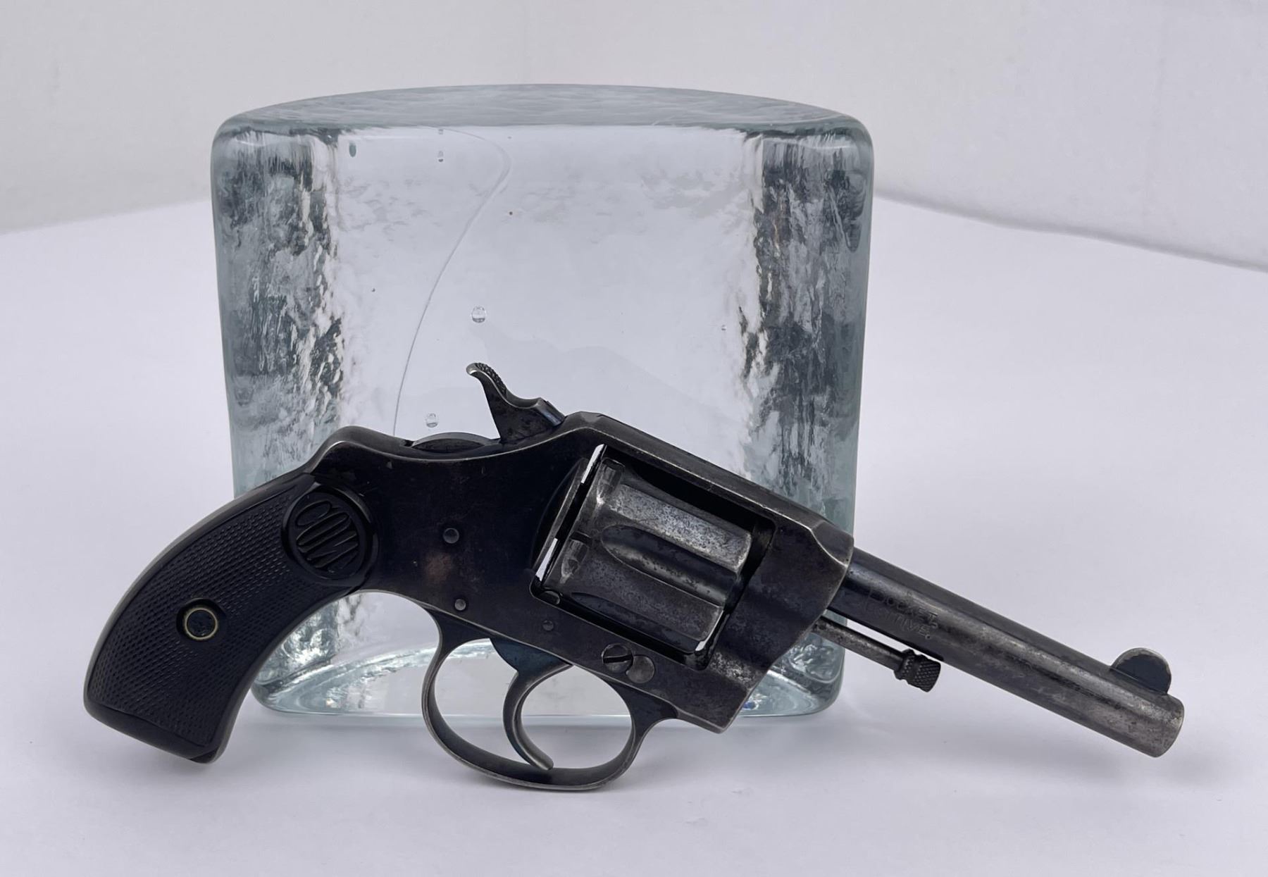 #30504, Cal. 32, Barrel 3 ½". First Swing out Cylinder double action pocket revolver made by Colt. "Colt’s New Pocket” with Rampant Colt stamped left side of frame behind cylinder swing-out latch. Top of barrel stamped “Colt’s Patent Firearms MFG Co.”, Hartford, Conn. U.S.A. Pat’d 1884, 1900, 1905. Left side of barrel stamped “Colt D.A. 32”. Original Colt Grips with small chip bottom corner of right side. W/original Flap Holster, Action works. Requires FFL Transfer.
