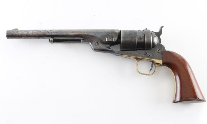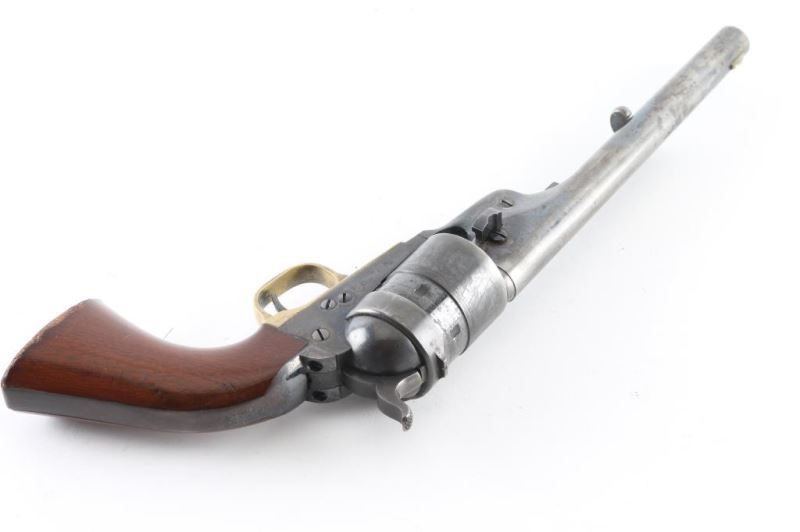 Single action revolver features 8" barrel with fixed sights, brass round trigger guard, 6 shot unfluted rebated cylinder, breech ring mounted firing pin. Bore is good condition overall, bright with strong rifling, some darkness in grooves. Charge holes are smooth with a thin patina color. Retains over 50% blued & case colored finish, mottled along barrel, with edge losses and scratches, darkening case color. Triggerguard shows mellow patina colored brass. Retains 30-50% cylinder scene. Numbers match, markings are crisp. Wood grips are good condition, 85% original finish, the scrapes and finish loss on sharp edge near butt. Appears this revolver has seen little use, and possibly no firing. Condition is NRA Fine *** Antique Firearm ***