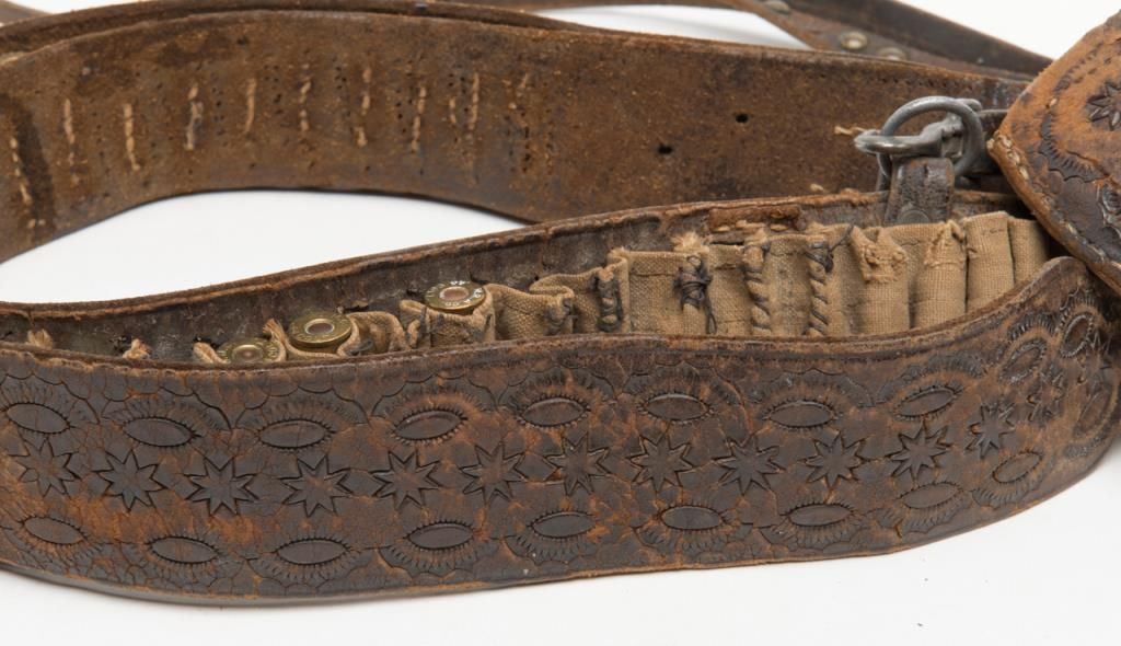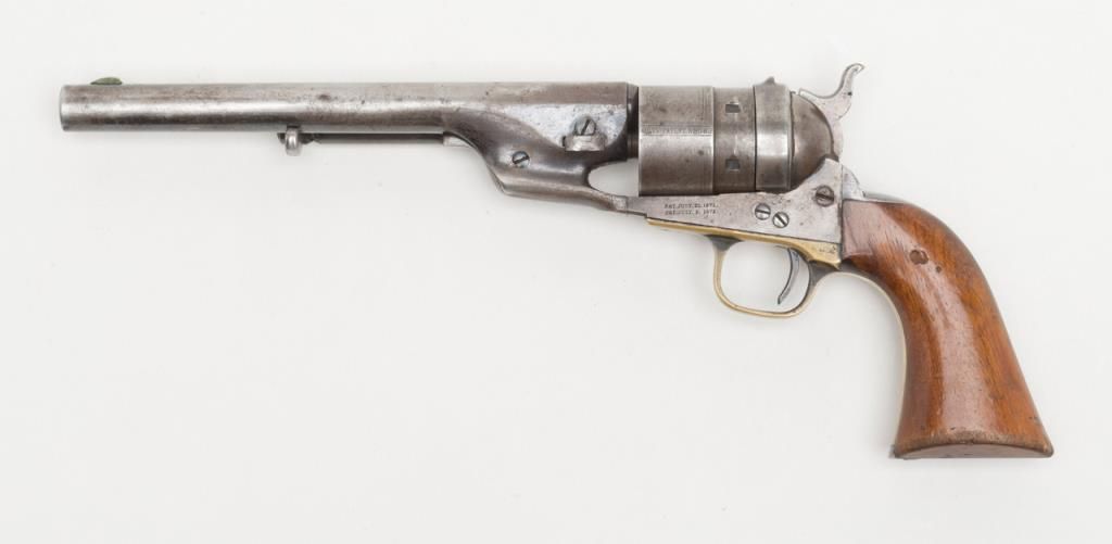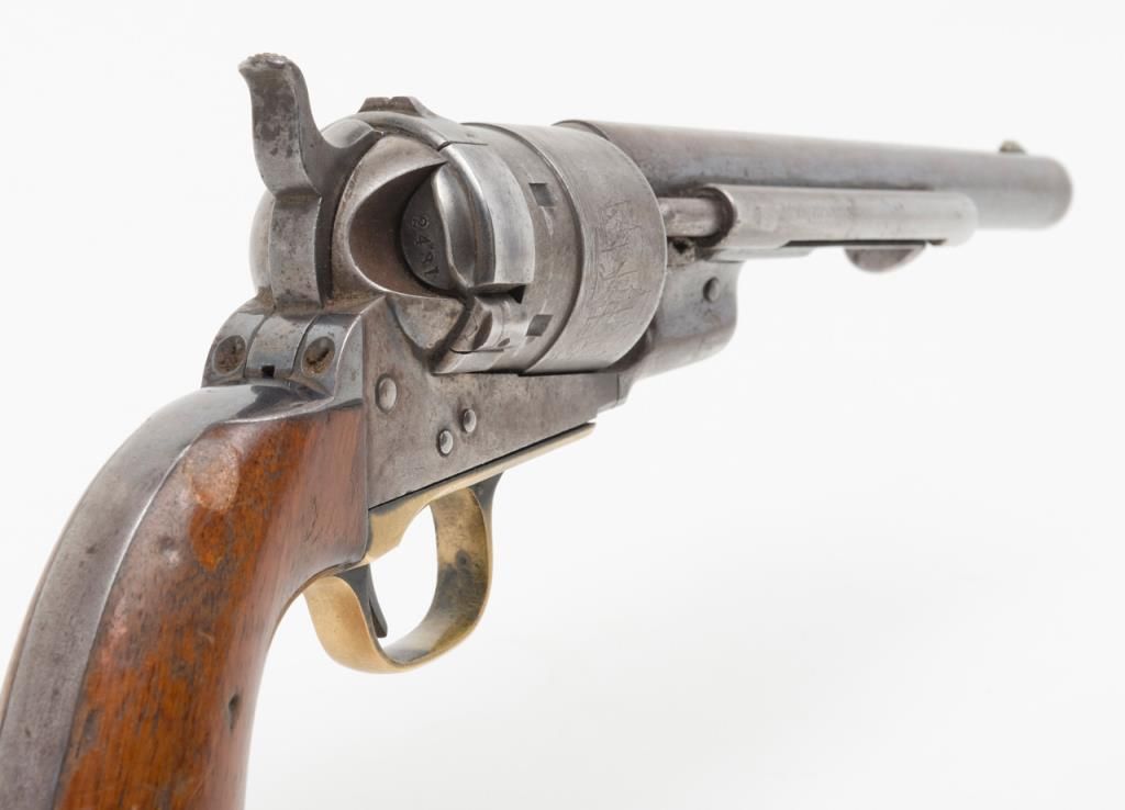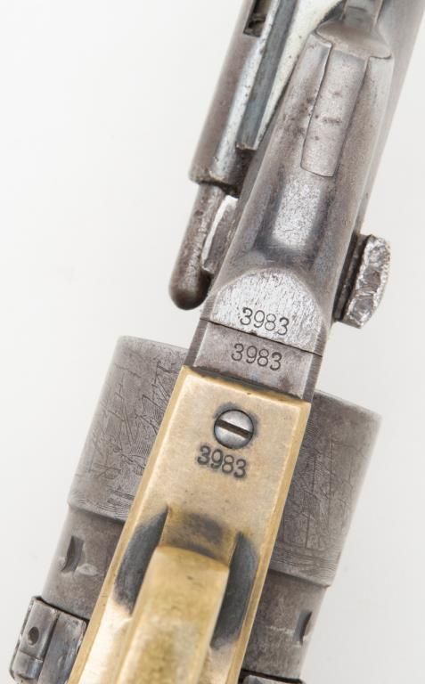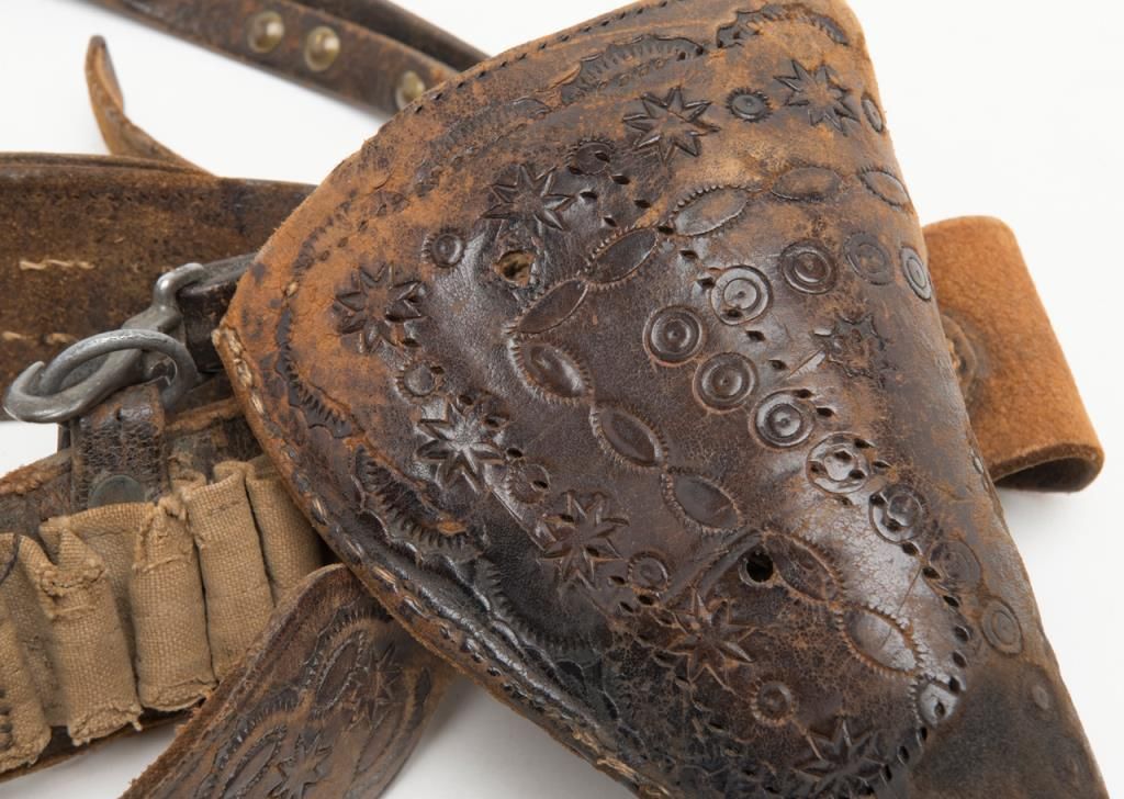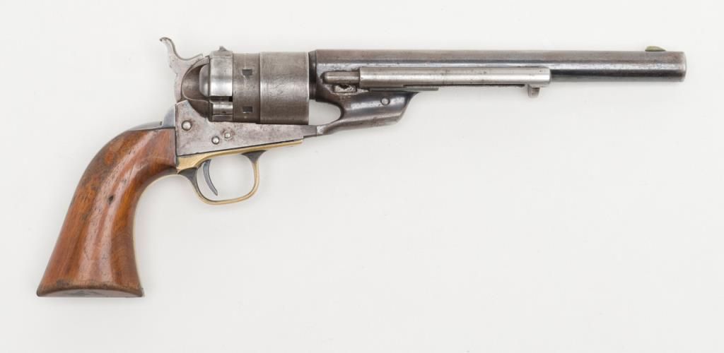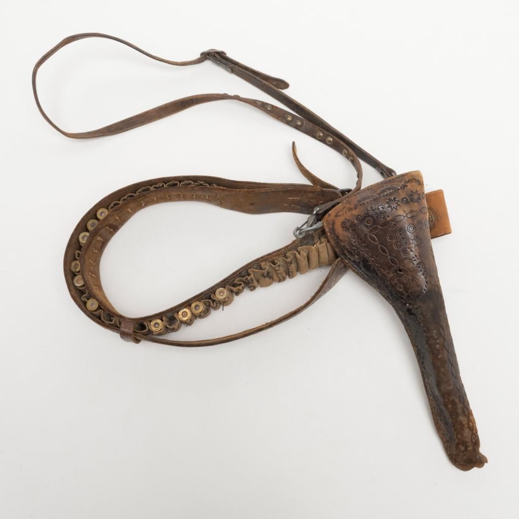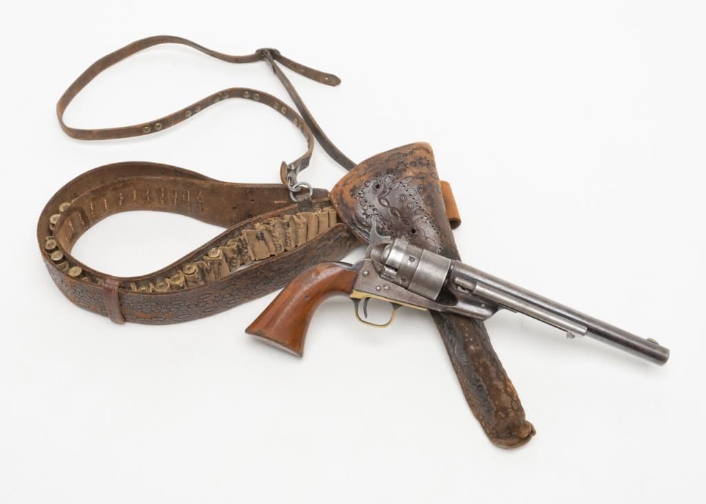 Colt Richards Conversion revolver, .44 cal., 8” barrel, blue and case hardened finish, wood grips, #3983 with period tooled leather holster, belt and shoulder strap, all consigned by the family of the original owner who carried the rig from Iowato the Northwest. The Colt is in overall very good condition with approx. 30% original blue on the barrel and backstrap and traces of original case color on the frame; considerable original cylinder scene, crisp action and markings, verygood grips with some scattered mars from carry and storage. The holster and belt show matching tooling; overall good condition with aging and wear from years of carry. A great looking outfit!! (Antique). Est.: $4,000-$8,000.