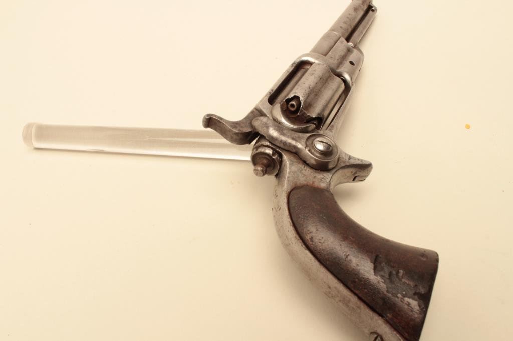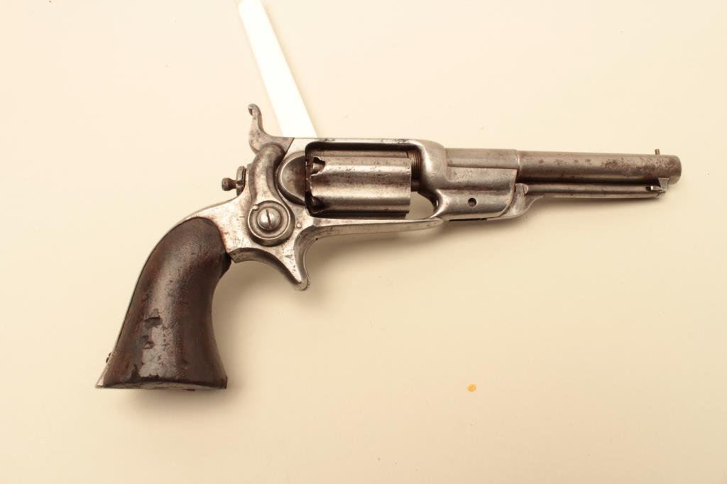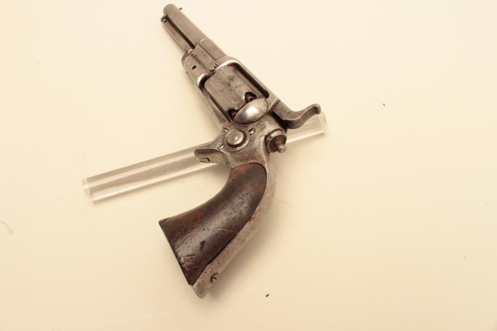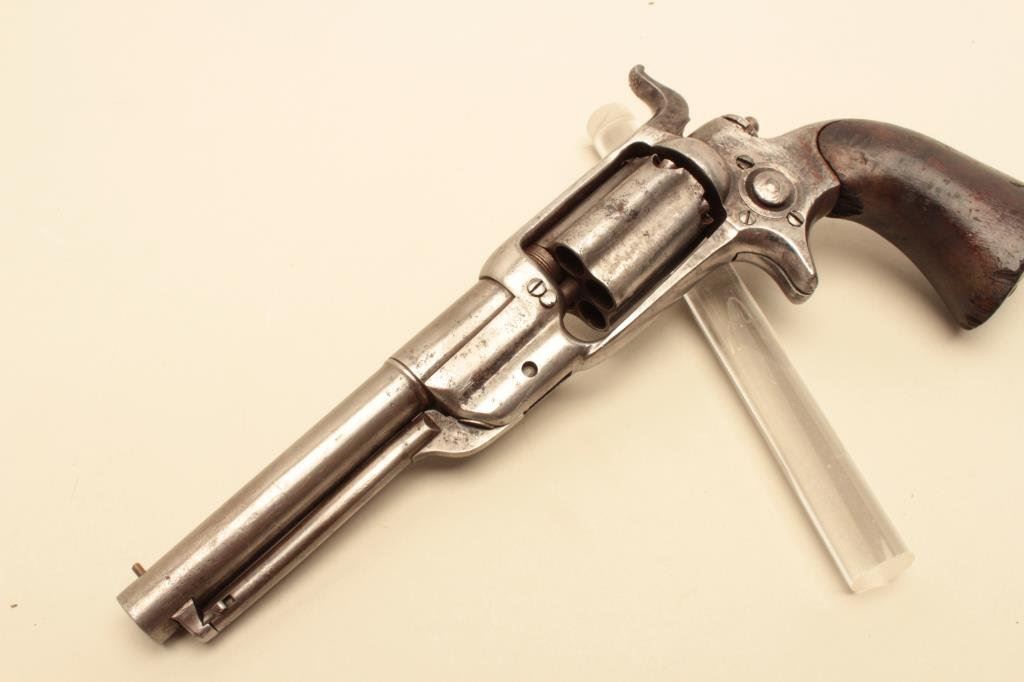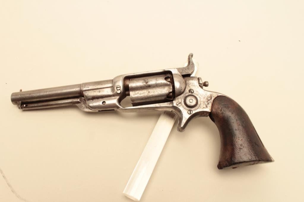 wood grips, S/N 4837, in overall good condition with some scattered spots of erosion on metal surfaces, good action, good barrel address, grips show scattered mars and old edge wear and chips. (Antique). Est.: $500-$1,000.