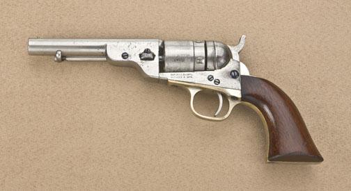 Colt Round Barrel Pocket Navy Conversion with ejector, .38 rimfire cal., 4-1/2” barrel, five shot, nickel finish, wood grips, #9765. This gun is in overall excellent condition showing approx.95% + frosted original nickelfinish, approx. 98% cylinder scene remaining, traces of original silver on straps in protected areas; crisp action, fair + bore with some scattered pitting; all matching visible serial numbers except cylinder whichappears to be a factory error (9785) as the cylinder is matched perfectly in condition with the balance of this gun; sharp markings, very good grips with some wear and a couple scattered mars from carry and storage. Areally nice Pocket Navy conversion of which approx. 2,000 were manufactured in the early 1870’s. Est.: $2,000-$4,000.