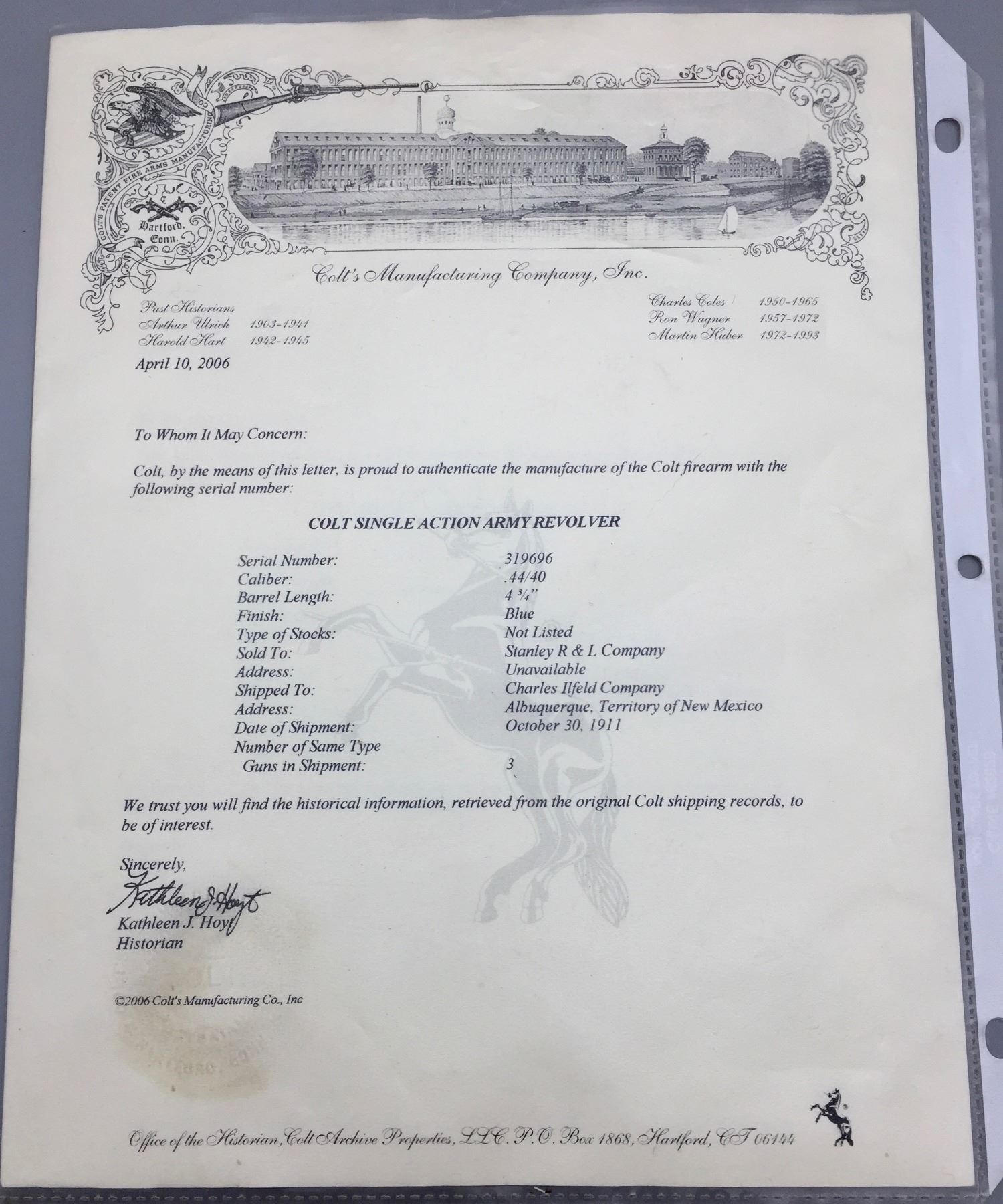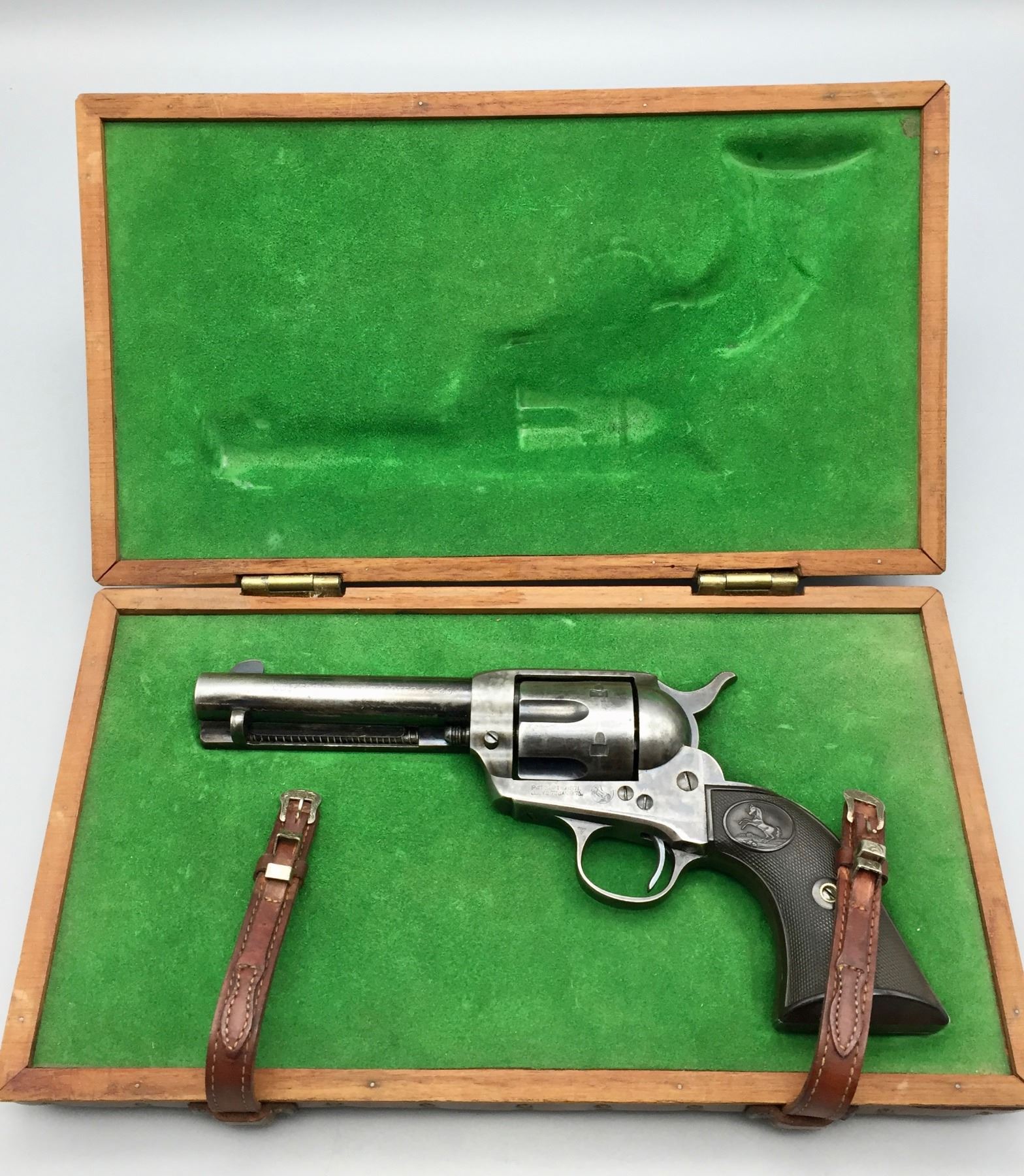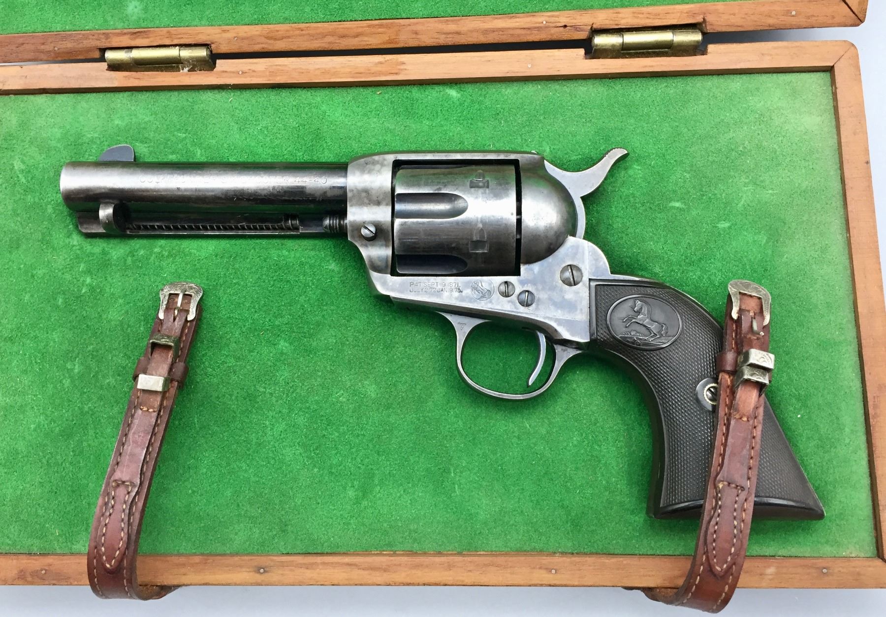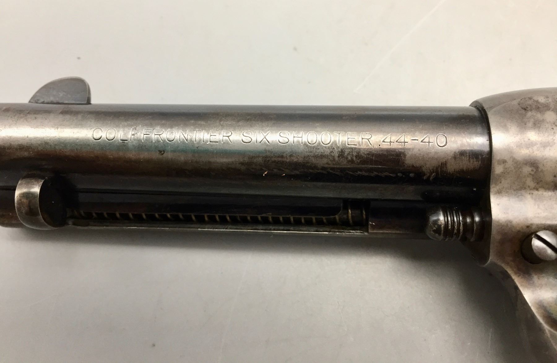 Description: Presented for sale in this lot is a Colt Single Action Army revolver featuring a blued steel finish with original grips and a custom presentation box. It is in .44-40 caliber. It comes with a Colt letter stating this was shipped to the famous Charles Ilfeld store in the New Mexico Territory during 1911 and sold to the Stanley R&L Company. The Stanley Ranch and Land Co. was a large and well-known ranch in the New Mexico Territory, south of the Santa Fe area about 30 minutes. Maker: Colt’s PT. F.A. Mfg. Co., Hartford, Conn. Approx. Age: October 30, 1911. Size: 4-3/4” barrel. Condition: Pretty good for its age, moderate wear expected. Please look closely at the pictures - they are an important part of our description. Shipping: There will be a $10 handling / packaging fee for shipping this lot. The actual cost of postage will be added on top of that. *****This firearm requires an FFL Transfer*****