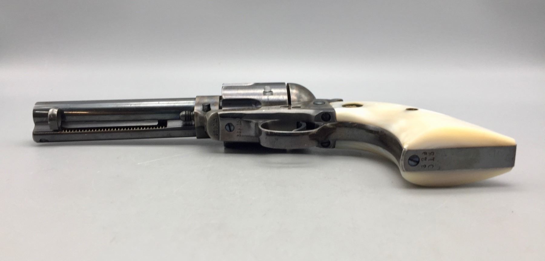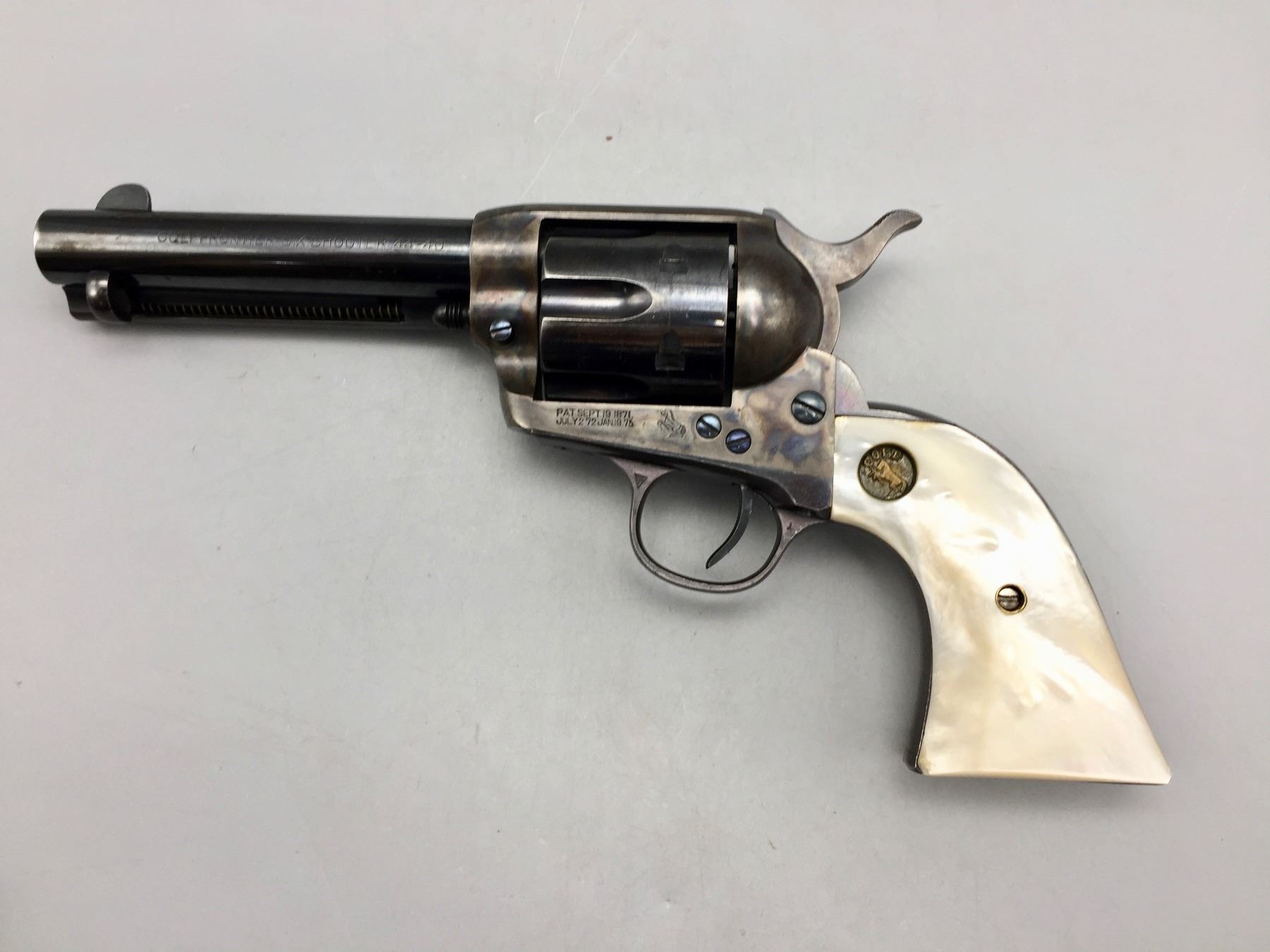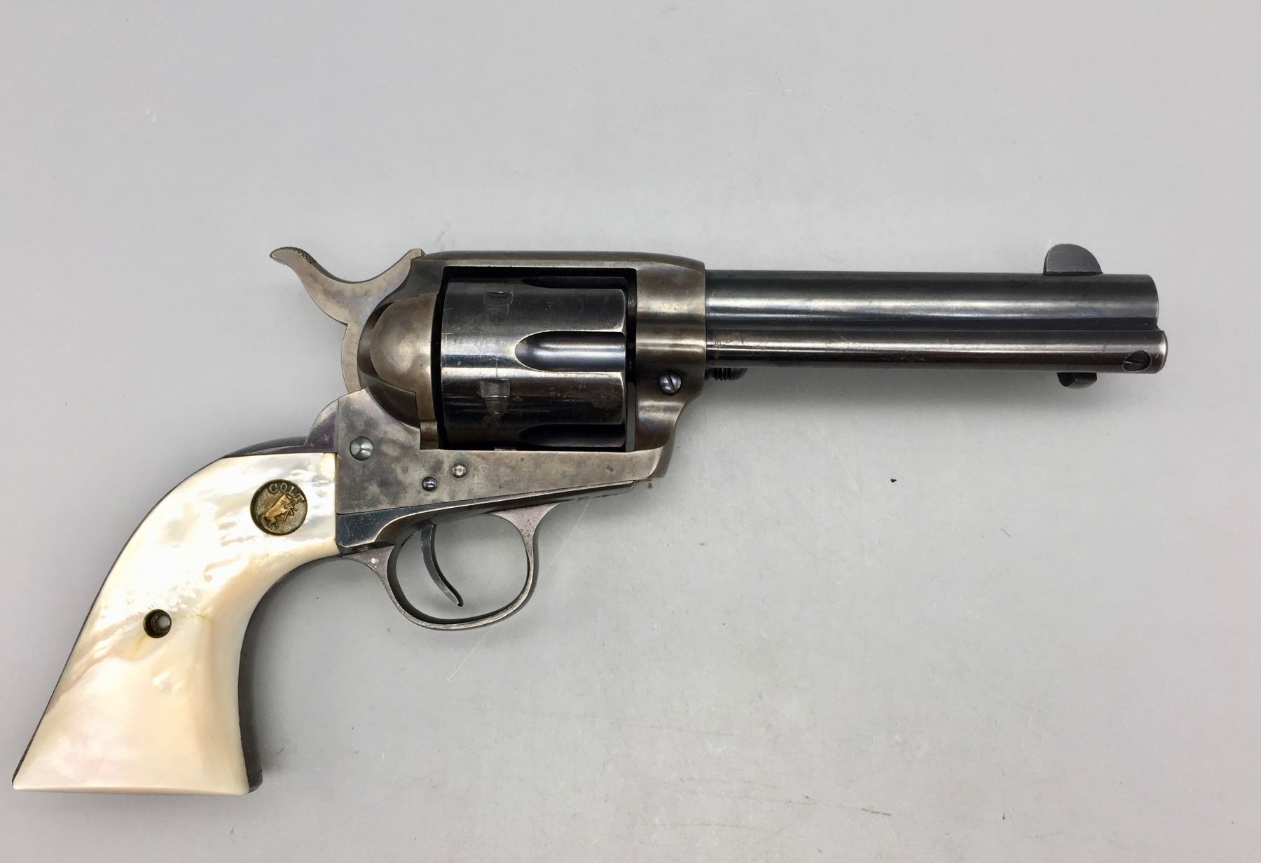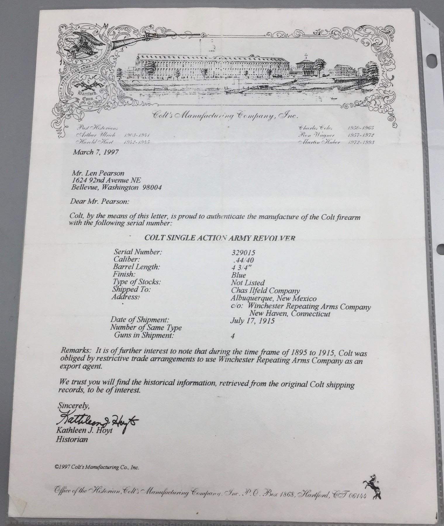 Description: Available for sale in this lot is this Colt Single Action Army revolver featuring a blued steel finish and pearl handled grips. It is in .44-40 caliber and has a letter stating is was shipped to the famous Charles Ilfeld store in the New Mexico Territory, ? Winchester Repeating Arms. The frame was case hardened. This is a rare example of a true, 98+% Colt from the early 1900s! A Colt SAA in this condition books at 10K plus! Maker: Colt’s PT. F.A. Mfg. Co., Hartford, Conn. Approx. Age: July 17, 1915. Size: 4-3/4” barrel. .44-40 cal. Condition: Very good for its age, minor wear expected. Please look closely at the pictures - they are an important part of our description. Shipping: There will be a $10 handling / packaging fee for shipping this lot. The actual cost of postage will be added on top of that. *****This firearm requires an FFL Transfer*****