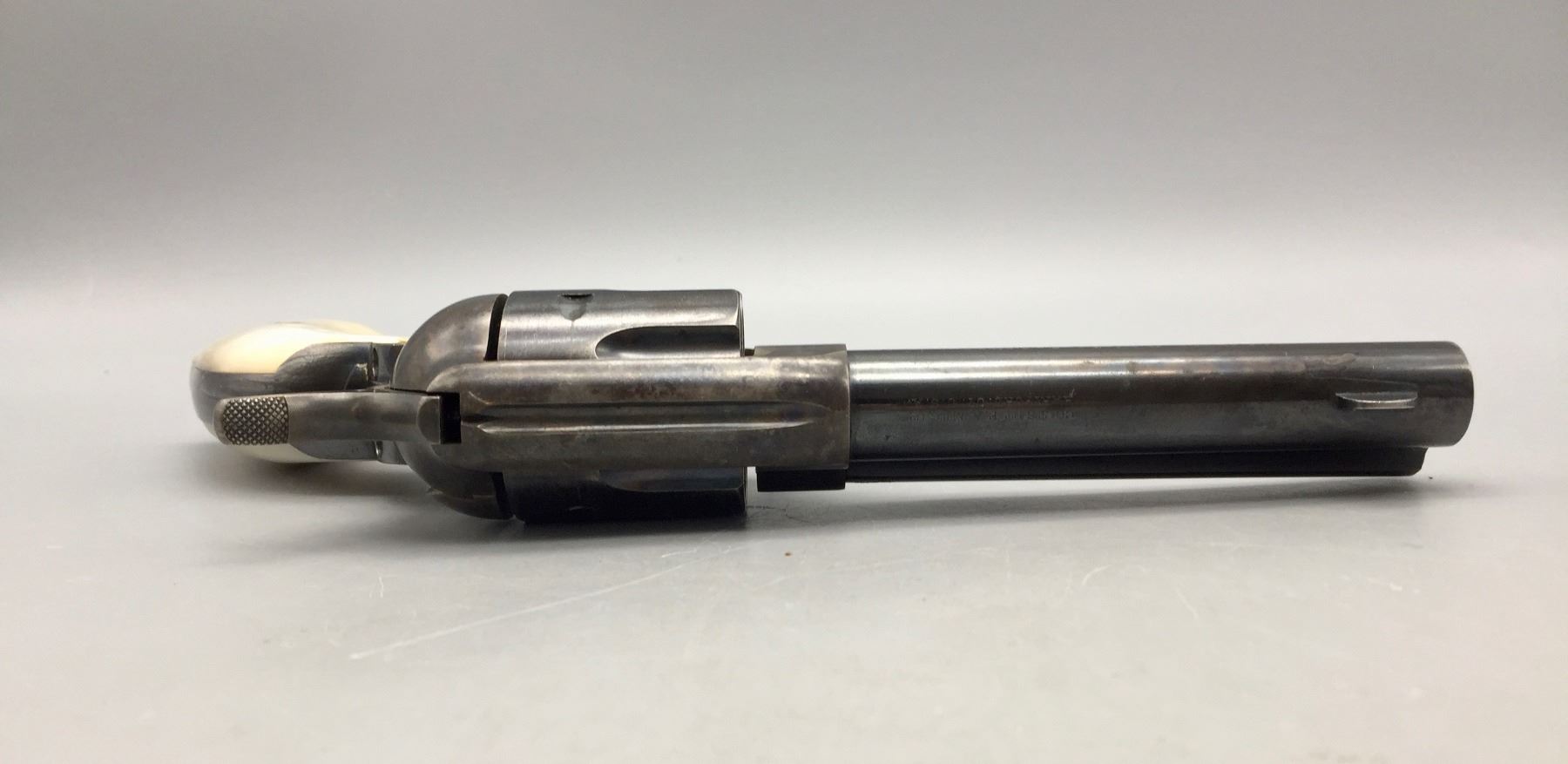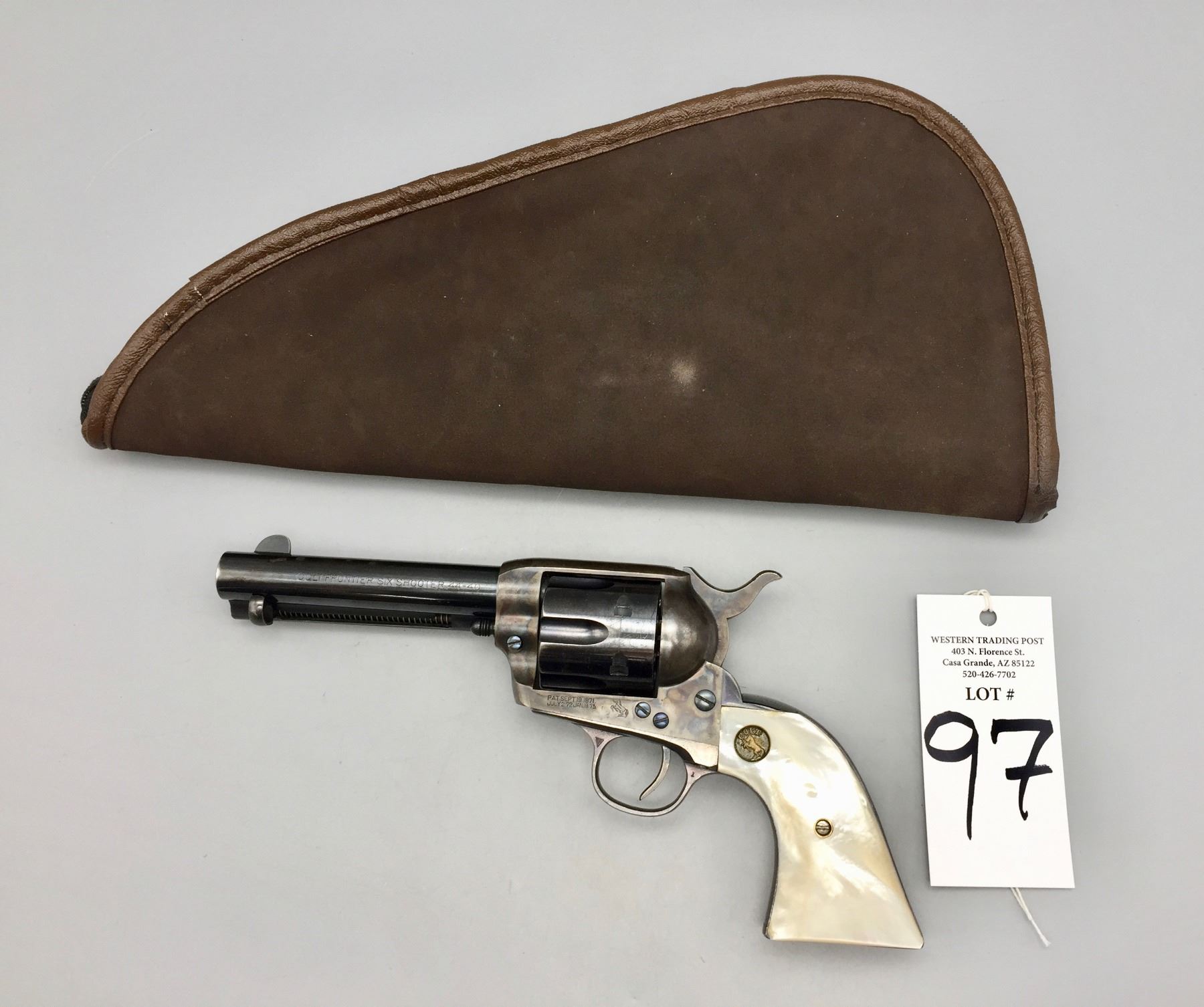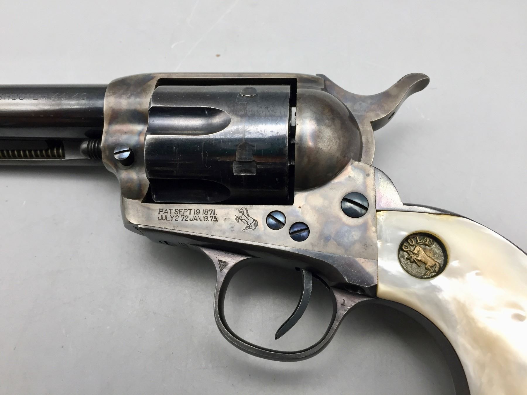 Description: Available for sale in this lot is this Colt Single Action Army revolver featuring a blued steel finish and pearl handled grips. It is in .44-40 caliber and has a letter stating is was shipped to the famous Charles Ilfeld store in the New Mexico Territory, ? Winchester Repeating Arms. The frame was case hardened. This is a rare example of a true, 98+% Colt from the early 1900s! A Colt SAA in this condition books at 10K plus! Maker: Colt’s PT. F.A. Mfg. Co., Hartford, Conn. Approx. Age: July 17, 1915. Size: 4-3/4” barrel. .44-40 cal. Condition: Very good for its age, minor wear expected. Please look closely at the pictures - they are an important part of our description. Shipping: There will be a $10 handling / packaging fee for shipping this lot. The actual cost of postage will be added on top of that. *****This firearm requires an FFL Transfer*****