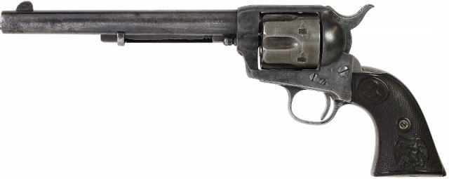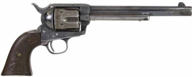 Colt SA .45 cal. SN135XXX revolverwith Colt letter, revolver features 7 1/2" barrel, blue and case hardened finish, colt hard rubber grips, shipped 1890 to Hibbard Spencer & Bartlett Chicago Illinois, condition is very good, bottom of barrelshowing 10-15% bright blue, the remainder thinned to gray, ejector housing silver gray, frame with faint colors generally mottled dark gray, back strap and cylinder turning to brown, right side grip with small loss attoe, left with light loss at heel otherwise good, all markings are sharp, front sight at full height, mechanically tight with good action and bore, made in 1890. From Jerome Klingfus collection. Antique. Est. 1800-2500
