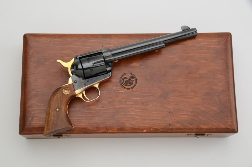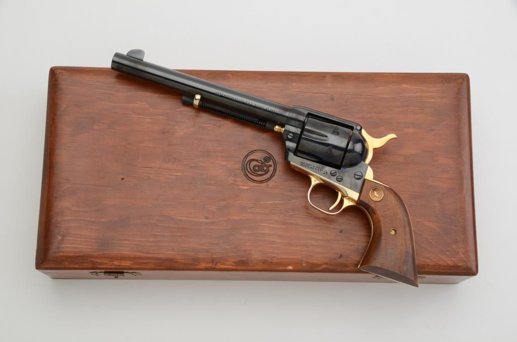 Colt SAA 125th Anniversary Edition revolver, .45 cal., 7-1/2” barrel, blue finish with gold accented straps, cylinder pin, ejector rod actuator, hammer and trigger, smooth wood medallion grips, #914AM, contained in Coltwood display case. This gun is in like new condition showing little handling. The case is lined in red material and the exterior is in overall good condition with some scattered mars and scratches from storage. Est.:$600-$1,200.