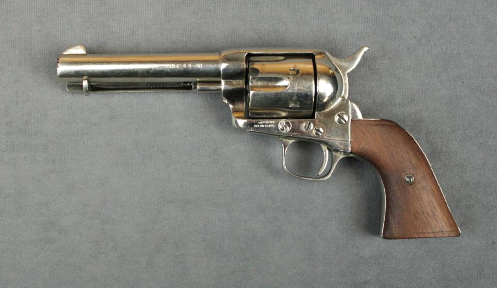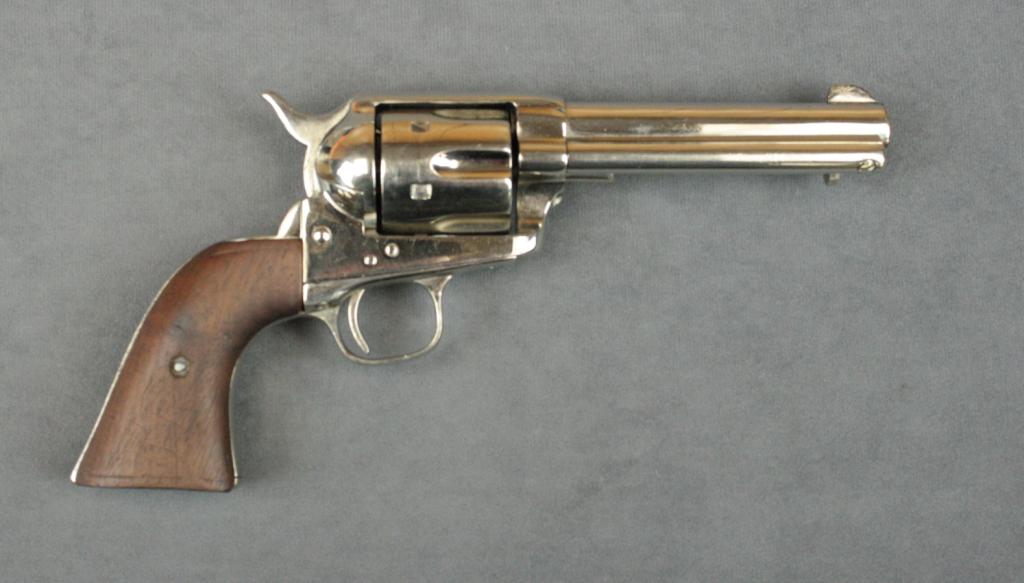 Colt SAA 1st Generation blackpowder revolver,  re-worked from .44RF cal. to 44-40 cal.,  re-nickeled and restamped with replacement  smooth wood grips, #308. This gun is in  overall very good condition as restoredshowing the majority of an old re-finish,  replaced cylinder pin, fair bore, very good  action, barrel and frame markings hand cut,  serial number correct for rimfire SAA series,  may have been freshened at time ofre-furbishment; grips overall good with some  wear and scratches.  This gun was re-worked  by Harry Hubble circa 1960’s-1970’s for his  personal preference; a real antique SAA Colt  that has been modified.  Est.:  $900-$1,800.