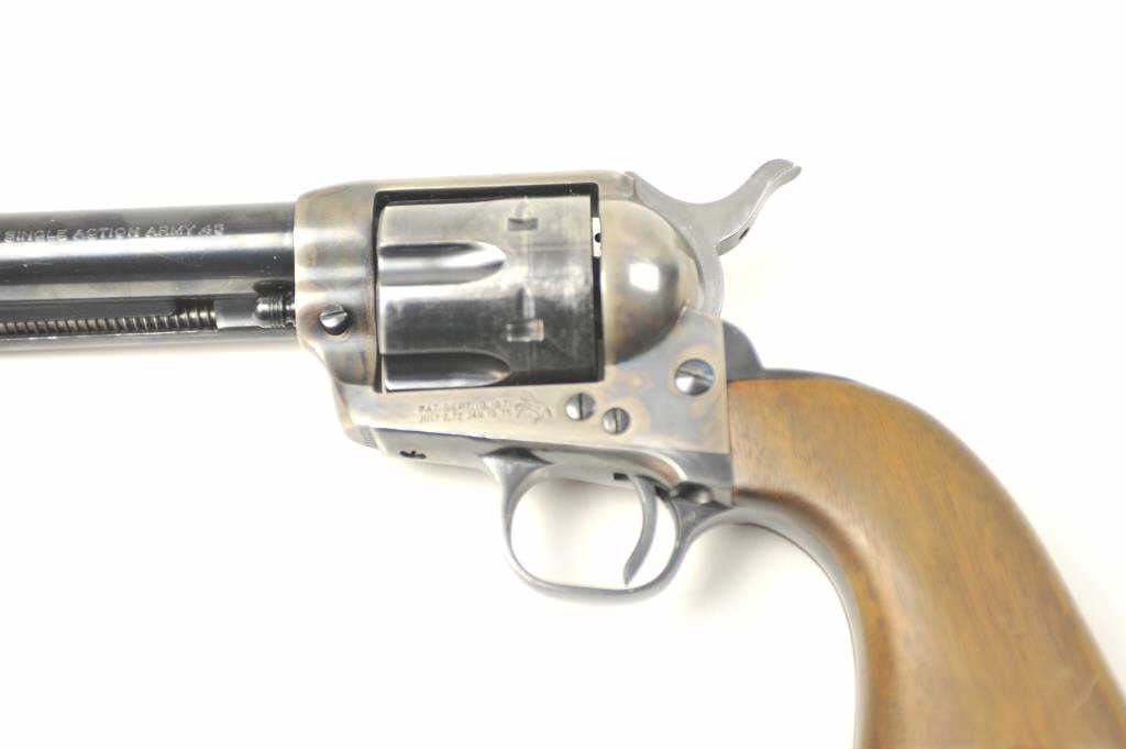 Colt SAA 2nd Generation Revolver in .45 Colt caliber with a 7 ½” barrel, blue and case colored, and screw less oversized 1 piece wood grips purchased in Hollywood late 1950s and movie and television used by tradition,S/N 13615SA. 80%-90% original blue and case colors with loss of finish from holstering and handling. Sound action and excellent bore. The grips are like the ones on this Colt have been on several television seriesguns of the 50s and 60s whereas the studios were creating the old western look. Arvo Ojalla and Stembridge Gun Arsenal were known to install this type grip on 2nd generations for “Gunsmoke” and other classics. Estateconsigned. A few scratches from fumbling fast draw. Estate consigned and may letter. (C&R/PPT) Est.: $1400-$2800