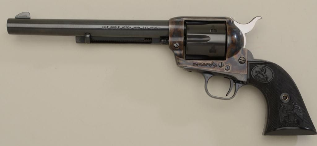 Colt SAA 2nd Generation revolver, .357 magnum cal., 7-1/2” barrel, blue and case hardened frame, checkered black hard rubber eagle grips, #92750SA with factory cardboard box and inserts numbered to this gun, hang tagand instructions book. This gun is in like new condition showing little handling. Est.: $800-$1,600.