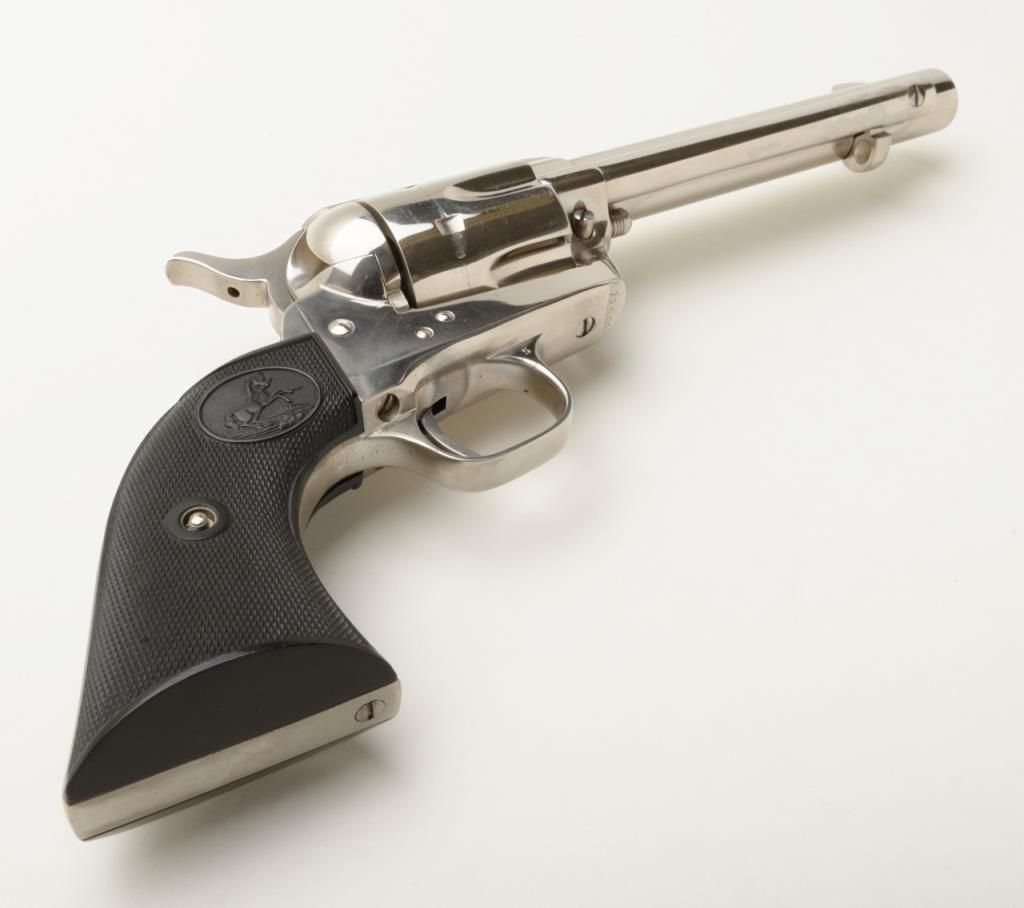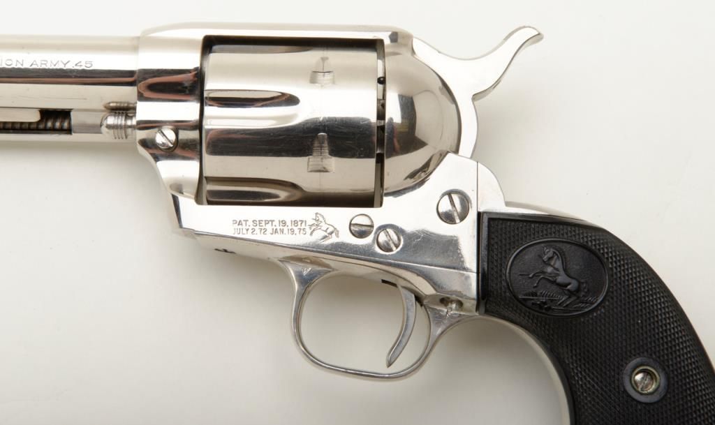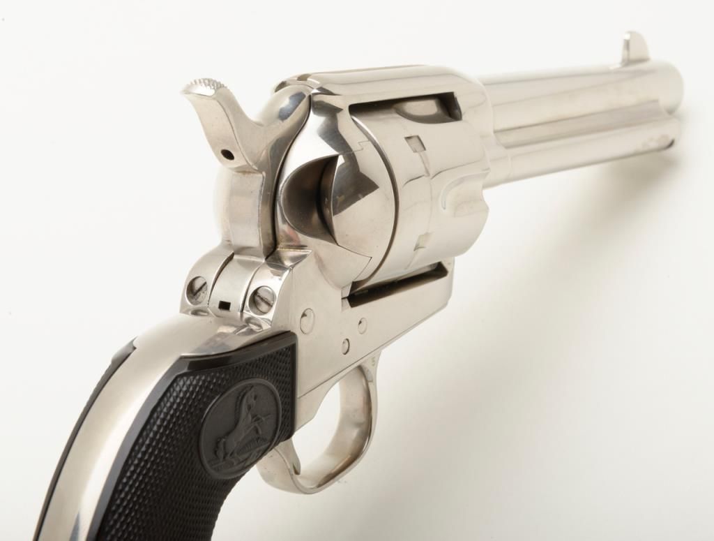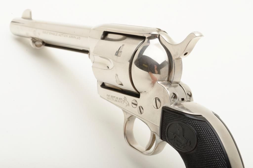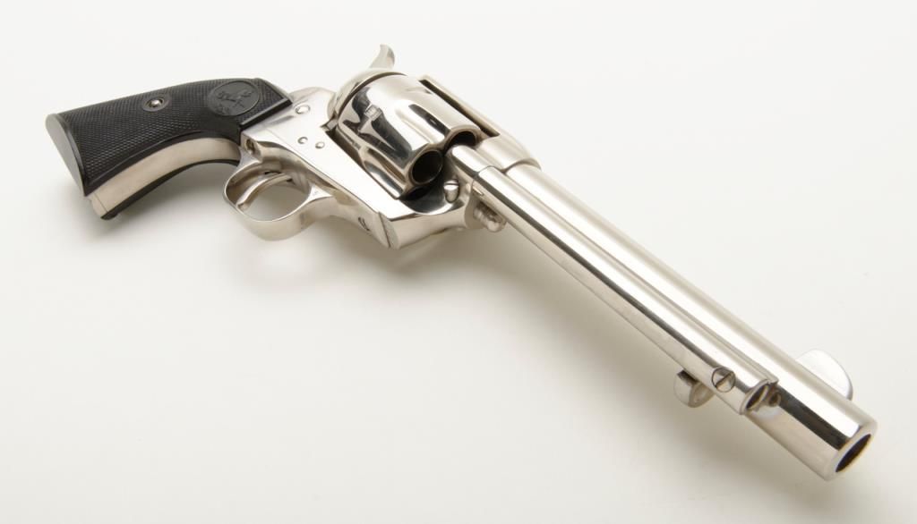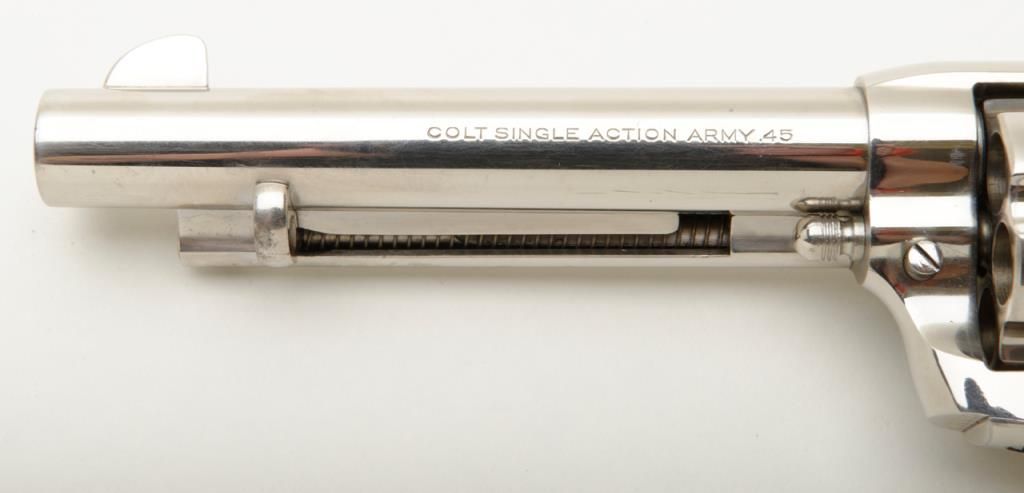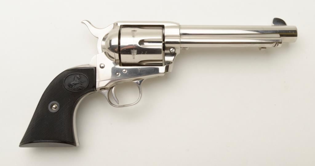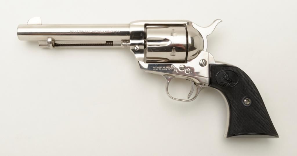 Colt SAA 2nd Generation revolver, .45 cal., 5-1/2” barrel, nickel finish, checkered hard rubber grips, #27200SA; possible factory or old re-nickel; overall very good with crisp action, very good bore, markings and grips. (C&R/PPT). Est.: $800-$1,600.