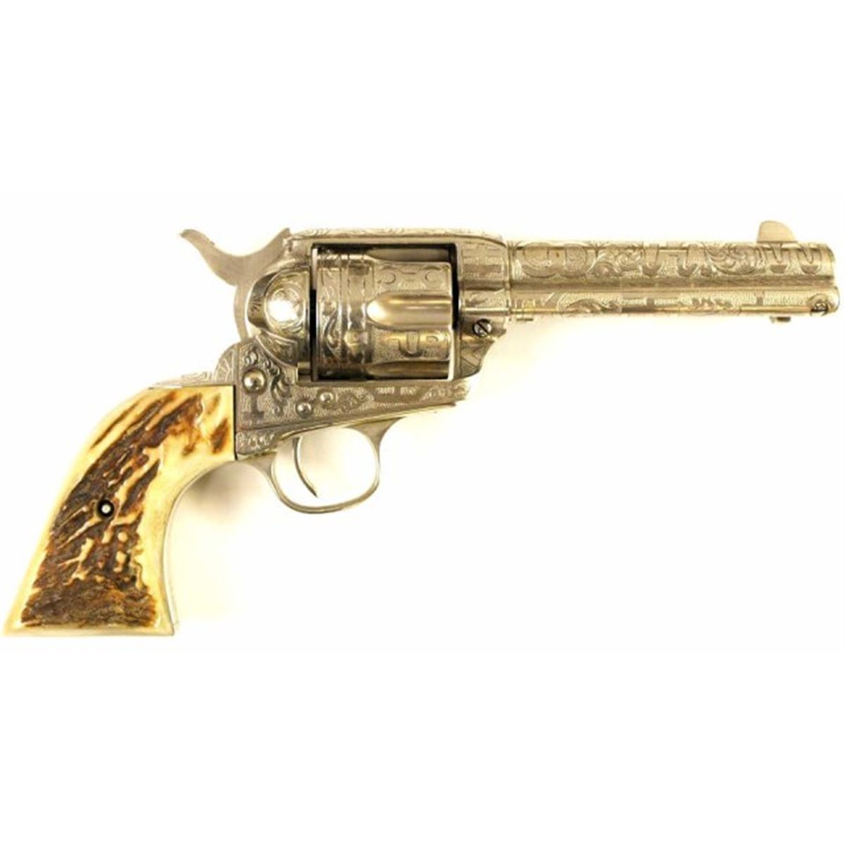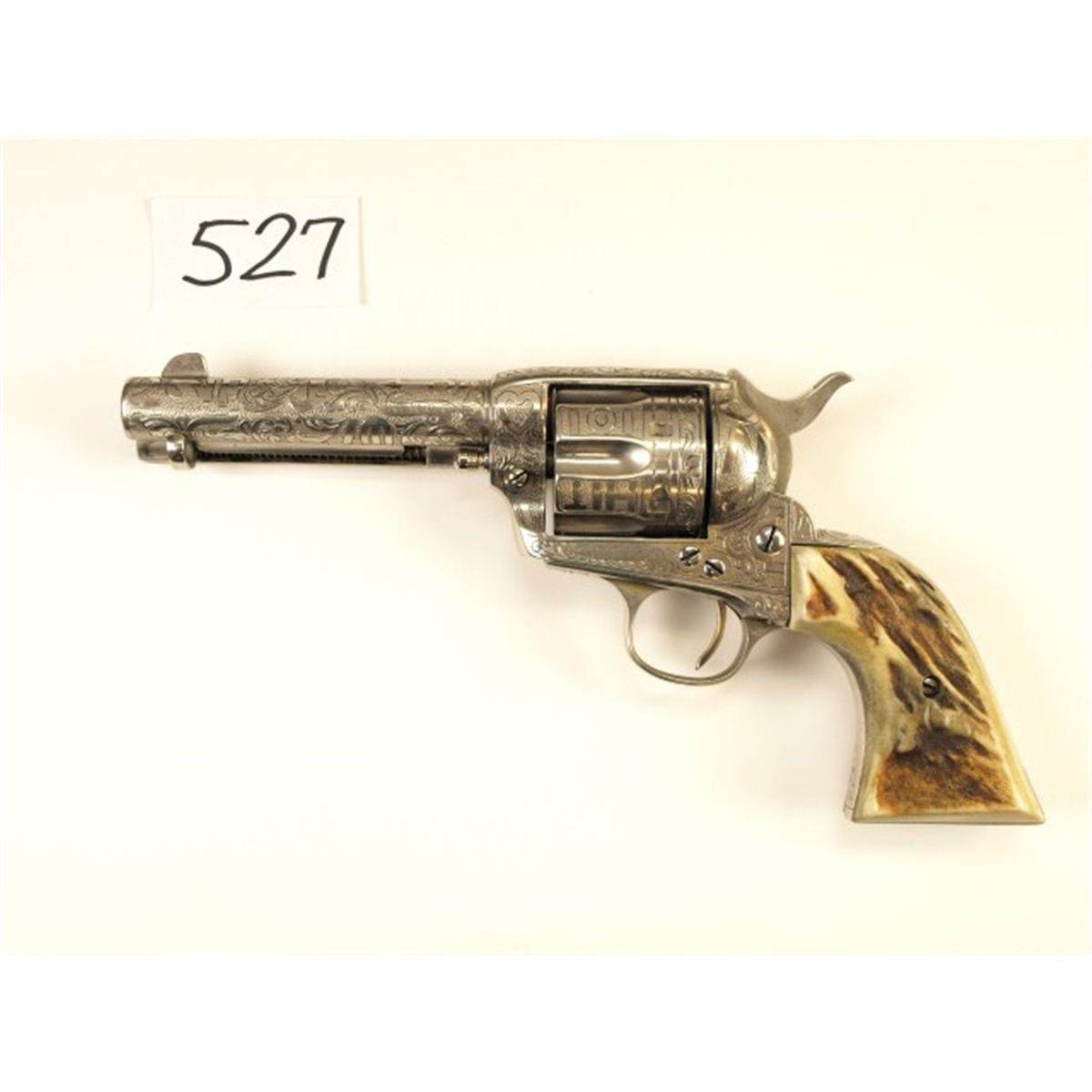 Colt SAA .38 cal. SN 308768 revolver 3 3/4" barrel . Revolver features full coverage brand engraving from historic ranches in they typical style of Cole Agee but unsigned. Top of barrel displays standard 2 line address for a 4 3/4", left side with roll engraved Colt Frontier Six Shooter, front sight slightly slimmed down and 2 line 1871 and 1875 pat' and 38 wcf on left side of frame. Revolver remains fine, all visible serial numbers match, action good with fair bore. Mfg'd 1909, FFL required.