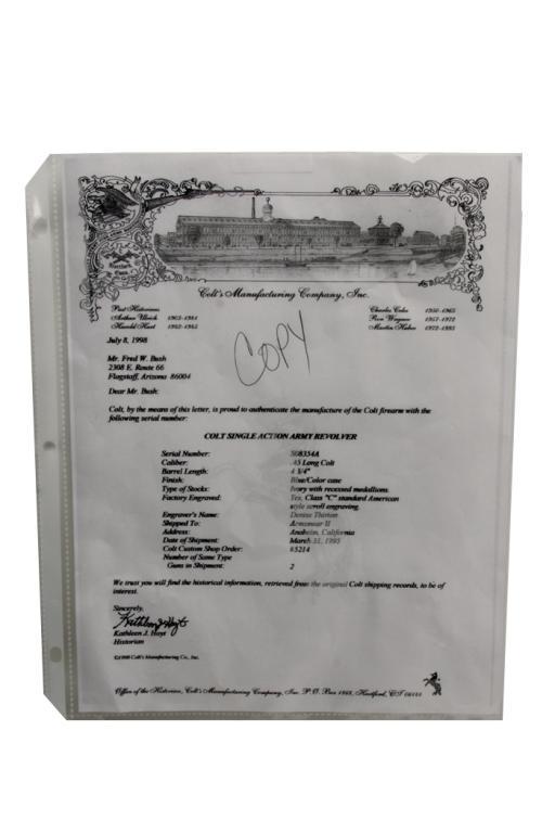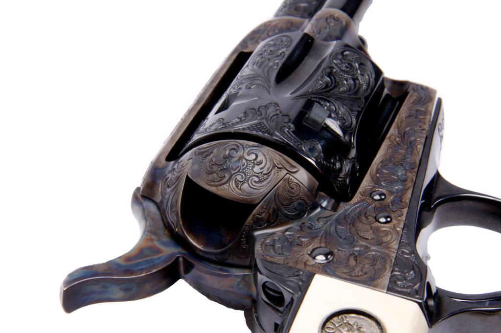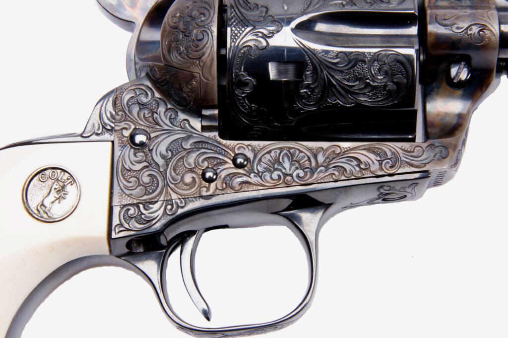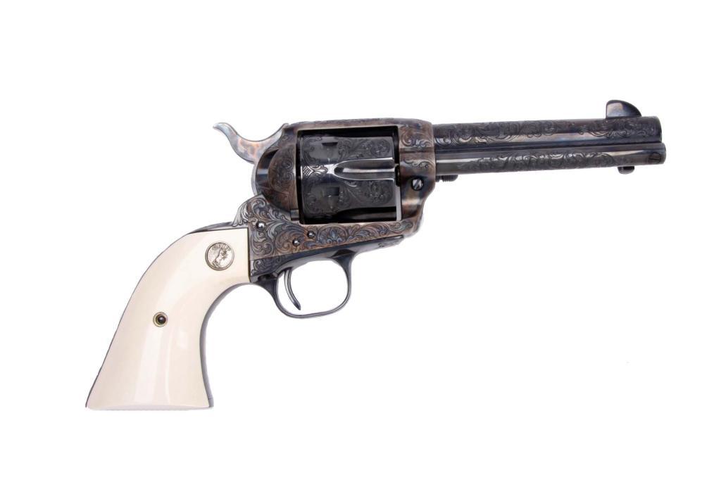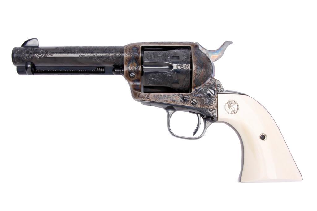Colt SAA 3rd gen Cal .45 SN:S08354A Nice original engraved Colt Single Action Army in .45 Colt caliber. Blued and case colored finish with factory "C" engraving by Denise Thirion, ivory grips with recessed medallions, 4 3/4" barrel, good bore and actNice original engraved Colt Single Action Army in .45 Colt caliber. Blued and case colored finish with factory "C" engraving by Denise Thirion, ivory grips with recessed medallions, 4 3/4" barrel, good bore and action. Condition: Excellent and appears unfired. Factory letter included verifying configuration and engraving.