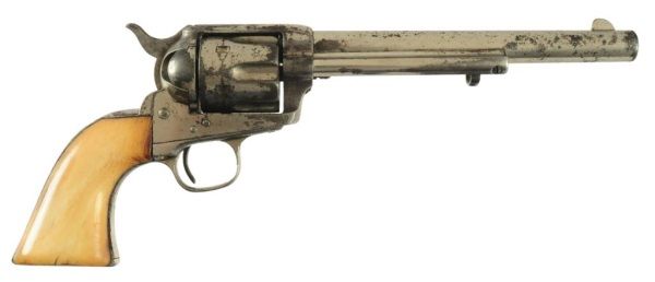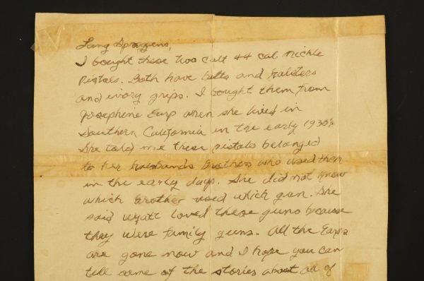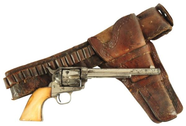 Attibuted to Wyatt Earp's brothers according to the supporting provenance letter: was purchased directly from Josephine Earp who said the gun was one of Wyatt's favorites because it (along with 177) was referred to as "My brother's guns" by Wyatt Earp. With factory letter and early double loop holster rig. & original provenance letter. Good early nickel finish Colt with ivory grips.