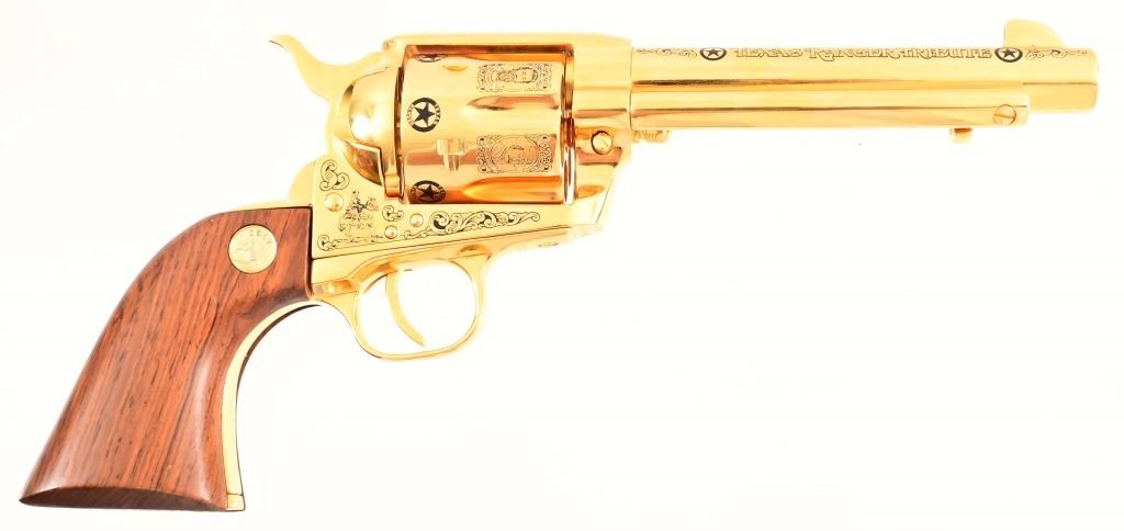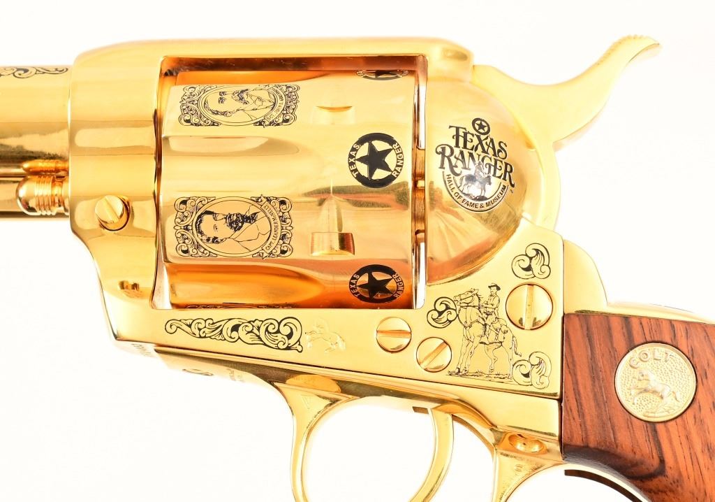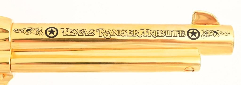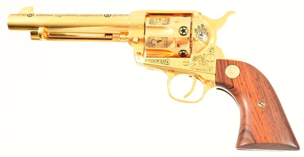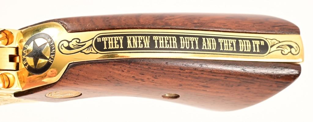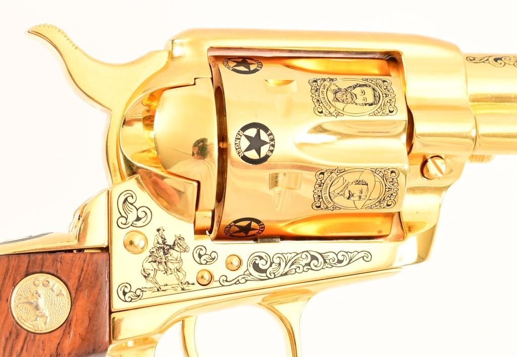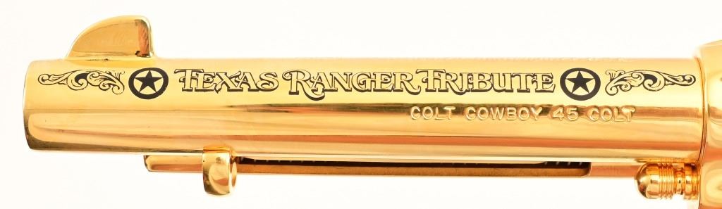 Texas Ranger Hall of Fame Tribute Colt Cowboy Single Action Army .45 Long Colt, S/N TF14853, #057 of 300, manufactured 2002. Produced by America Remembers, Ashland Virginia in conjunction with Uberti craftsmen, engraved and customized by A&A Engraving Inc., Rapid City, South Dakota. Fitted with Colt factory walnut grips and Colt medallions, 5.5" bbl. Decorated in lustrous 24-karat gold, with artwork honoring legendary Texas Rangers and the Ranger heritage. The cylinder features portraits of six legendary Texas Rangers: Maj. John Jones, Capt. Leander McNelly, Sgt. John B. Armstrong, Capt. Bill McDonald, Capt. Dan Roberts, & Sgt. James B. Gillett. The backstrap features the inscription, "They Knew Their Duty and They Did It", based on quote from Ranger John S. "Rip" Ford. On the recoil shield is the official logo of the Texas Ranger Hall of Fame and Museum in Waco, Texas. Comes with wood presentation case, and certificate of authenticity.