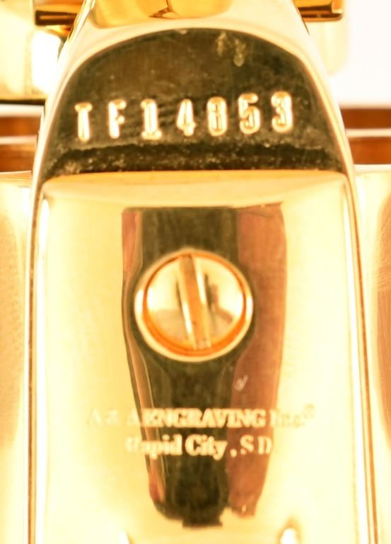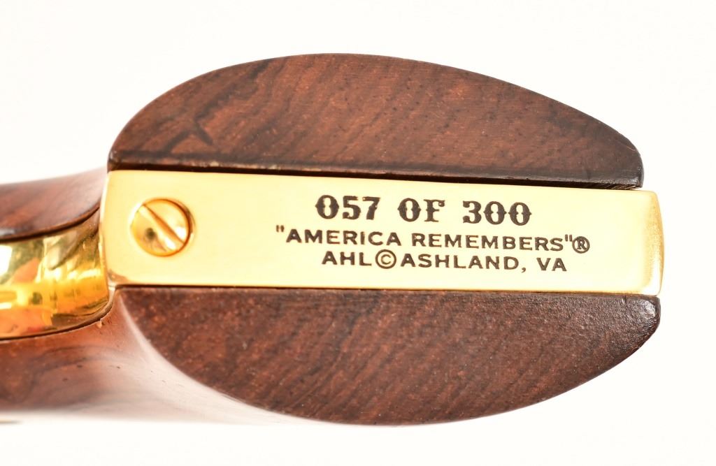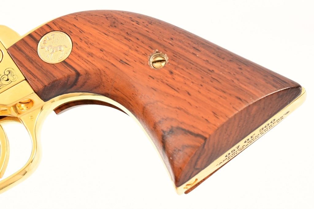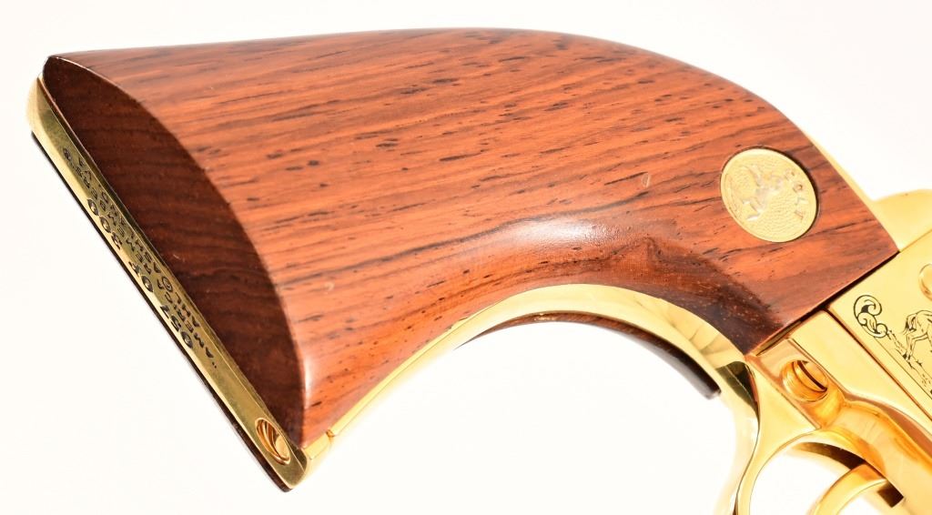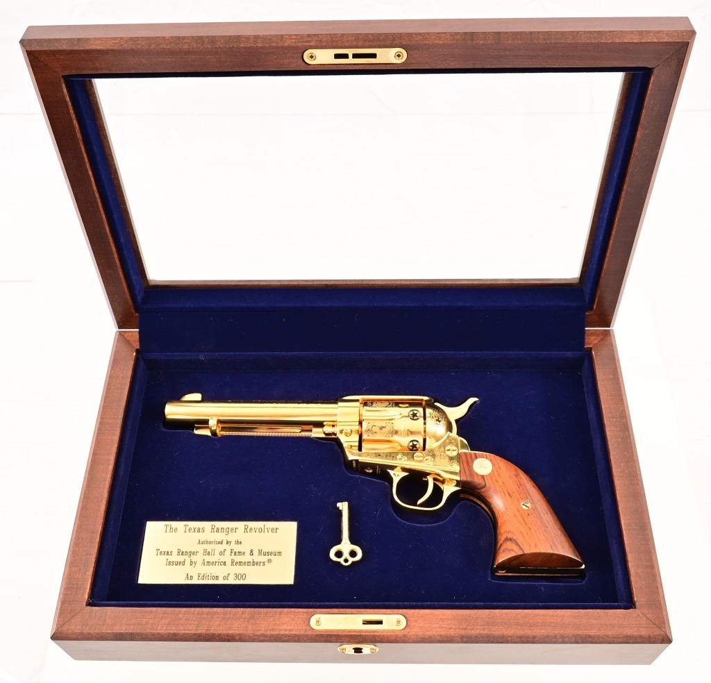 Texas Ranger Hall of Fame Tribute Colt Cowboy Single Action Army .45 Long Colt, S/N TF14853, #057 of 300, manufactured 2002. Produced by America Remembers, Ashland Virginia in conjunction with Uberti craftsmen, engraved and customized by A&A Engraving Inc., Rapid City, South Dakota. Fitted with Colt factory walnut grips and Colt medallions, 5.5" bbl. Decorated in lustrous 24-karat gold, with artwork honoring legendary Texas Rangers and the Ranger heritage. The cylinder features portraits of six legendary Texas Rangers: Maj. John Jones, Capt. Leander McNelly, Sgt. John B. Armstrong, Capt. Bill McDonald, Capt. Dan Roberts, & Sgt. James B. Gillett. The backstrap features the inscription, "They Knew Their Duty and They Did It", based on quote from Ranger John S. "Rip" Ford. On the recoil shield is the official logo of the Texas Ranger Hall of Fame and Museum in Waco, Texas. Comes with wood presentation case, and certificate of authenticity.