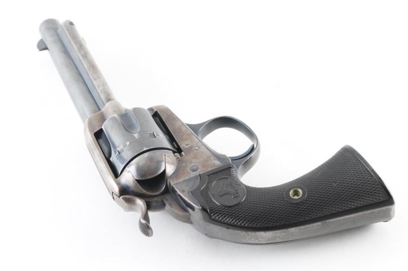 Single action revolver manufactured circa 1912, chambered in 32-20. Features Bisley shaped grip frame, wide smooth trigger, wide knurled hammer, 5-1/2" barrel, blued finish, checkered black composition grips with Rampant Colt emblems. Bore is good to very good condition, showing strong rifling. Retains 50% finish,with edge losses, bare metal on portions of cylinder, on grip straps, and on exposed outer edge of ejector rod housing. Case colors on frame are muted, turning brown, with some darker gray color spots. Grips are very good condition, showing a color closer to chocolate brown on left panel. Action is smooth with good lock-up. Markings are crisp, with numbers on backstrap showing shallower across the tops. Factory letter (included) listed configuration matches. Condition is NRA Very Good *** C&R Firearm *** [From the Jim Sigmon Collection]