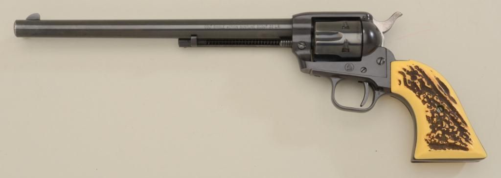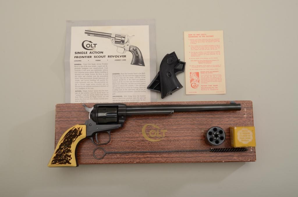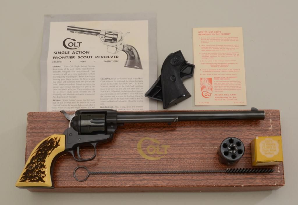Colt SAA Buntline Scout Model revolver, .22LR caliber with extra factory .22 Mag. cylinder, 9-1/2” barrel, blue finish, faux stag grips and original checkered hard rubber grips, #92490F. This gun is in overall likenew condition showing little handling in factory wood grained cardboard box with instructions, cleaning rod and paperwork. Est.: $400-$800.