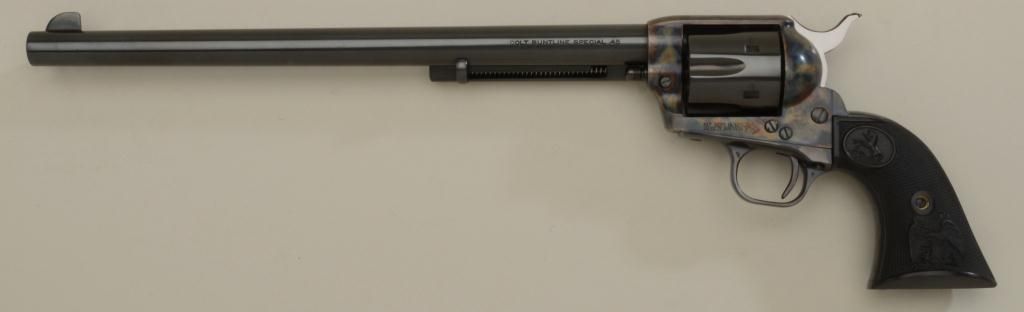 Colt SAA Buntline Special 3rd Generation revolver, .45 cal., 12” barrel, blue and case hardened finish, checkered black hard rubber eagle grips, #SA35815. This gun is in like new condition with brilliant case colors onframe, sharp markings, crisp grips, etc. Est.: $1,100-$1,800.