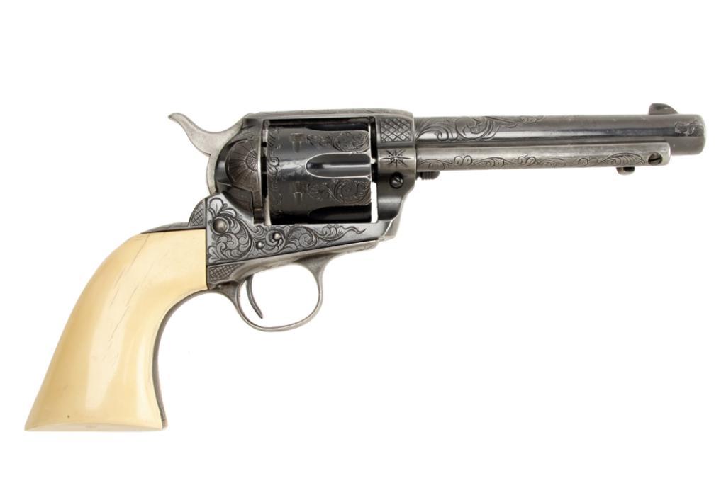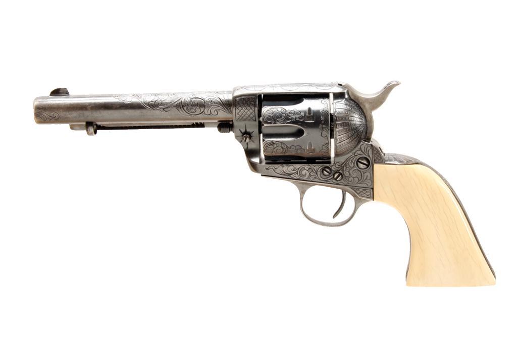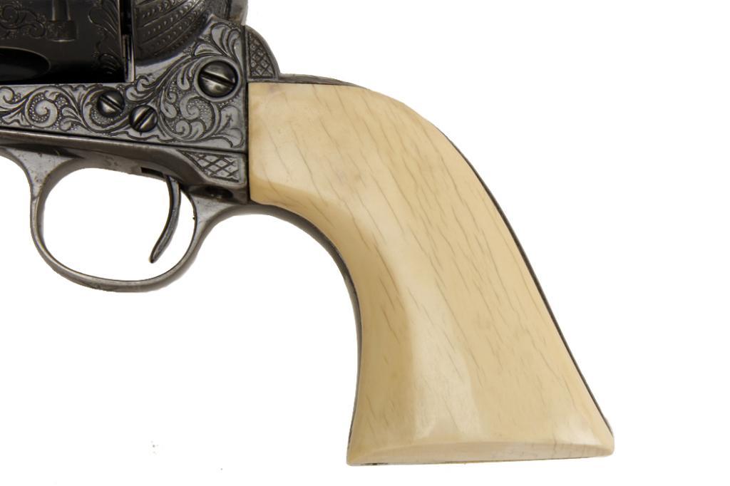 Colt SAA Cal 32-20 SN:277357 Revolver with 5 1/2" BBL, Western style scroll engraved, blued finish, oversized ivory grips with no screw hole. made abut 1910. Approximately 70% old reblue remains. The engraving is good and of type done by jewelers andRevolver with 5 1/2" BBL, Western style scroll engraved, blued finish, oversized ivory grips with no screw hole. made abut 1910. Approximately 70% old reblue remains. The engraving is good and of type done by jewelers and saddle shops in the1950s. Grips show good patina and age cracking. Good action, good bore. Some later pre-war replaced parts.