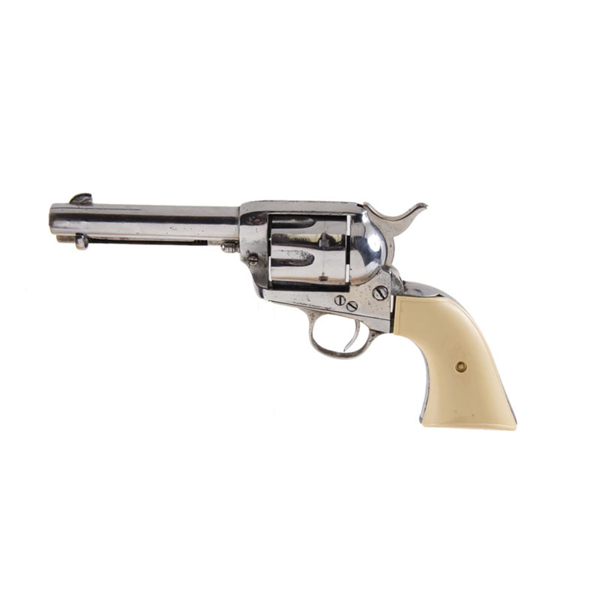 Condition: FairFirst Generation Colt SAA in .32-20 caliber to match the rifle cartridge. Nickel refinish, simulated ivory grips with snake and eagle symbol molded in, 4 5/8" barrel with fixed sights, good bore and action.Condition: Fair showing aggressive refinishing which has removed most of the stampings, and some of the pitting still shows through. Have a gunsmith check this one out as a great shooter.