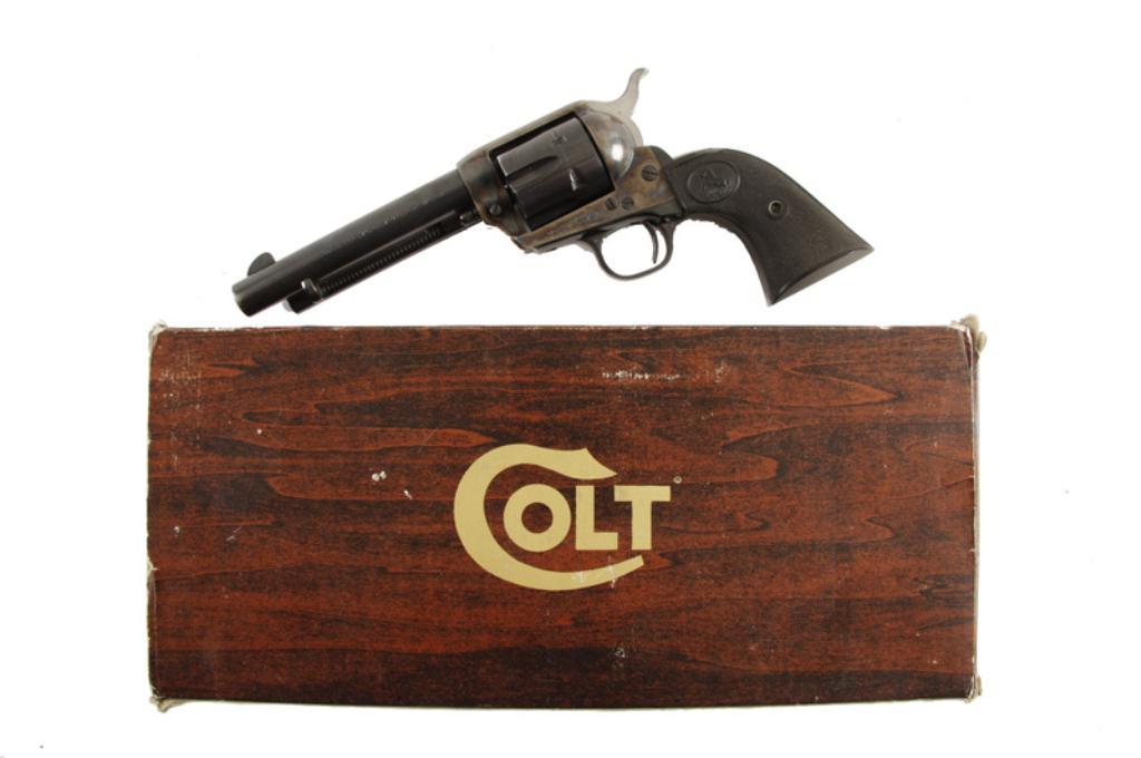 Condition: Excellent with just a slight bit of nose bleed. In originalBeautiful Single Action Army in .357 Magnum caliber. Standard Colt finish, black checkered grips, 5 1/2" barrel with fixed sights, good bore and action. Condition: Excellent with just a slight bit ofnose bleed. In original wood grain box