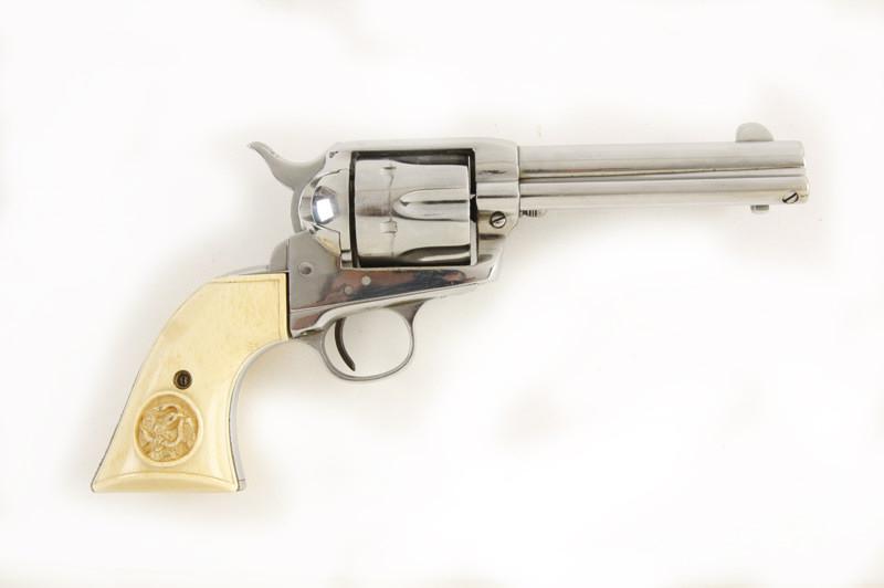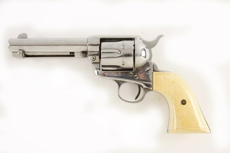 Colt SAA Cal .38WCF SN:226171 Single action 6 shot revolver ,.38WCF, Renickeled, ivory grips with Mexican motif on the right side, 4 3/4" barrel with fixed sights, good bore and action.