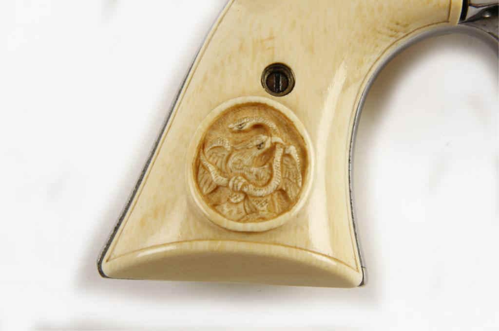 Condition: Very good as refinished. Grips don't seem to fit well buSingle action 6 shot revolver ,.38WCF, Renickeled, ivory grips with Mexican motif on the right side, 4 3/4" barrel with fixed sights, good bore and action. Condition: Very good as refinished. Grips don'tseem to fit well but are in good condition. This gun probably spent at least part of its life south of the border.