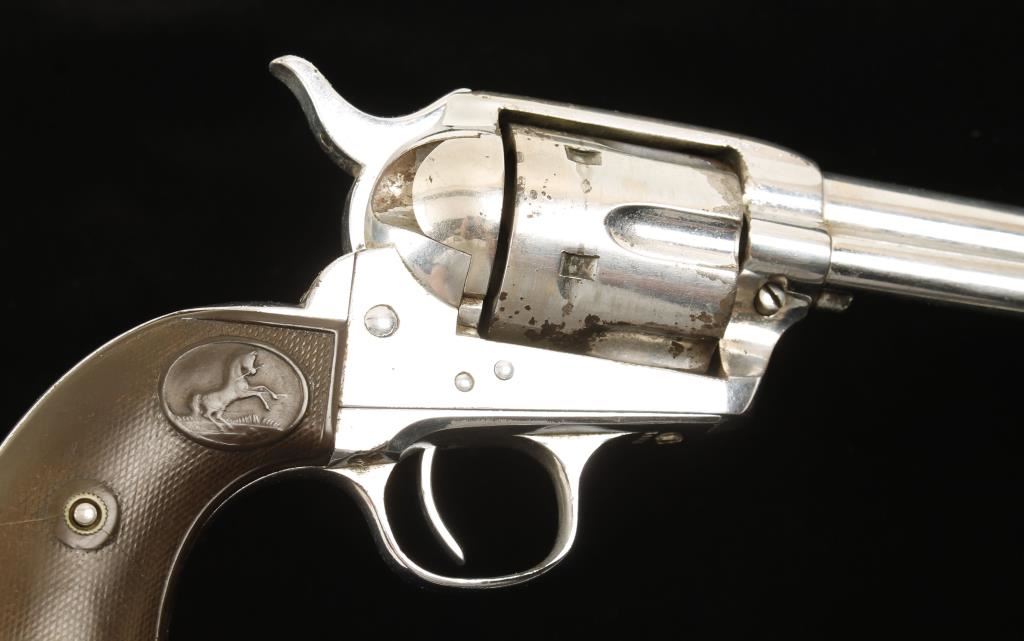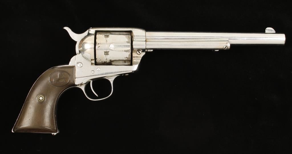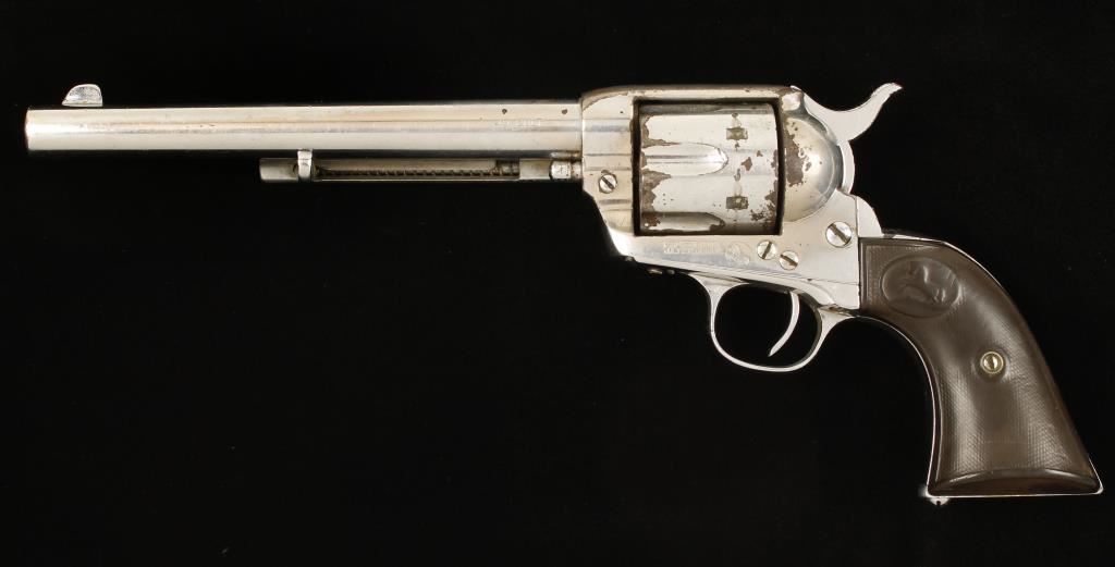 Made in 1907. Nickel plated single-action 6-shot revolver with a 7-1/2" barrel. All matching serial numbers. Finish is dull, dinged, worn and flaking. the roll-stamping is sharp. Bore and chambers are dark but there is sharp rifling. Hard rubber grips are very worn with very little of the original checkering. Condition is fair to good. *Modern Firearm*