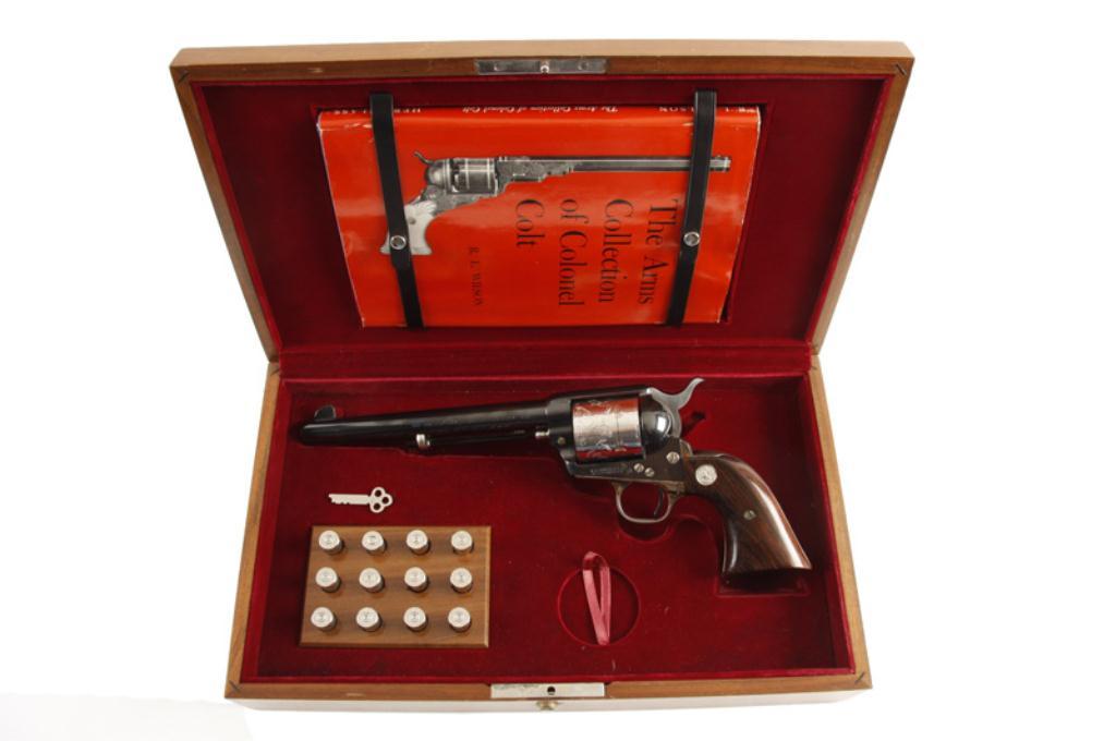 Colt SAA Cal .45 Colt SN:974SC Very nice Commemorative "1814 Col Saml Colt Sesquicentennial Model 1964" in display box. Revolver is beautiful with blued barrel & frame, case color grip frame, and nickel cylinder engraved with prancing horse and Col ColtVery nice Commemorative "1814 Col Saml Colt Sesquicentennial Model 1964" in display box. Revolver is beautiful with blued barrel & frame, case color grip frame, and nickel cylinder engraved with prancing horse and Col Colt legendand other scenes. smooth wood grips with Colt medallions,7 1/2" barrel with fixed sights, good bore and action. Condition: Perfect with no sign of having been fired. Wood display case has nice plaque on lidwith 1 of 5000 inscription, and inside dark red velour lining with book on "The Arms Collection of Colonel Colt" by R. L. Wilson" and bullet board for 12 rounds of ammo, plus the key of course.