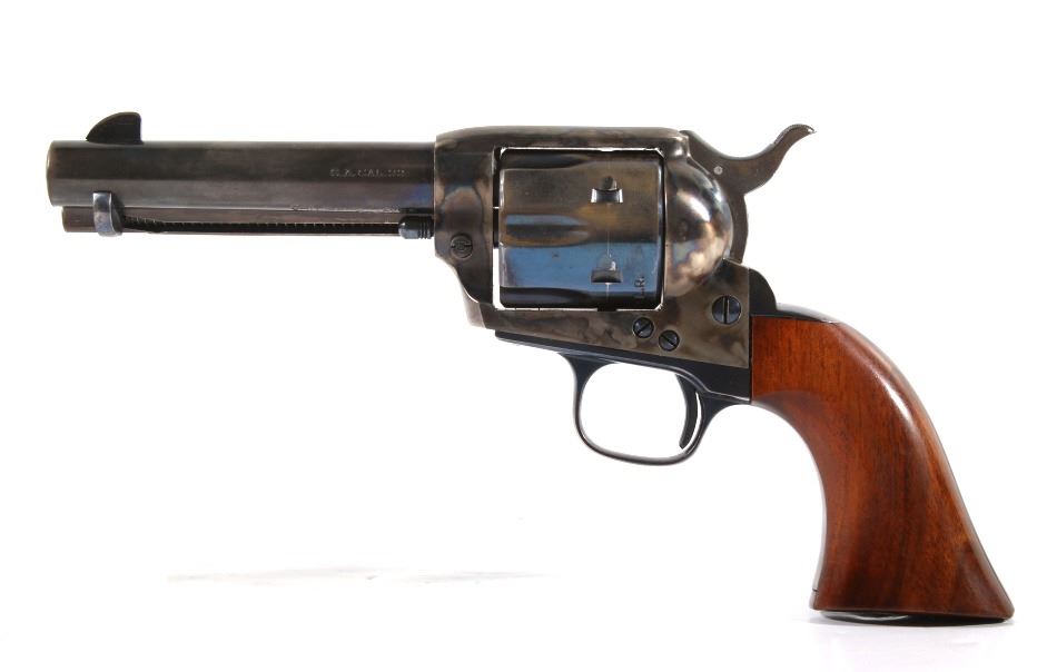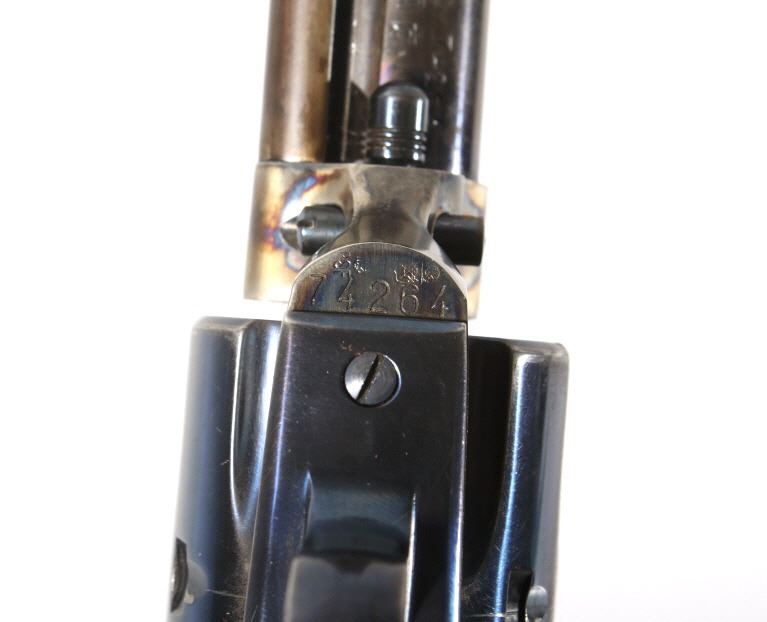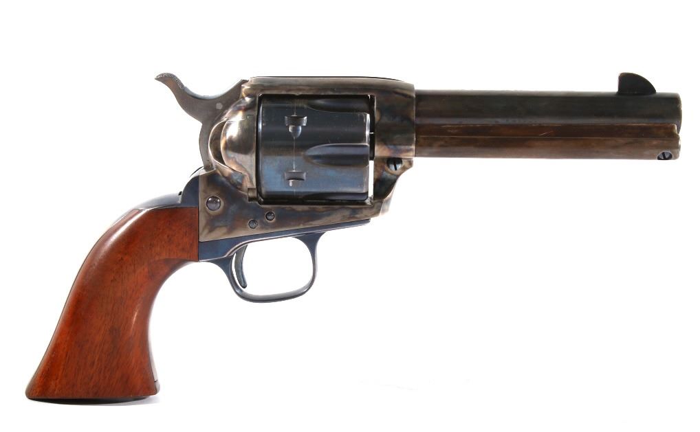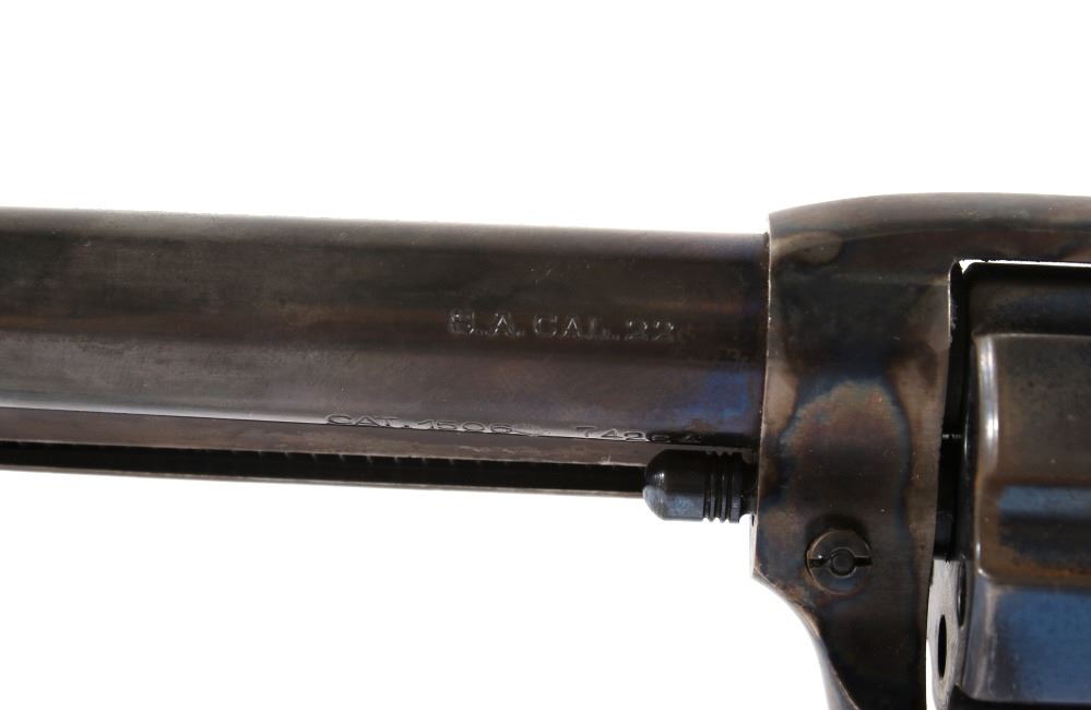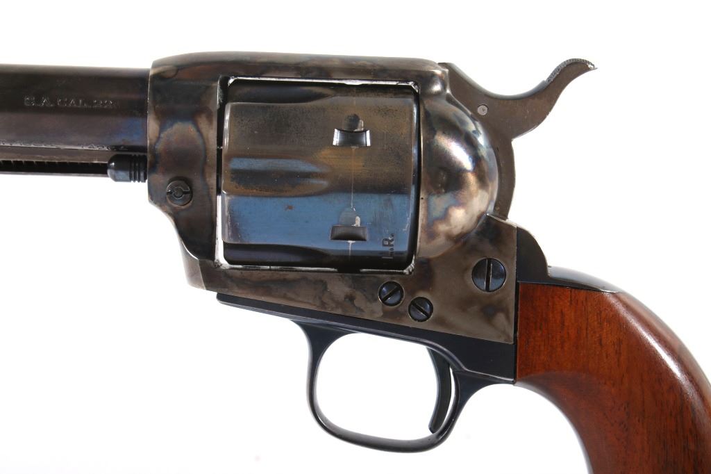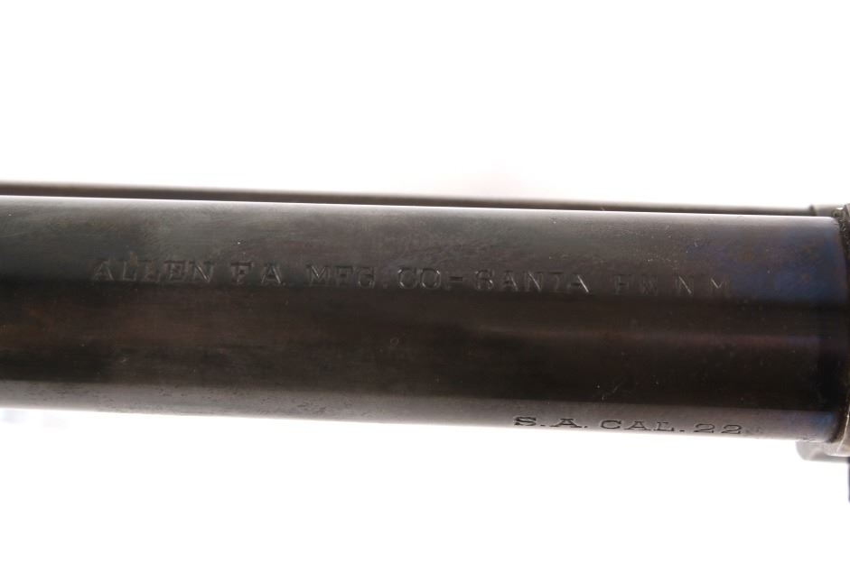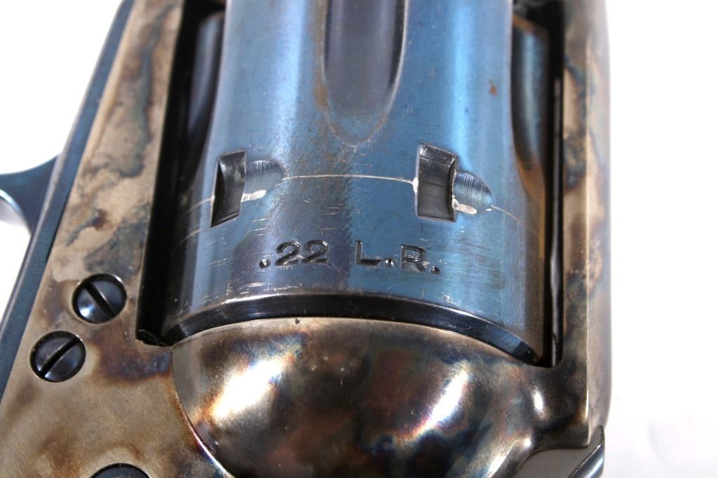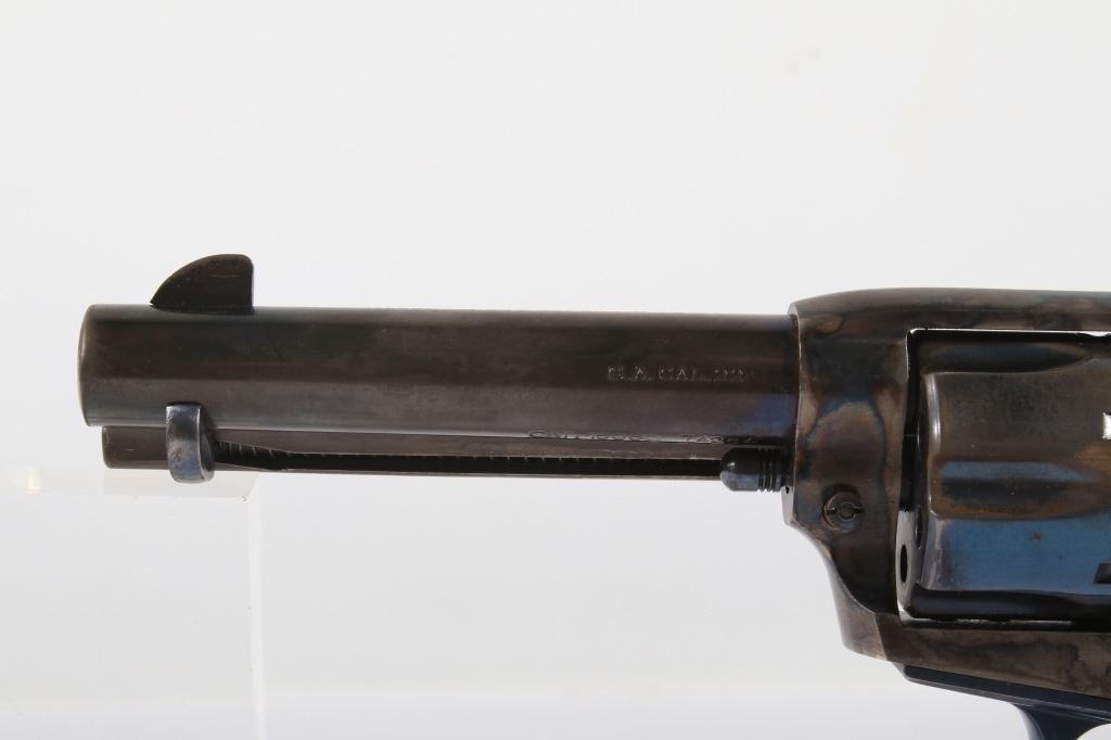This is a Uberti/Allen F.A. Mfg. Co. Cattleman Colt Single Action revolver in the .22LR caliber. The revolver features a blue'd barrel, frame and six shot cylinder with Walnut grips. The barrel is 4" and is marked "S.A. Cal. 22 - CAT. 1506 - A. Uberti & C. Italy" on the side and bottom with "Allen F.A. MFG. Co.- Santa Fe NM" across the top. The Colt revolver shows good condition and has retained much of the original finish. The pistol measures 10.25" long overall with a 4" barrel. Serial number is 74264. This firearm qualifies as a Modern Firearm, and requires FFL Transfer or NICS Background Check. Ben