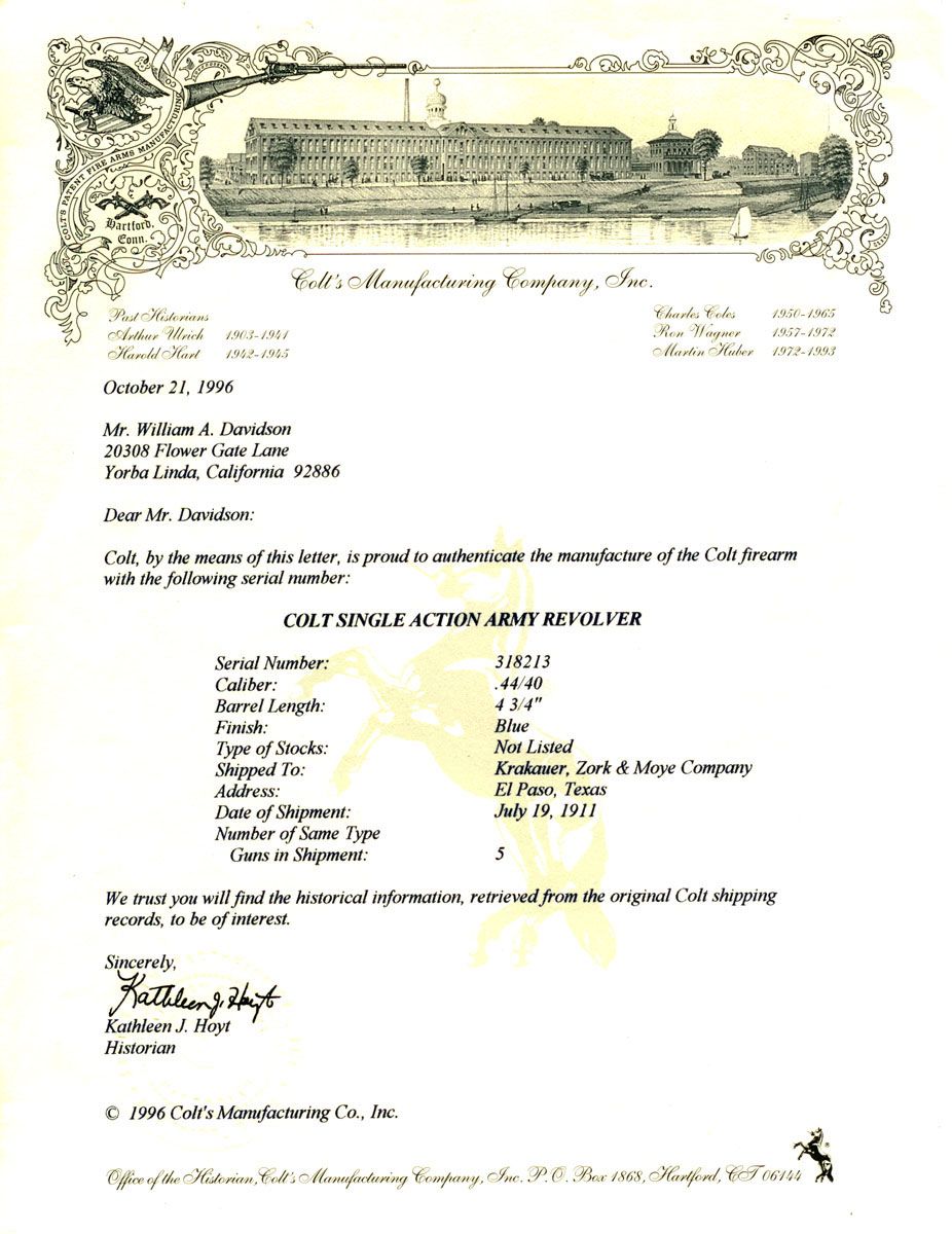 Colt SAA "Colt Frontier Six Shooter", 44-40 cal.,Texas shipped revolver. 4-3/4" barrel, All matching numbers, everything is original, S#-31823, shipped Jul 19, 1911 to El Paso Texas. Comes with Colt Factory letter.