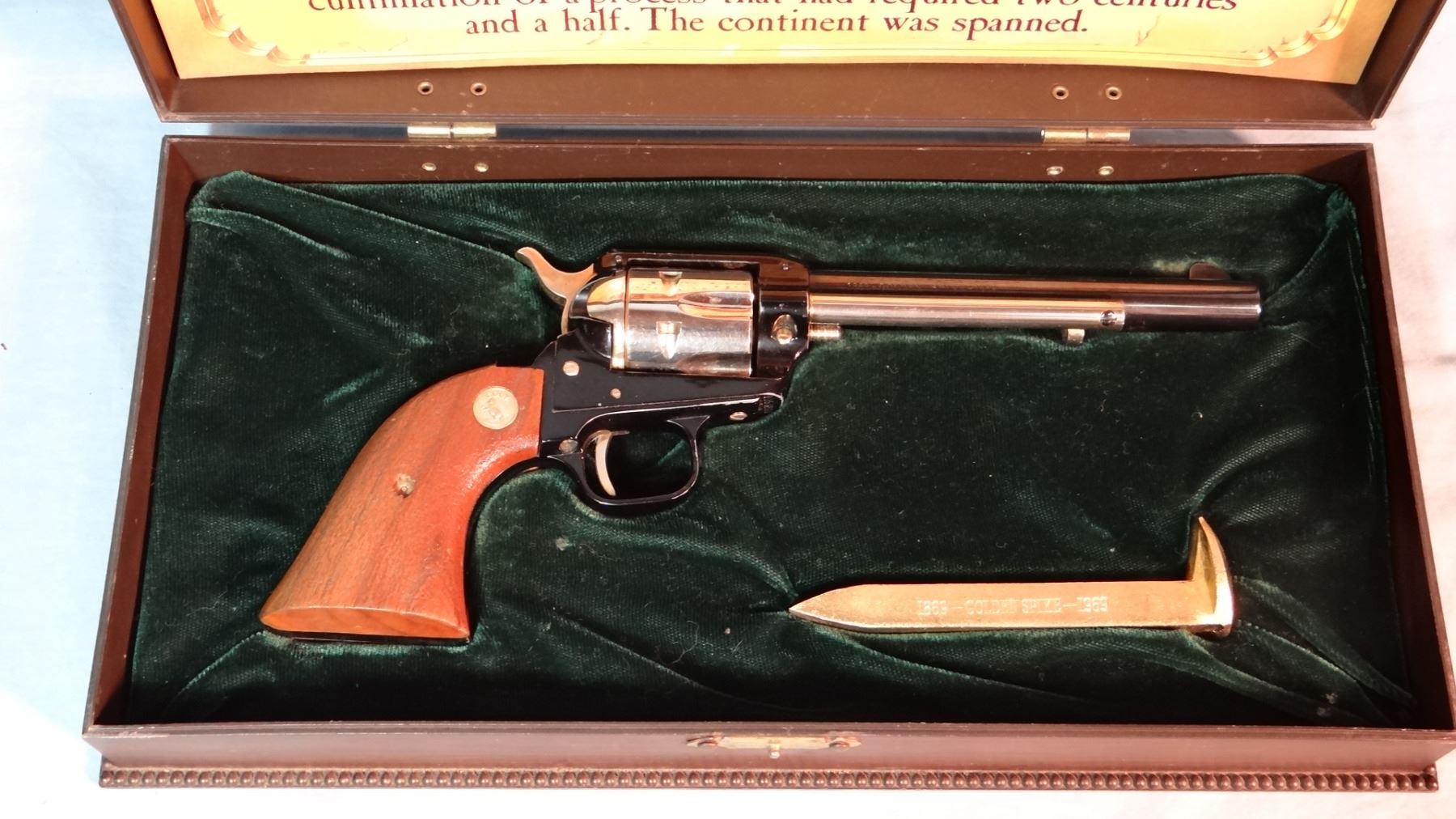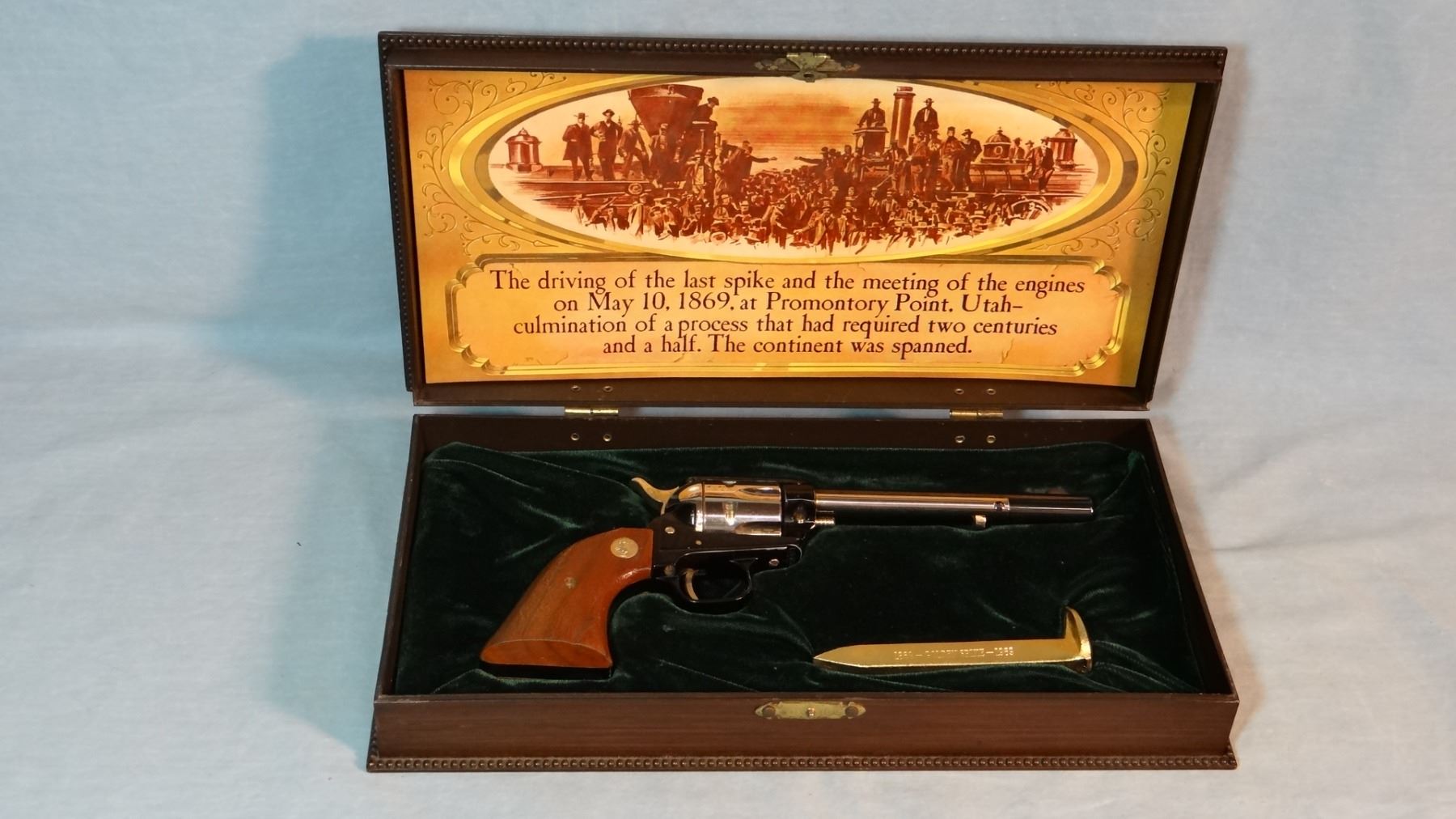 Colt SAA Frontier Scout, .22 LR, 1869-1969 Golden Spike, 6" bbl, cased, nickel cylinder, sn: 10592G