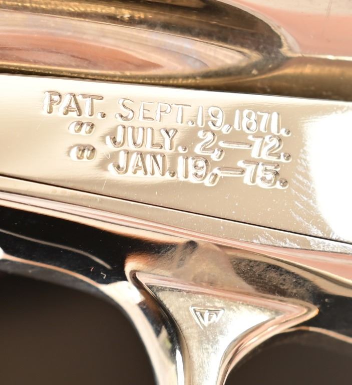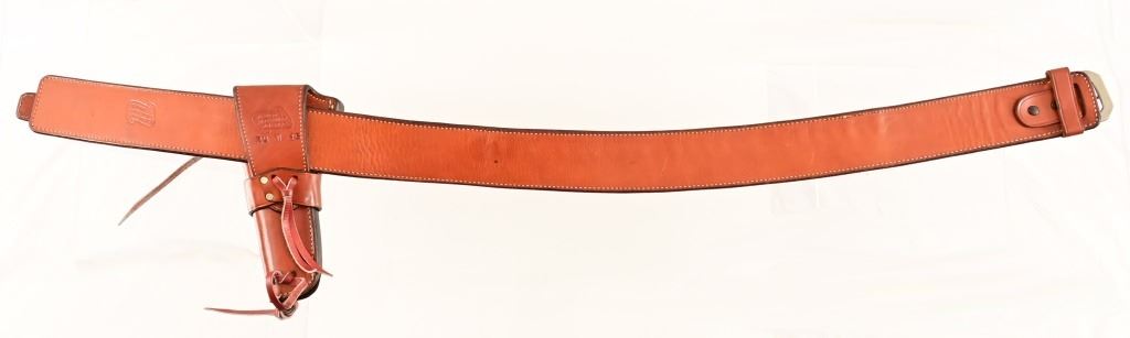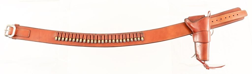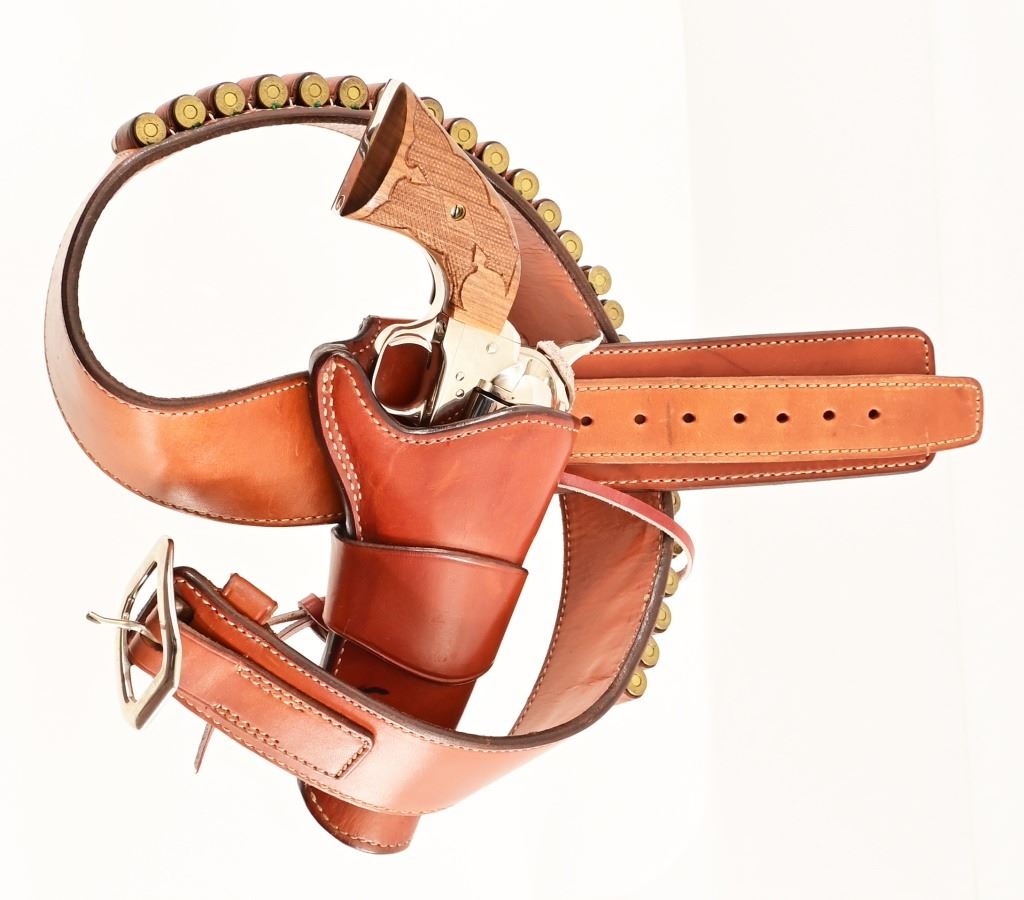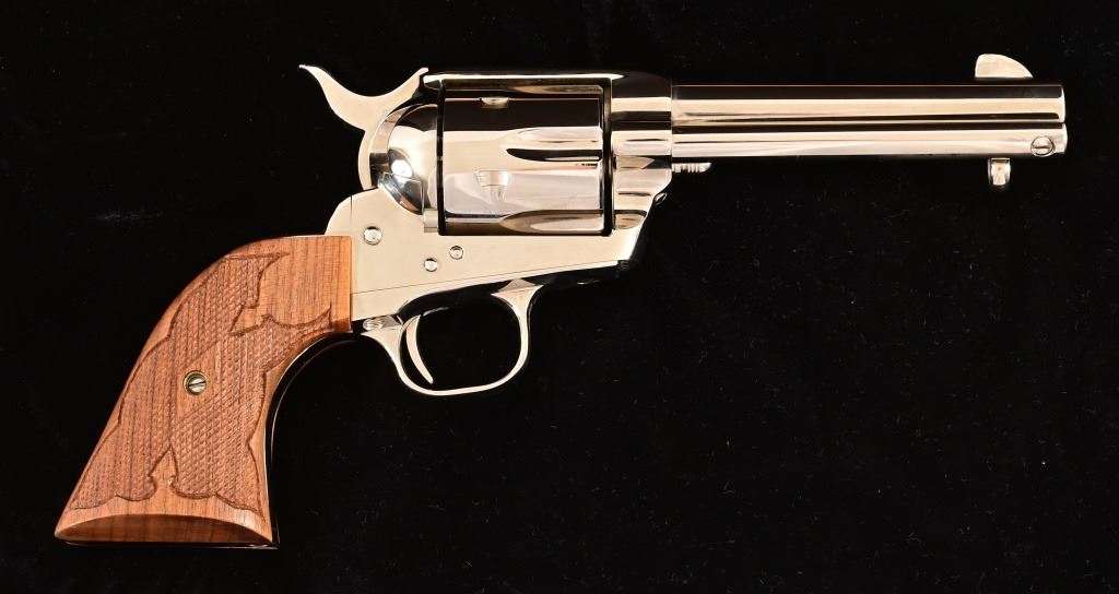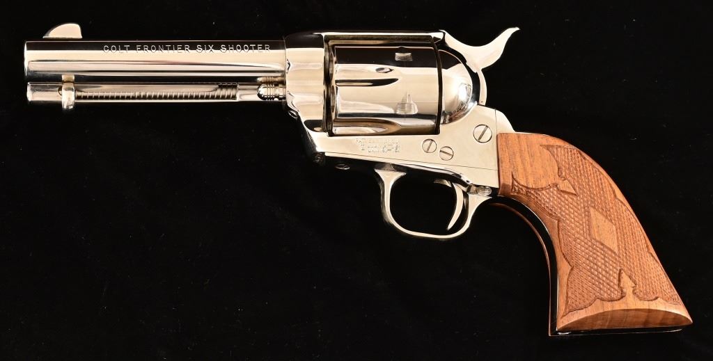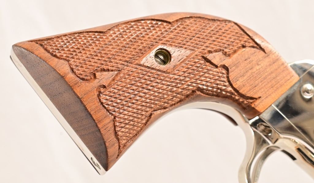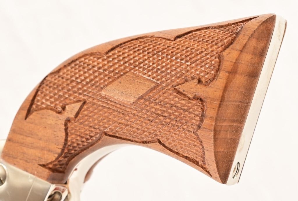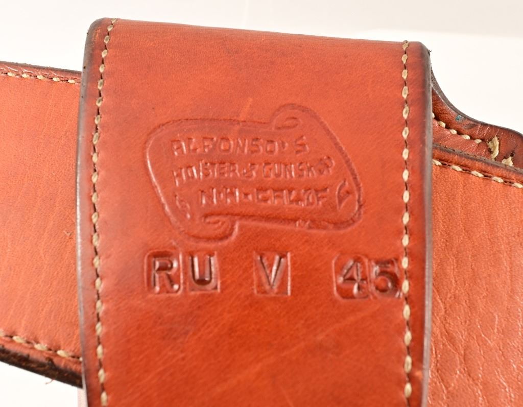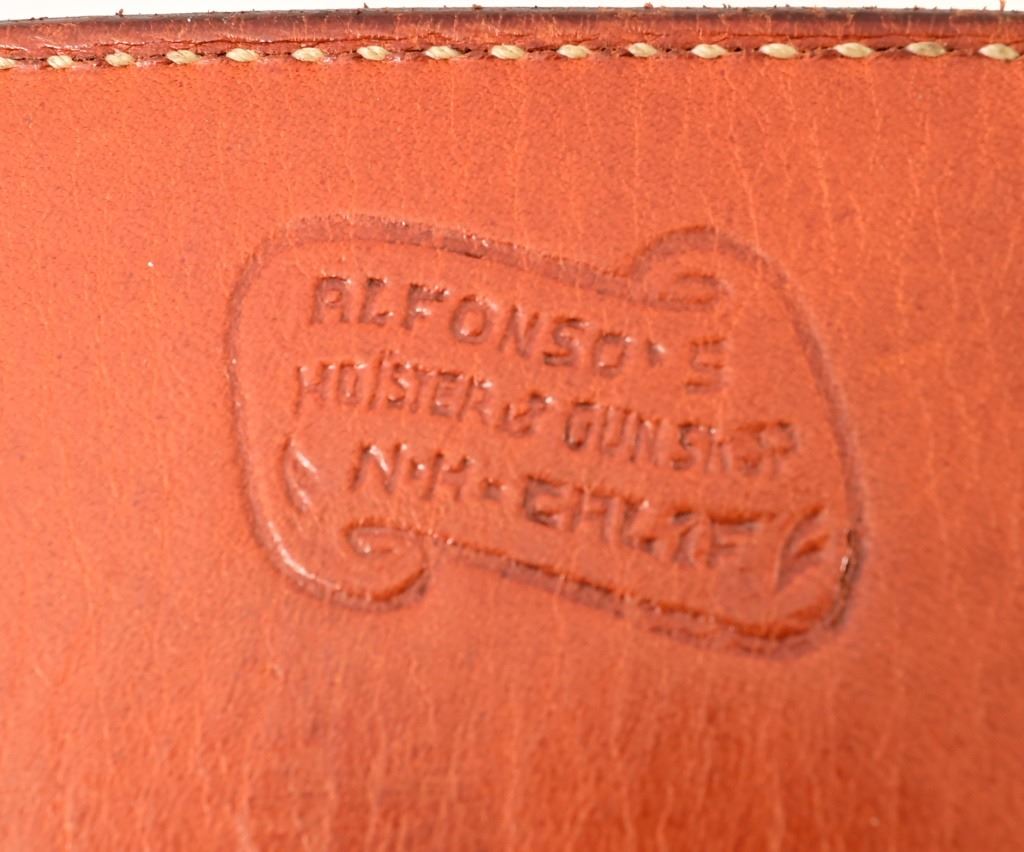 S/N SA67307. 4.5" barrel, nickel plated, with checkered wood grips Holster belt rig marked "Alfonso's Holster & Gun Shop, N.H-Calif"