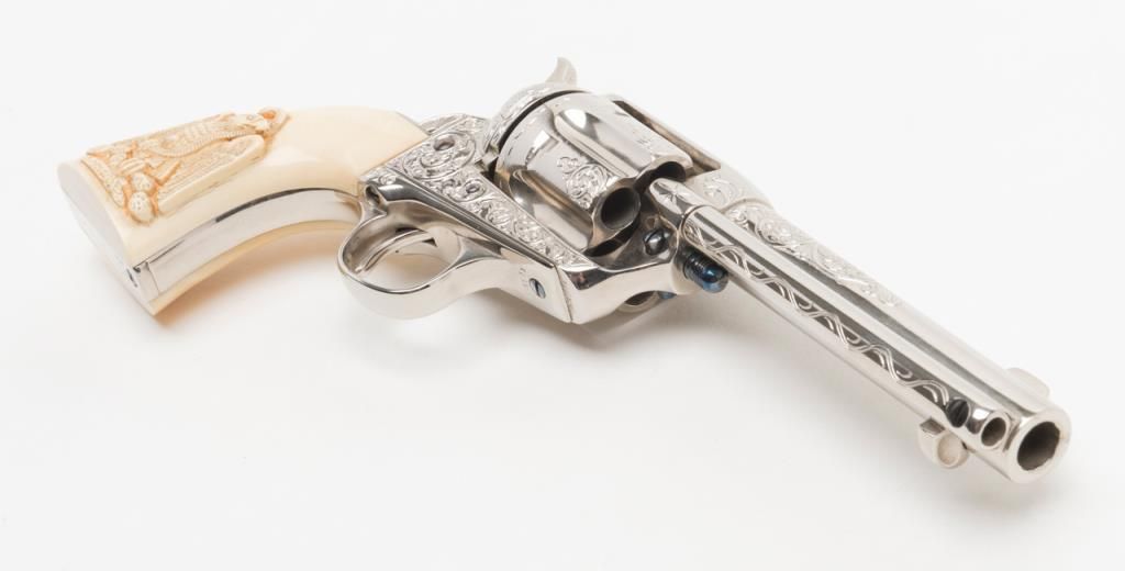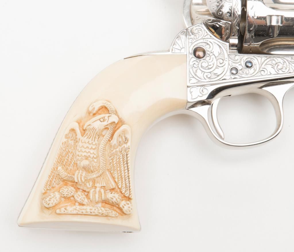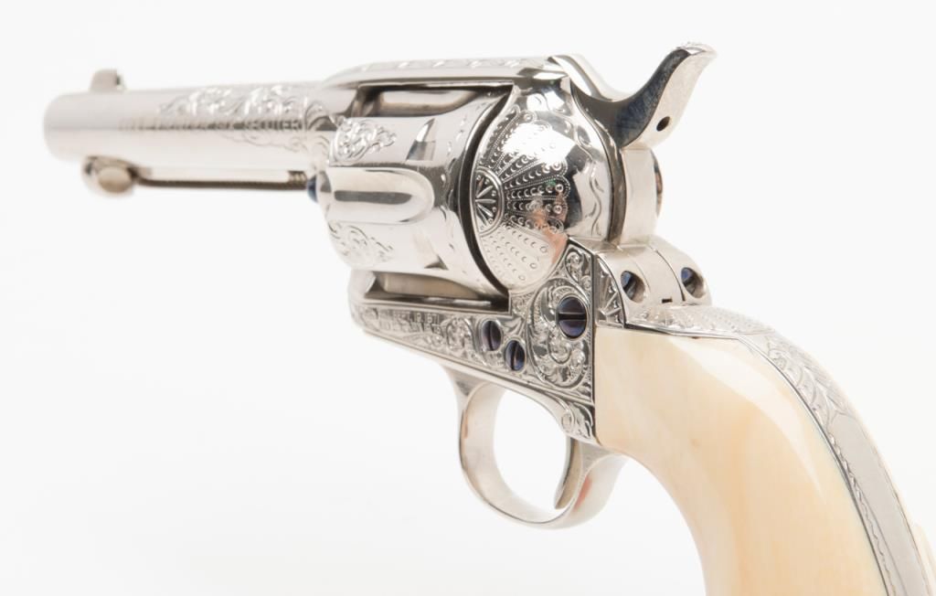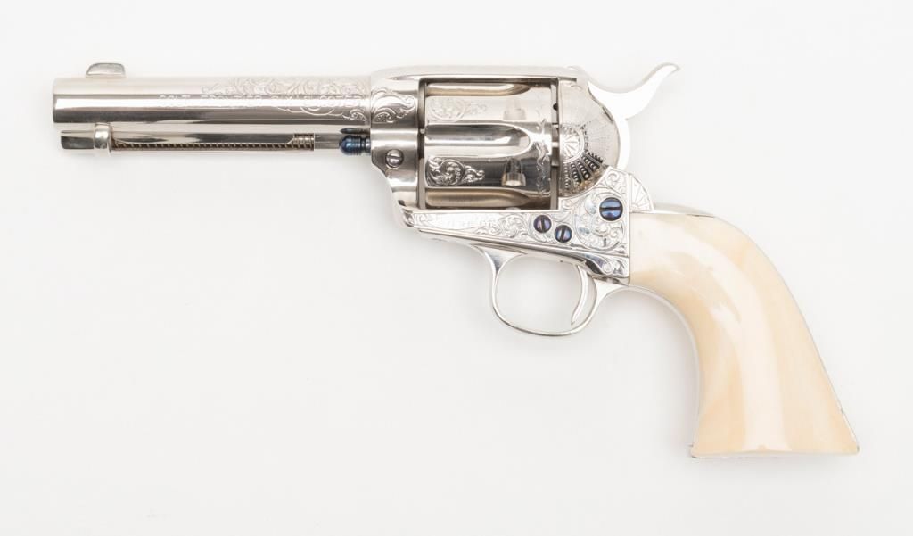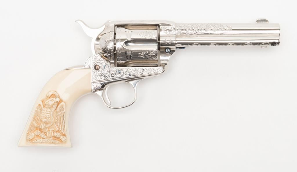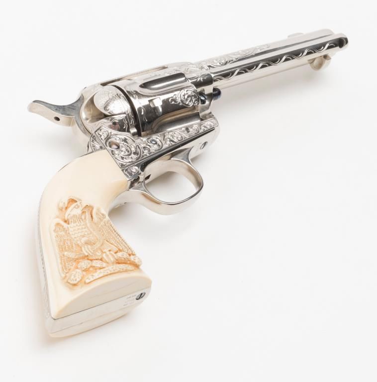 Colt SAA Frontier Six Shooter revolver, .44-40 cal., 4-3/4” barrel, after-market engraving, re-stamped, Mexican carved snake and eagle ivory grips, #178157 in overall very good condition as custom Western scroll engraved and stocked for aSASS shooter some years ago; crisp action, good bore, very good grips, front sight reduced in height; nicely accomplished engraving. (Antique). Est.: $4,000-$8,000.