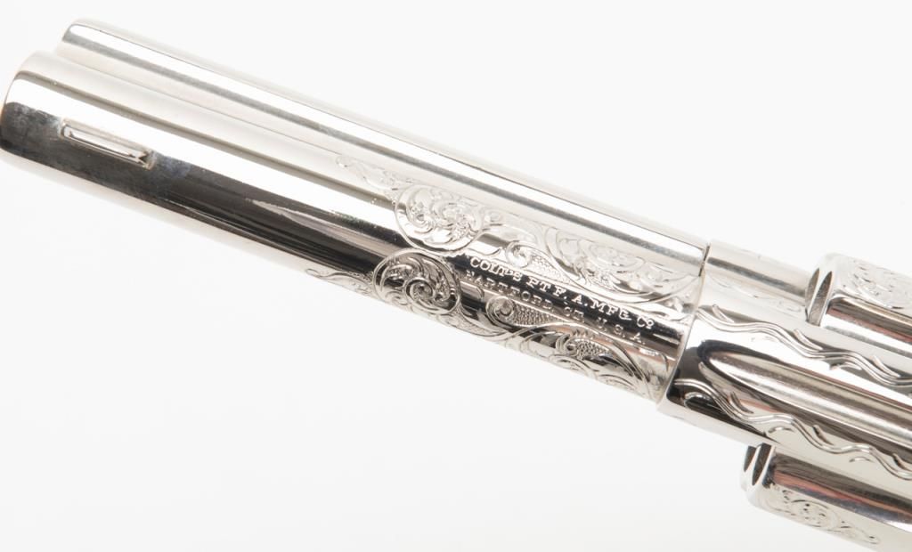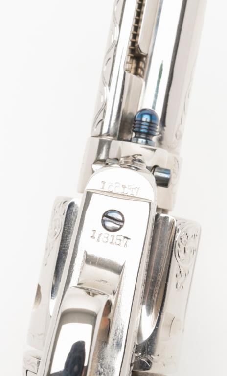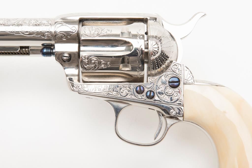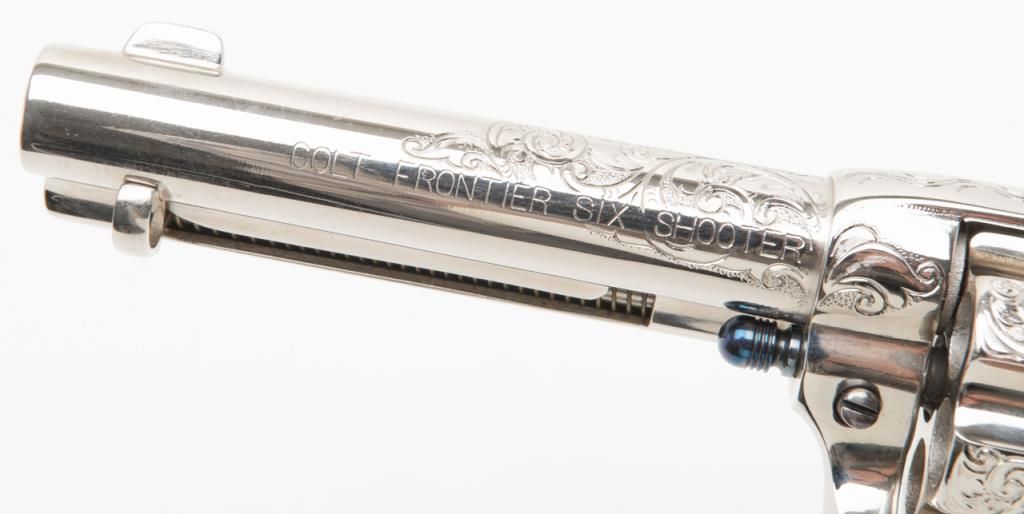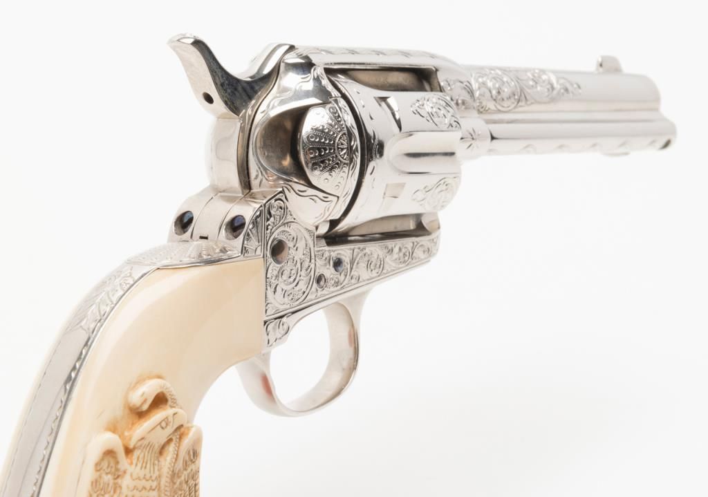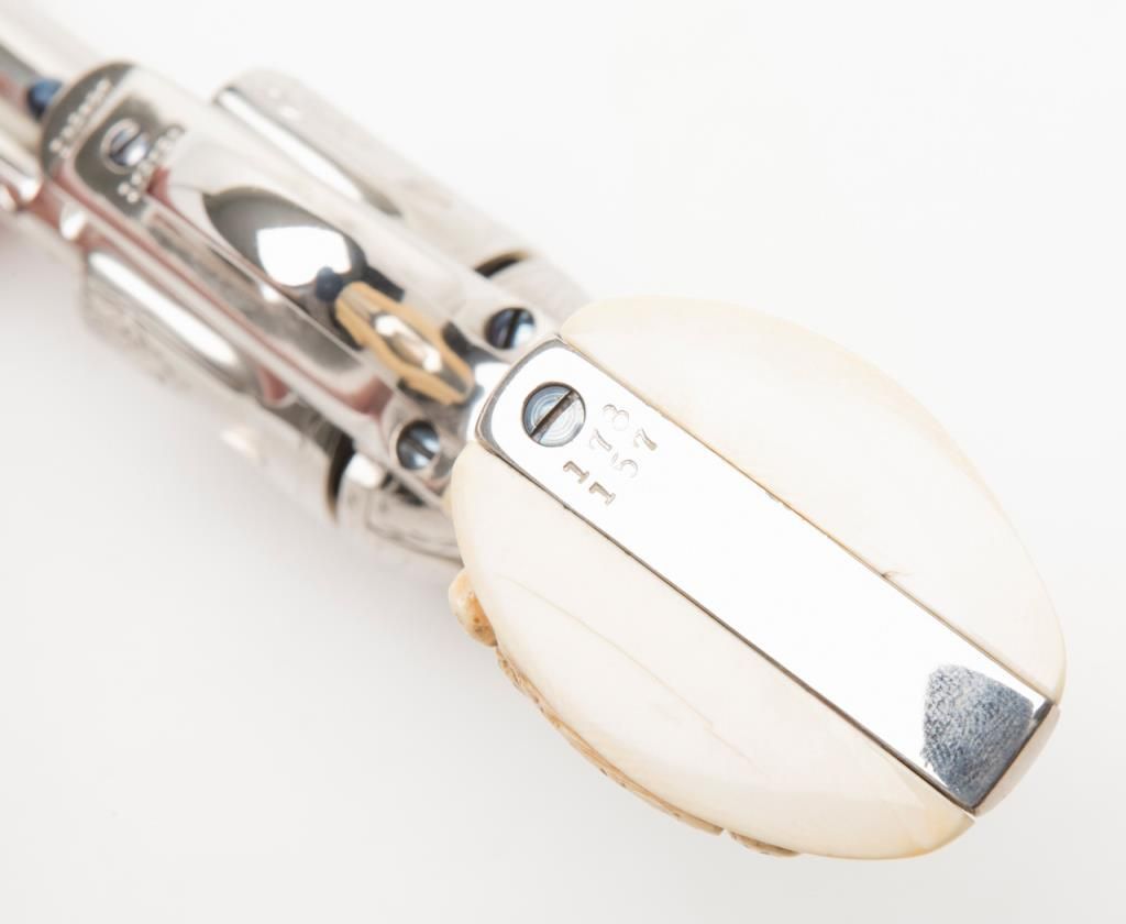 Colt SAA Frontier Six Shooter revolver, .44-40 cal., 4-3/4” barrel, after-market engraving, re-stamped, Mexican carved snake and eagle ivory grips, #178157 in overall very good condition as custom Western scroll engraved and stocked for aSASS shooter some years ago; crisp action, good bore, very good grips, front sight reduced in height; nicely accomplished engraving. (Antique). Est.: $4,000-$8,000.