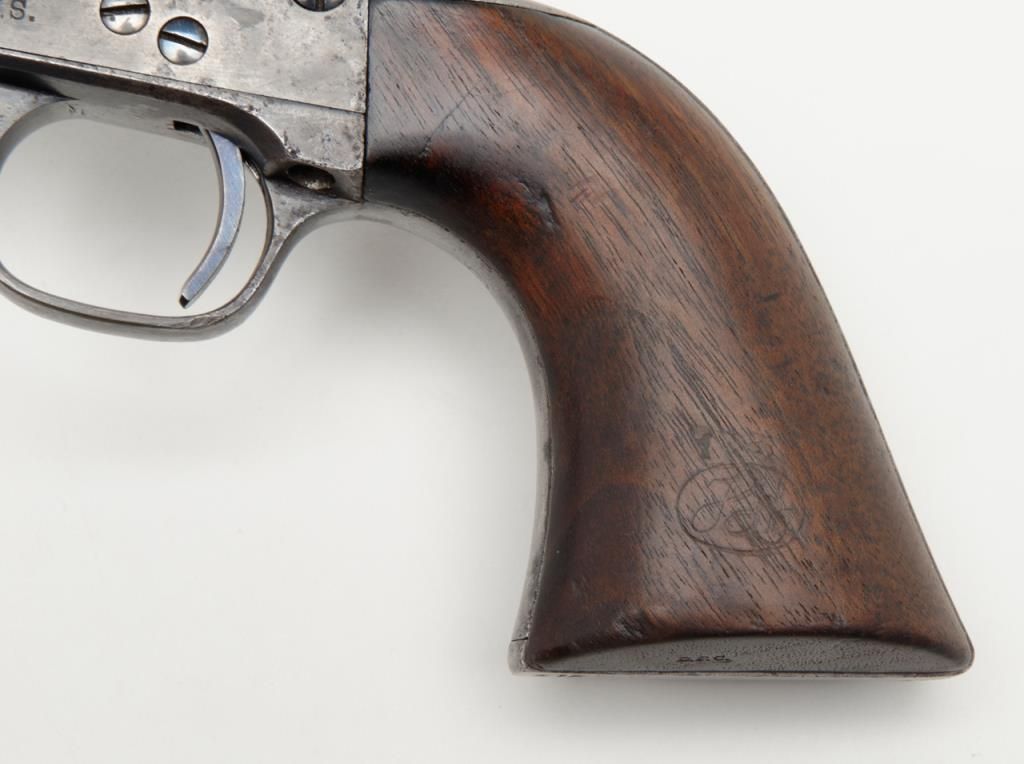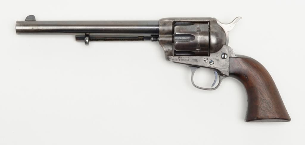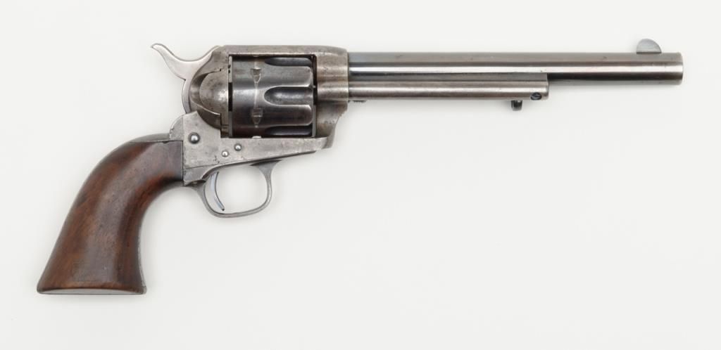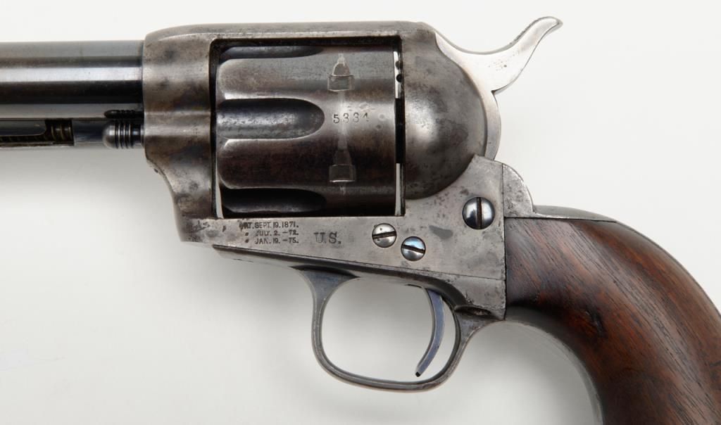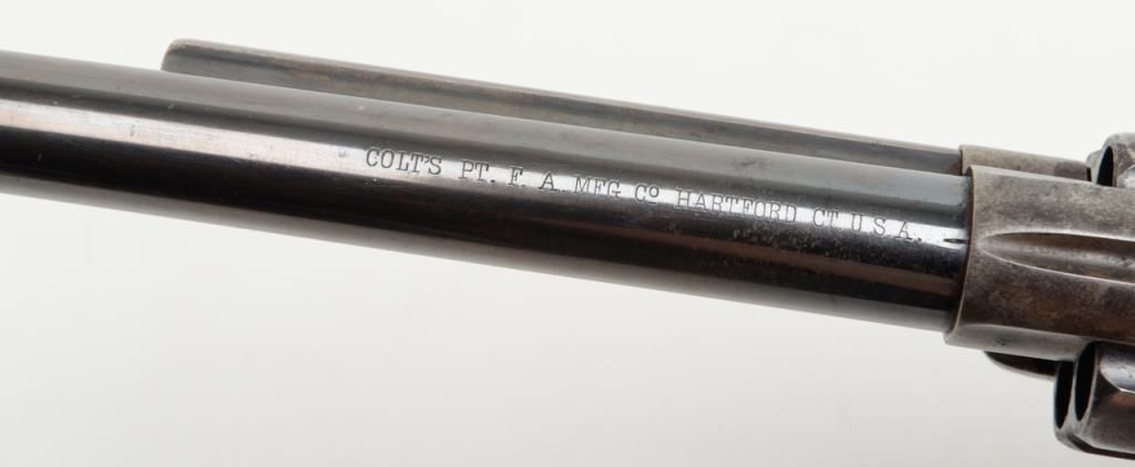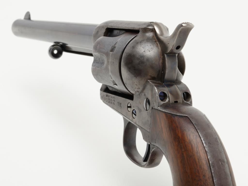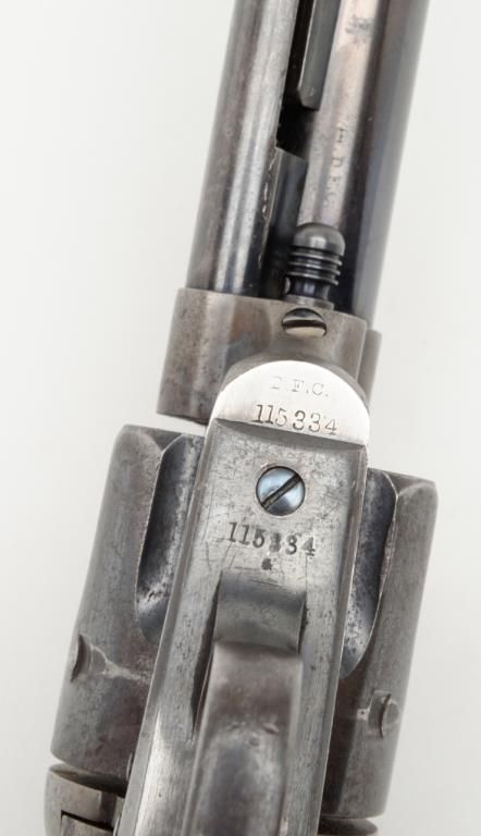 Colt SAA Martially marked U.S. revolver, .45 cal., 7-1/2” barrel, blue and case hardened finish, wood grips, #115334 in overall fine condition showing the majority of its original blue finish on the barrel with some holster wear at themuzzle, majority of its original finish on the cylinder with a drag line, approx. 50% original finish on the ejector rod housing and approx. 30% original blue on the straps; the frame displays approx. 70% of its original case colors with somescattered spots of erosion and pinprick pitting; all matching visible numbers, D.F.C. inspected parts, crisp action, sharp markings, fine bore, very good + grips with D.F.C. inspection on bottom of left grip and D.F.C. cartouche on right gripand F.H., dated 1885on the left grip; accompanied by a factory letter dated June 21, 1994 confirming caliber and finish with barrel length and type of stocks “Not Listed”, sold to the U.S. Government and shipped on Sept. 16, 1885 in a group of 200same type guns. From a respected longtime collector. (Antique). Est.: $7,500-$15,000.