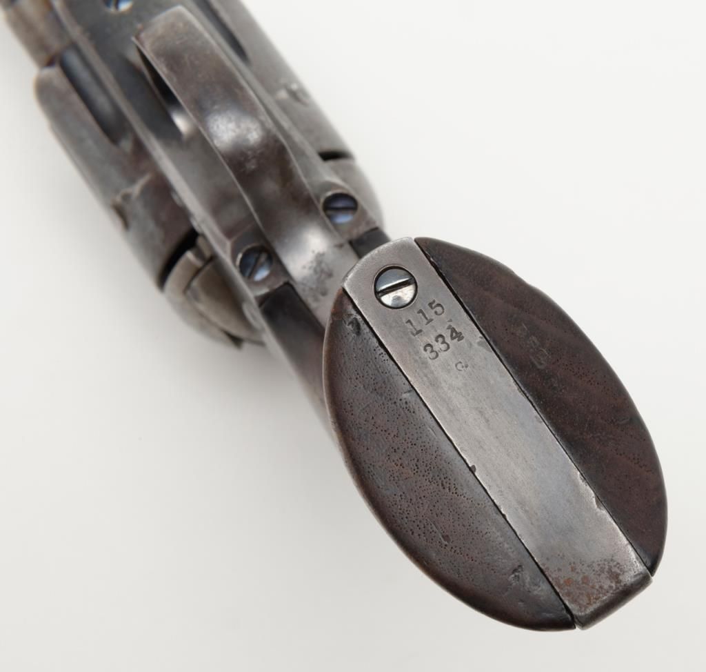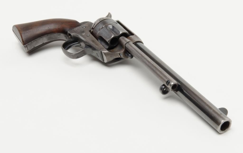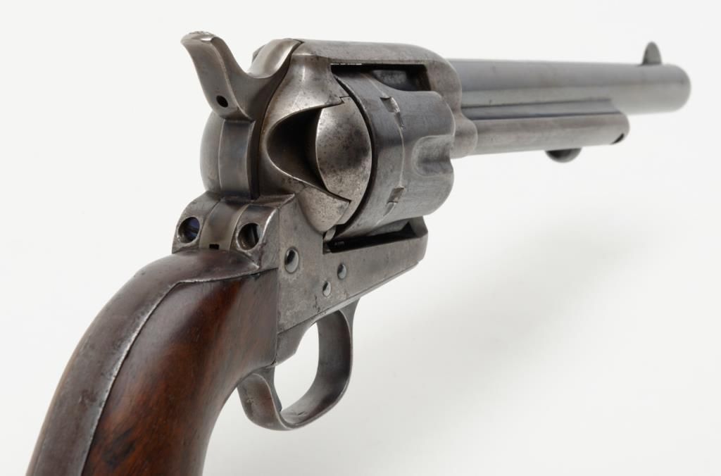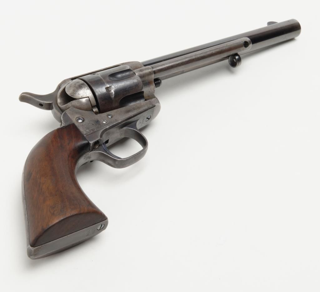 Colt SAA Martially marked U.S. revolver, .45 cal., 7-1/2” barrel, blue and case hardened finish, wood grips, #115334 in overall fine condition showing the majority of its original blue finish on the barrel with some holster wear at themuzzle, majority of its original finish on the cylinder with a drag line, approx. 50% original finish on the ejector rod housing and approx. 30% original blue on the straps; the frame displays approx. 70% of its original case colors with somescattered spots of erosion and pinprick pitting; all matching visible numbers, D.F.C. inspected parts, crisp action, sharp markings, fine bore, very good + grips with D.F.C. inspection on bottom of left grip and D.F.C. cartouche on right gripand F.H., dated 1885on the left grip; accompanied by a factory letter dated June 21, 1994 confirming caliber and finish with barrel length and type of stocks “Not Listed”, sold to the U.S. Government and shipped on Sept. 16, 1885 in a group of 200same type guns. From a respected longtime collector. (Antique). Est.: $7,500-$15,000.